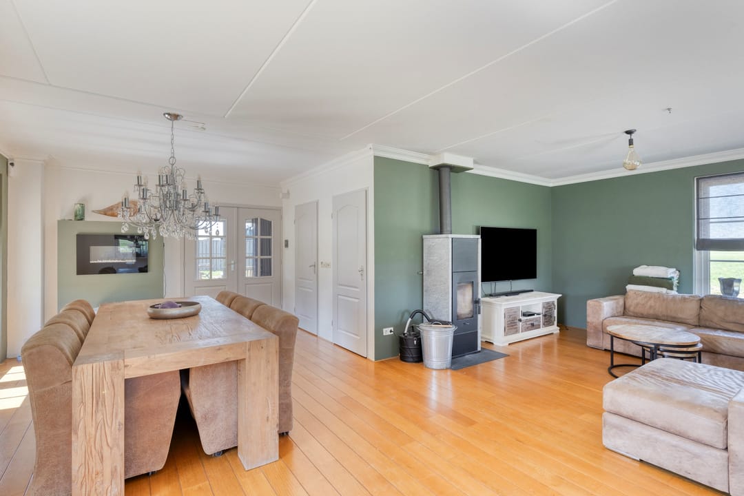 Op de begane grond treft u de entree met toegang tot de woon-/ eetkamer. De woonkamer is voorzien van een houten vloer, een erker en openslaande deuren naar het terras. Er is mogelijkheid voor het plaatsen van een houtkachel. De huidige spekstenen kachel biedt men ter overname aan. Aangrenzend treft u de keuken en de bijkeuken. De bijkeuken, voorzien van CV en aansluitpunten voor wasmachine en droger, heeft een achter entree en directe toegang tot de garage.