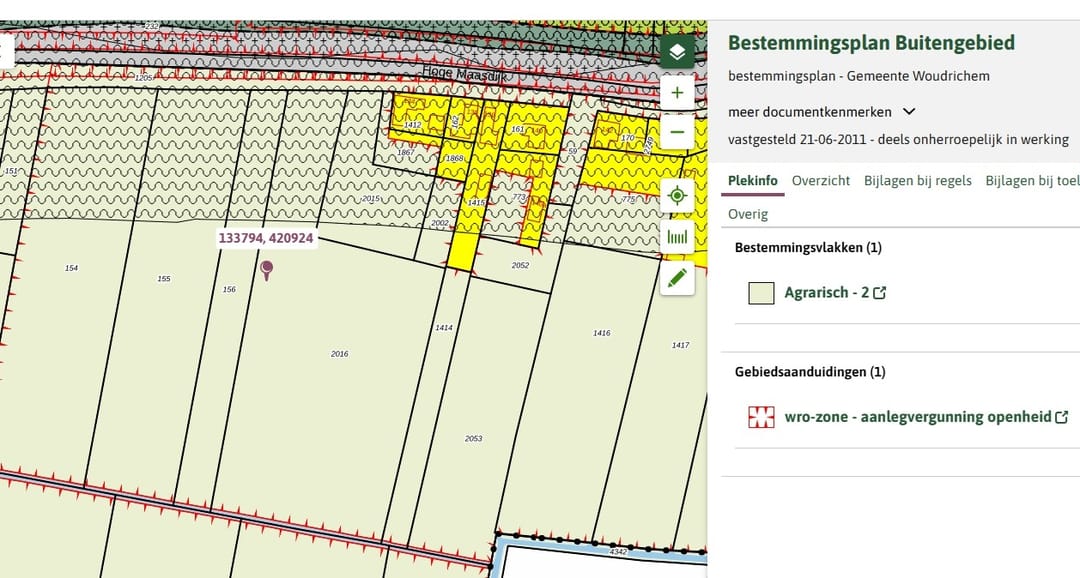 Object is gelegen binnen het Omgevingsplan Gemeente Altena, in werking getreden sinds 12 maart 2024. Op 24 september 2020 is Beheersverordening Altena vastgesteld en vanuit de beheersverordening wordt verwezen naar het bestemmingplan Buitengebied van de gemeente Woudrichem, vastgesteld door de raad van de gemeente Woudrichem d.d. 21 juni 2011.