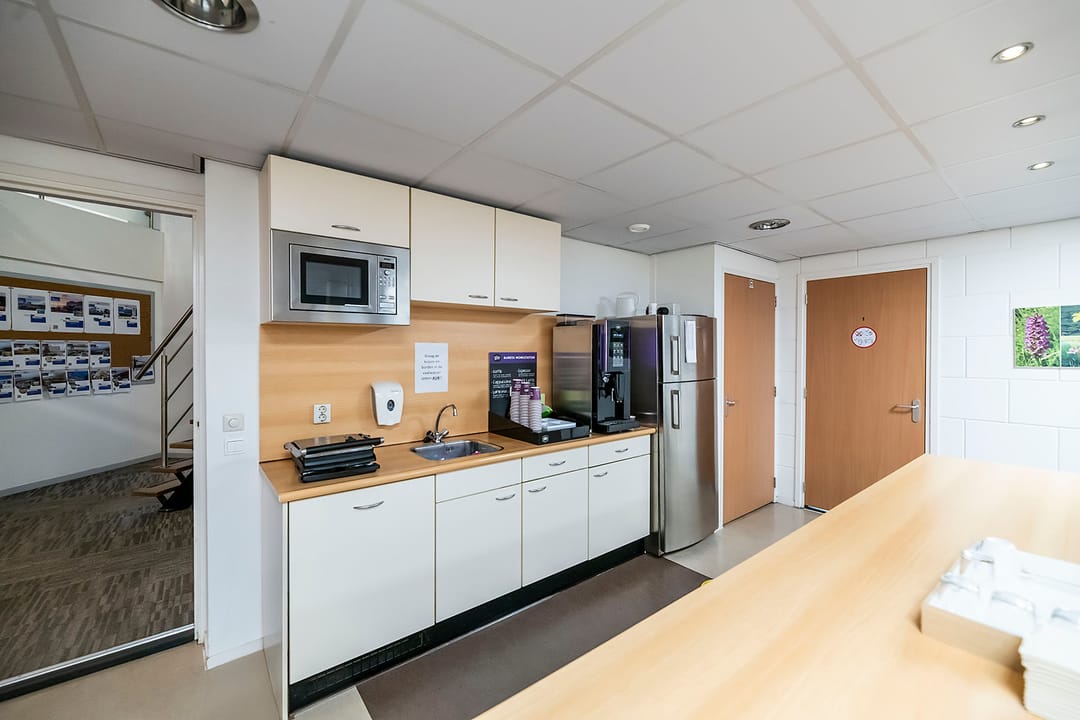 - kantine voorzien van linoleum vloer en keuken met vaatwasser en magnetron;