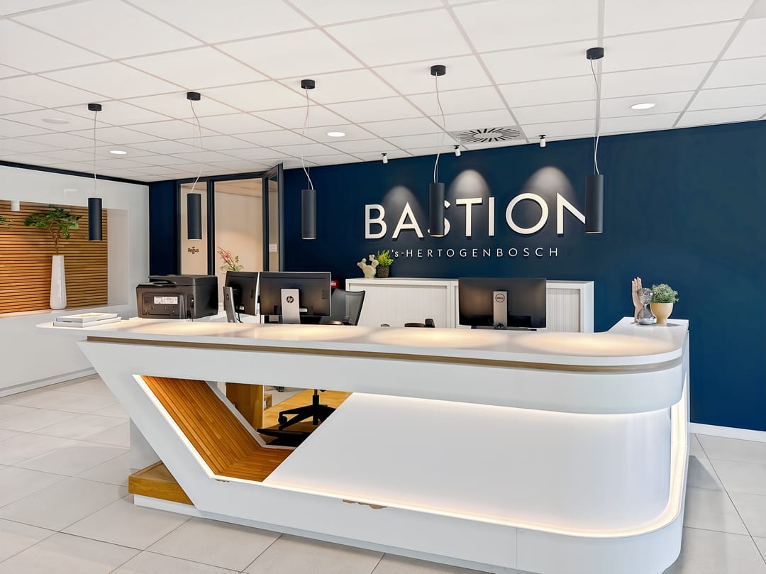 Heet uw gasten welkom in stijlvolle, met hout afgewerkte werkplekken. De hanglampen, unieke kunst en kleurrijke meubels geven Bastion een geheel eigen karakter. Na het werk kunt u bijkomen in het rustige Zuiderpark of in de binnenstad ontspannen bij een van de bruisende cafés en restaurants van de Korenburgstraat.