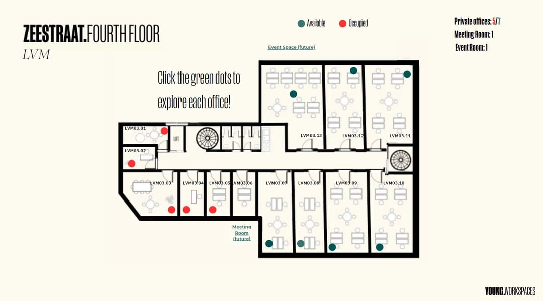 Er zijn diverse kantoorruimtes beschikbaar van 10 m² tot 50 m². Op aanvraag kunnen kantoren worden gecombineerd tot een groter geheel. De huurvoorwaarden zijn flexibel en de ruimtes zijn eventueel gemeubileerd beschikbaar tegen meerprijs.