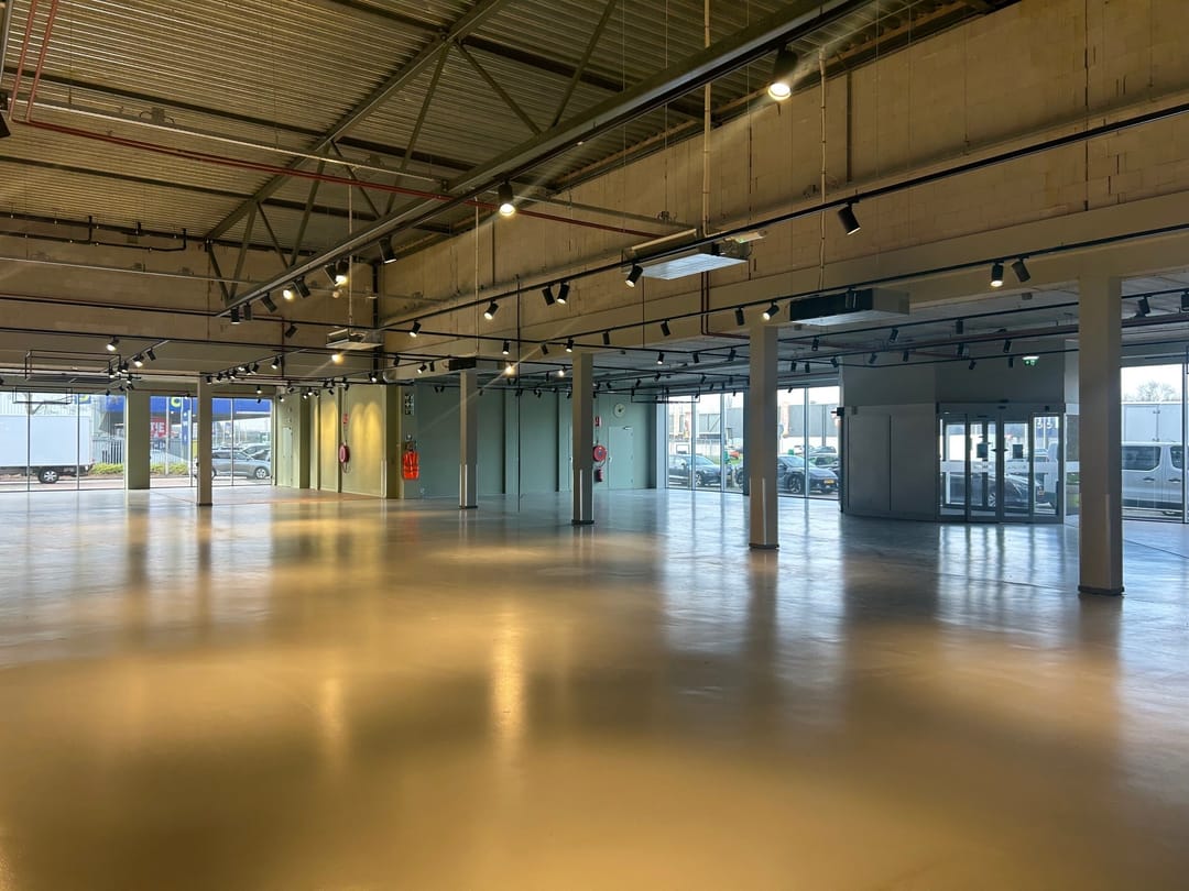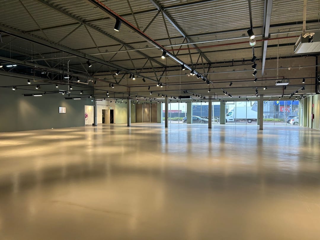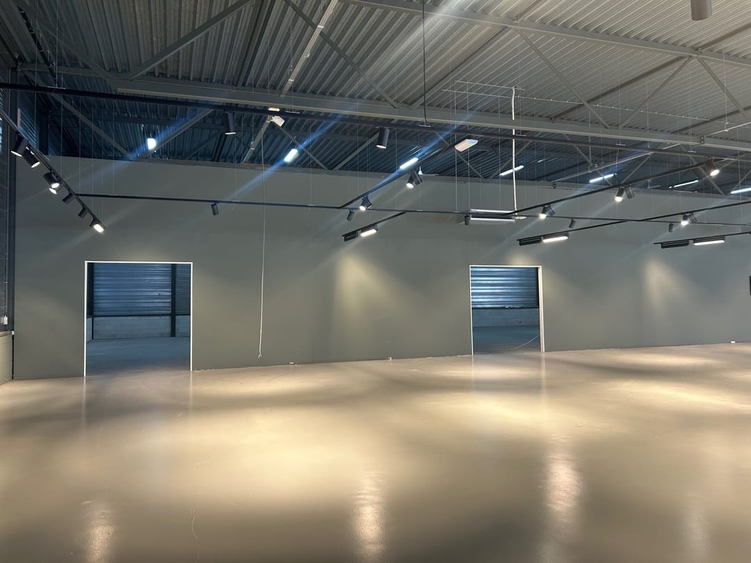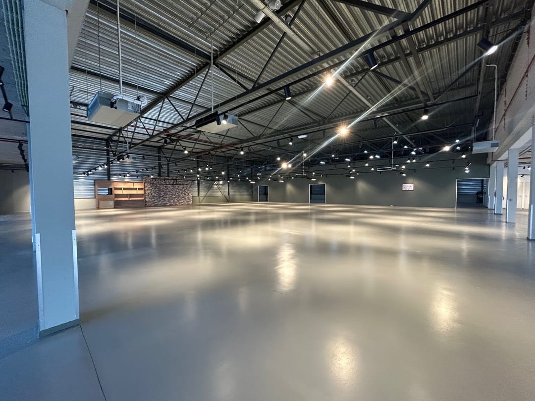 Wanneer je de ruimte binnenkomt, valt direct de ruime opzet en het hoge afwerkingsniveau op. De vloeren zijn professioneel geëgaliseerd — strakker krijg je ze tegenwoordig niet. Dergelijke gladde vloeren zijn ideaal voor flexibele indelingen, heavy duty toepassingen of groot materieel. Je loopt nooit te zwoegen met zware spullen; alles rolt moeiteloos over het oppervlak.