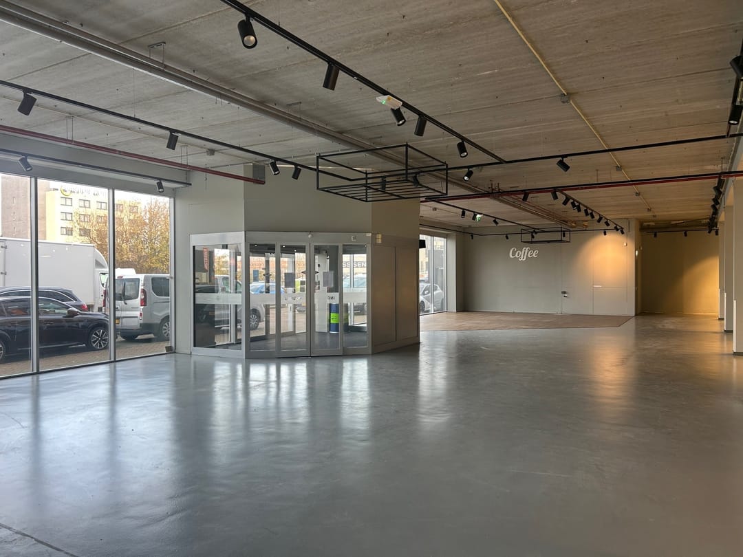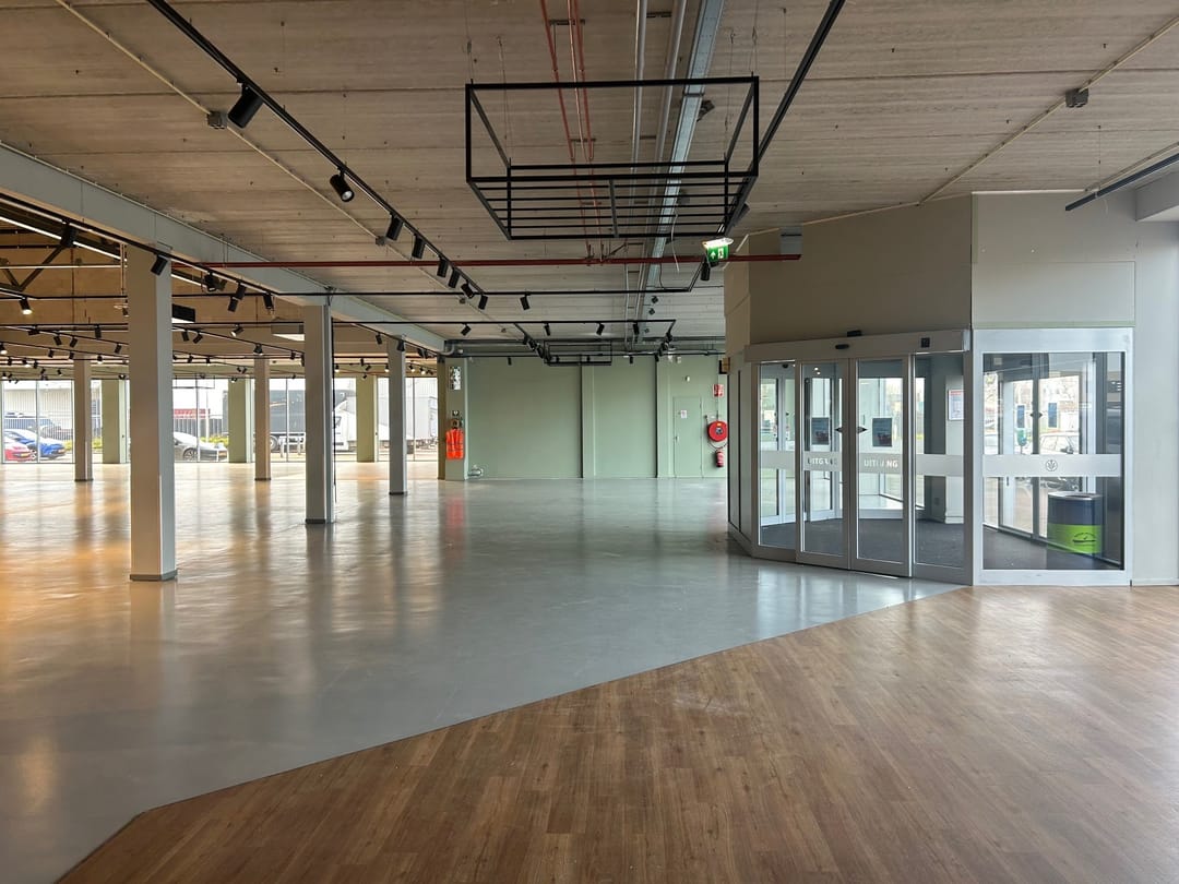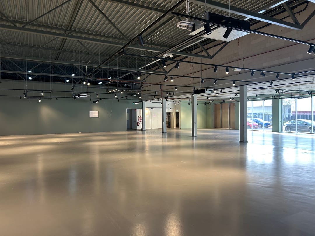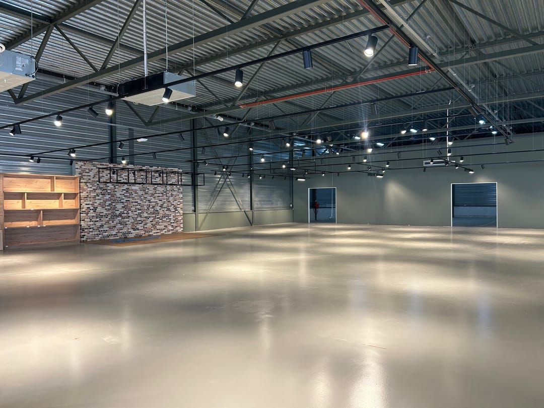 Wanneer je de ruimte binnenkomt, valt direct de ruime opzet en het hoge afwerkingsniveau op. De vloeren zijn professioneel geëgaliseerd — strakker krijg je ze tegenwoordig niet. Dergelijke gladde vloeren zijn ideaal voor flexibele indelingen, heavy duty toepassingen of groot materieel. Je loopt nooit te zwoegen met zware spullen; alles rolt moeiteloos over het oppervlak.