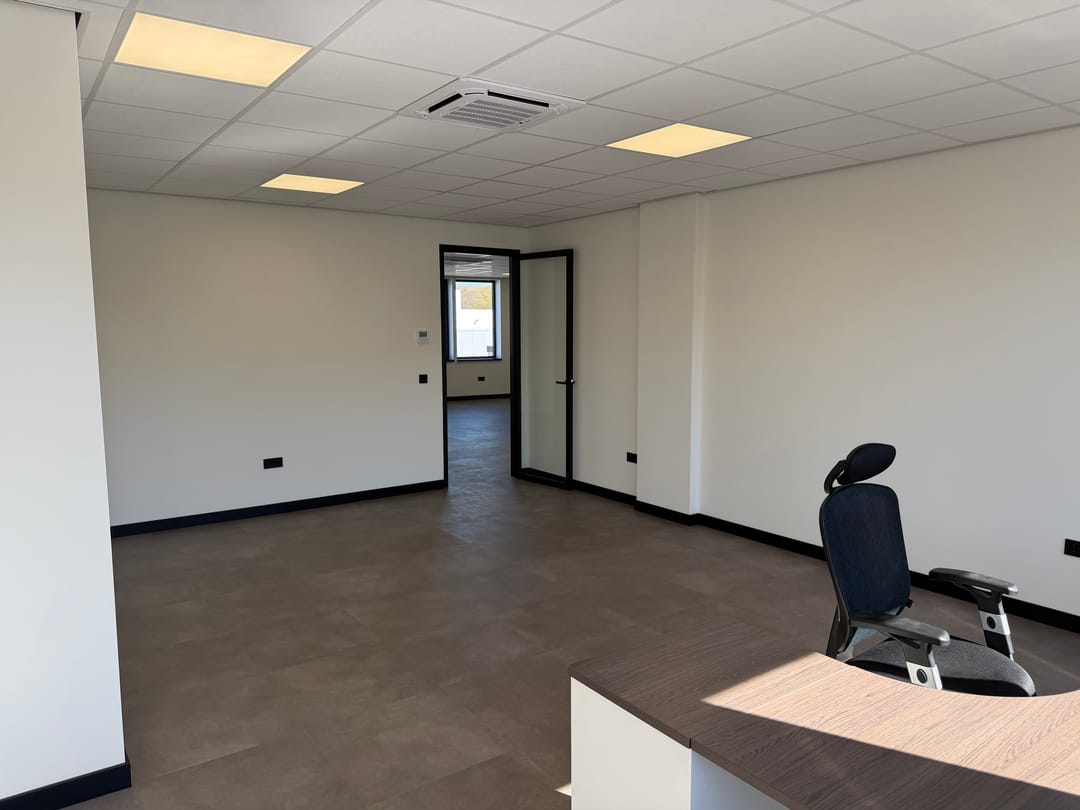 De eerste verdieping wordt bereikt via de trap en wordt voorzien van een grote kantoorruimte, twee kleinere kantoorruimtes, pantry en toilet.