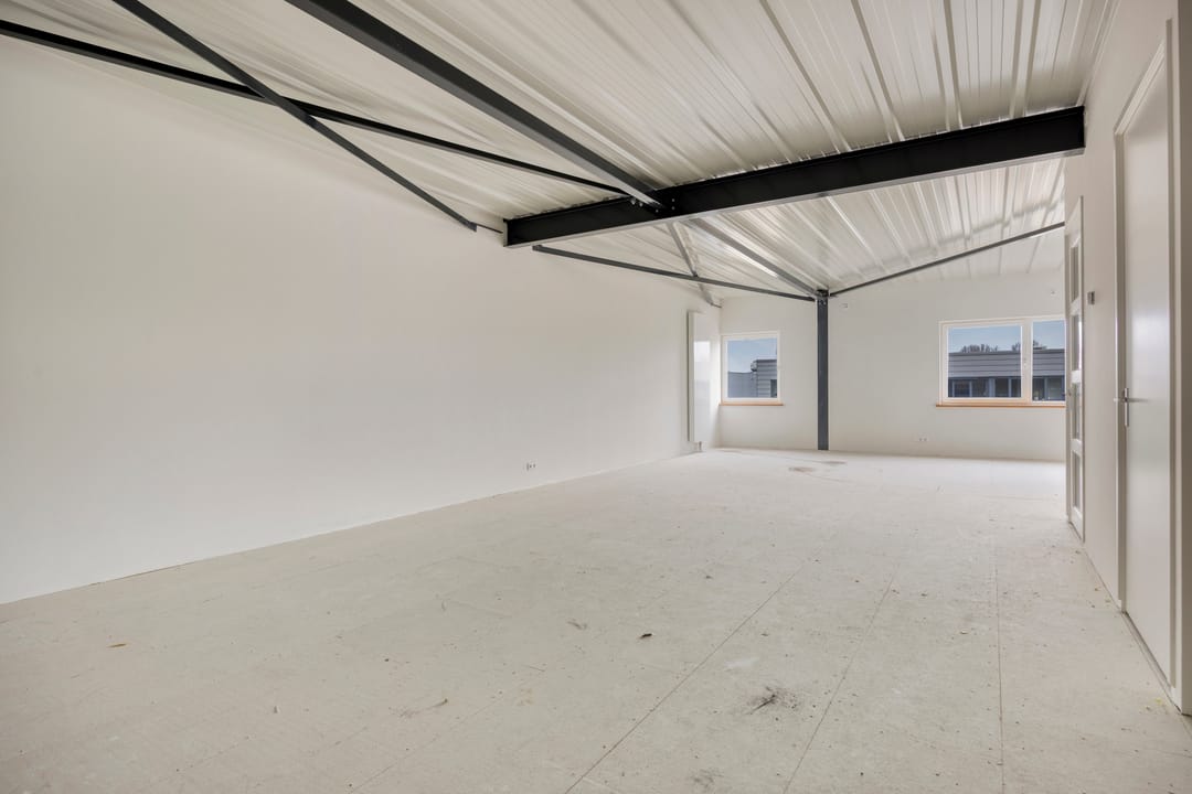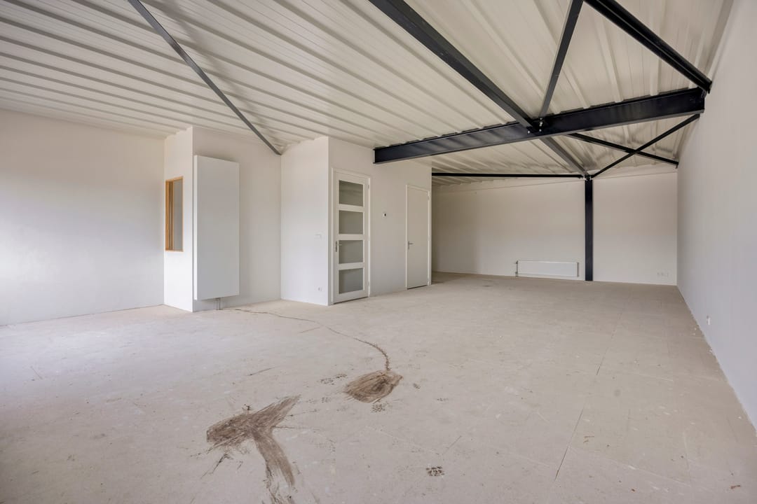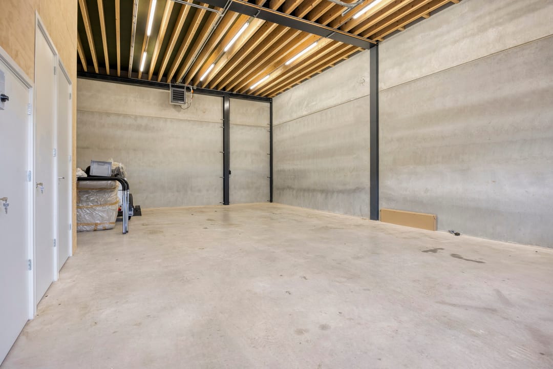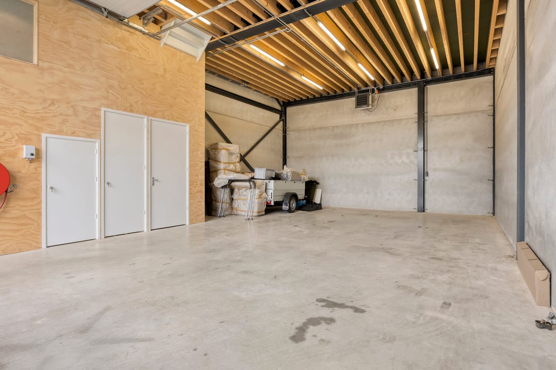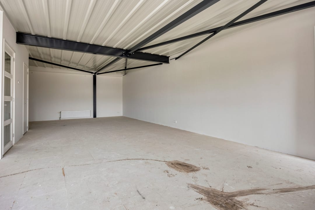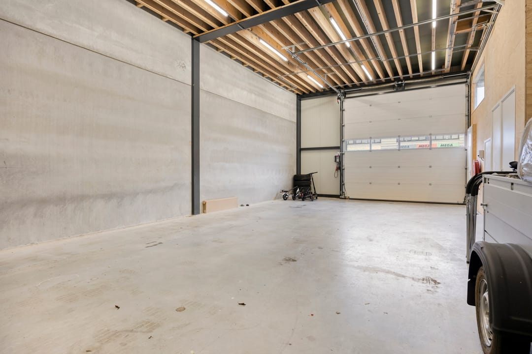 - Overheaddeuren, krachtstroom, betonvloer, heater, toilet en te openen ramen