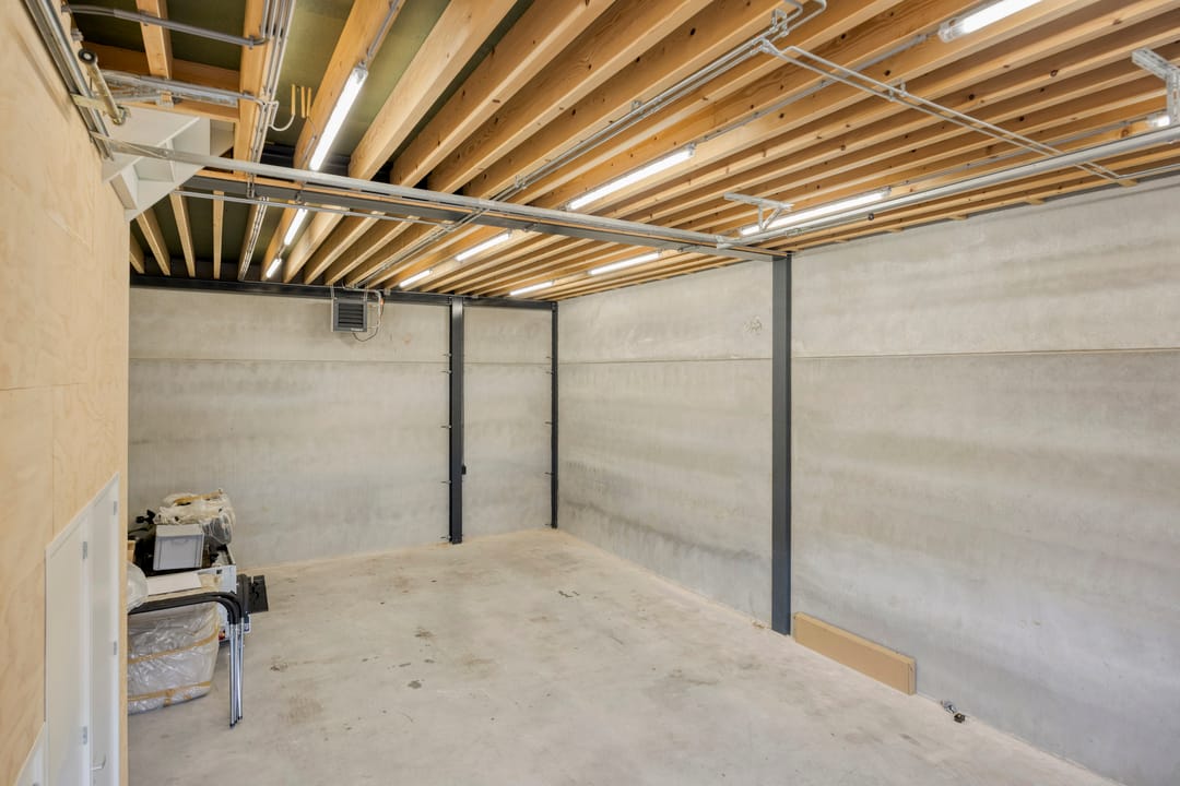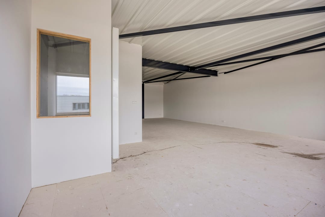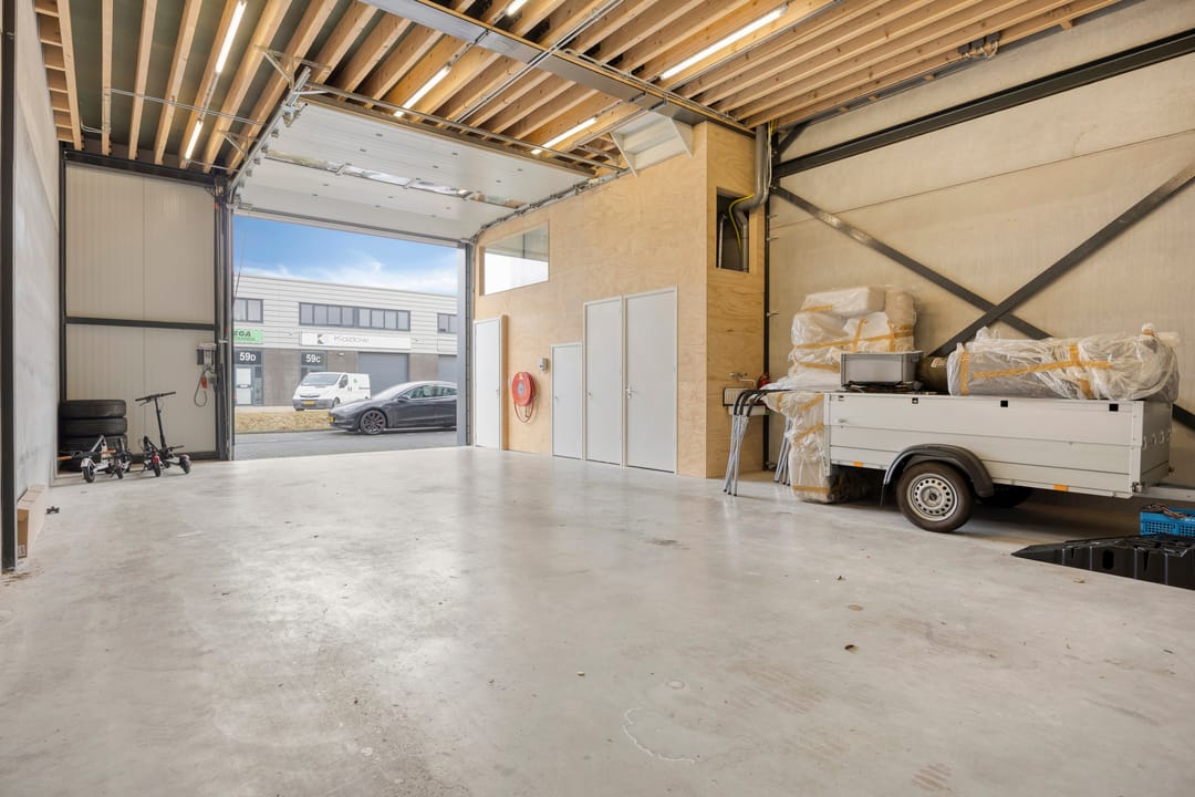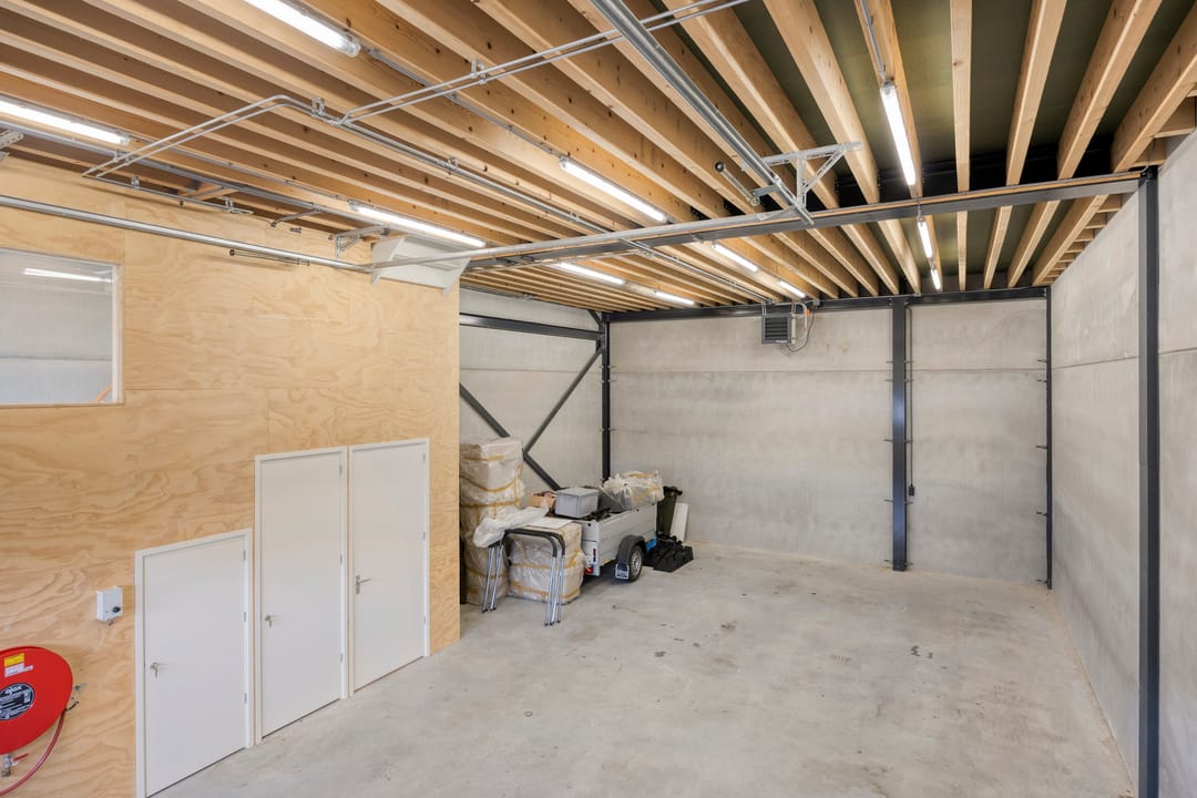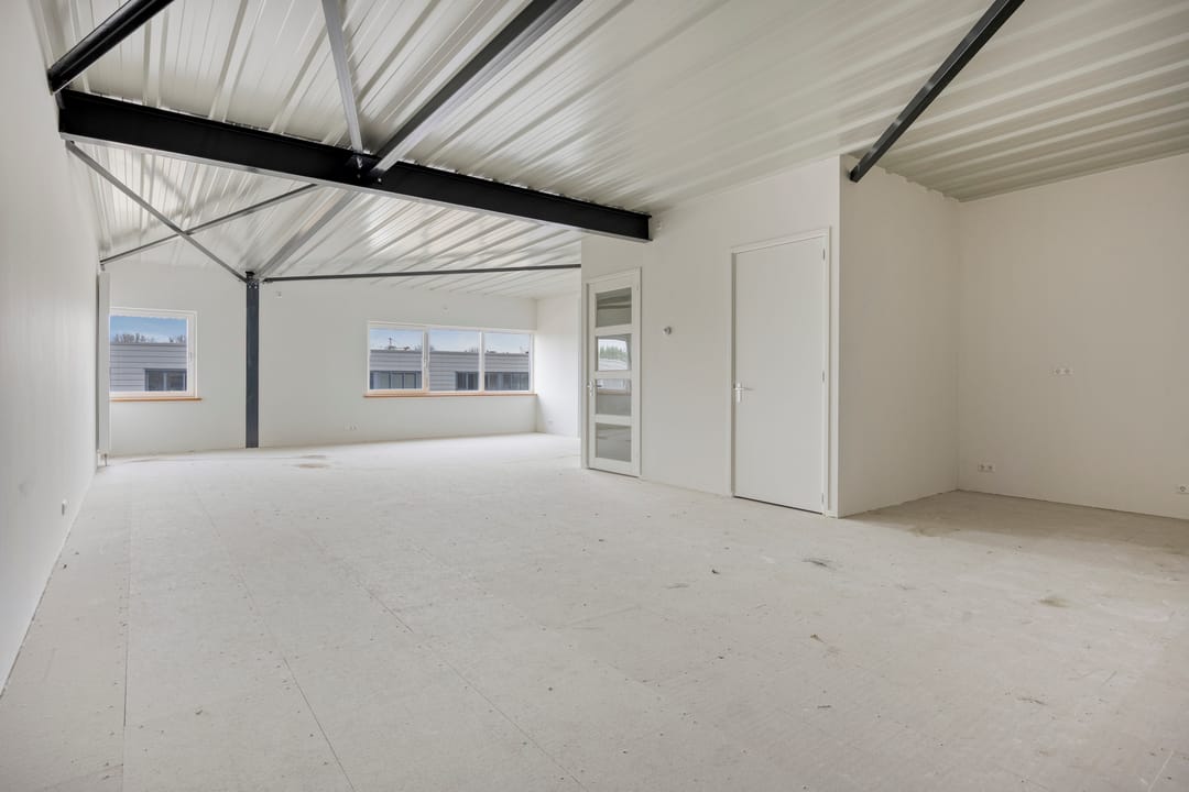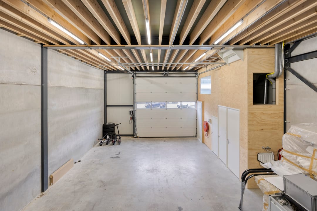 - Overheaddeuren, krachtstroom, betonvloer, heater, toilet en te openen ramen