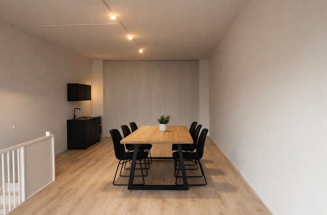 1e verdieping: ruime bedrijfs/kantoorruimte van 13 x 5 meter. Met zwart keukenblok, inbouwstopcontacten en gestucte wanden.