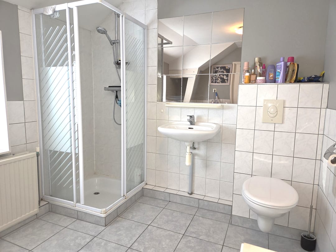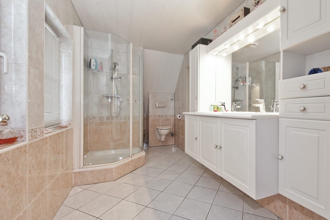 Eerste verdieping: overloop, ruime 2e slaapkamer (ca. 4.90x4.00m) met vaste kasten, 3e slaapkamer (ca. 2.90x4.15m) en badkamer (ca. 4.70x2.00m) voorzien van douche, wastafelmeubel met dubbele wastafel, 2e toilet, ligbad en vaste kast met c.v.-installatie.