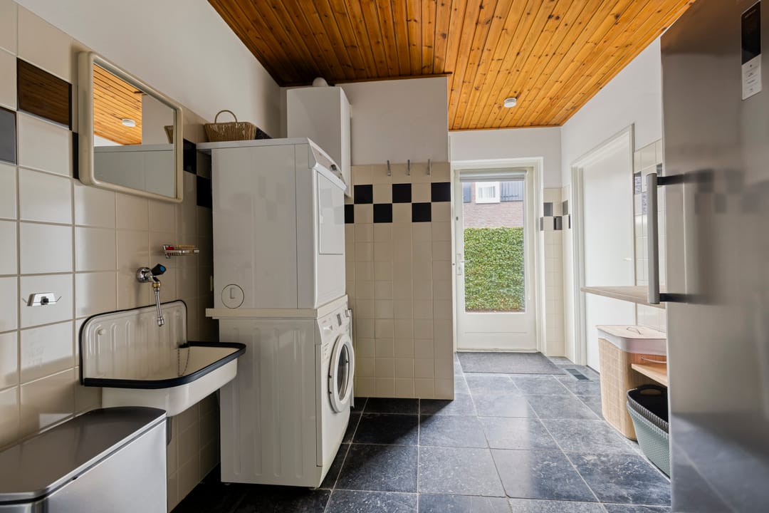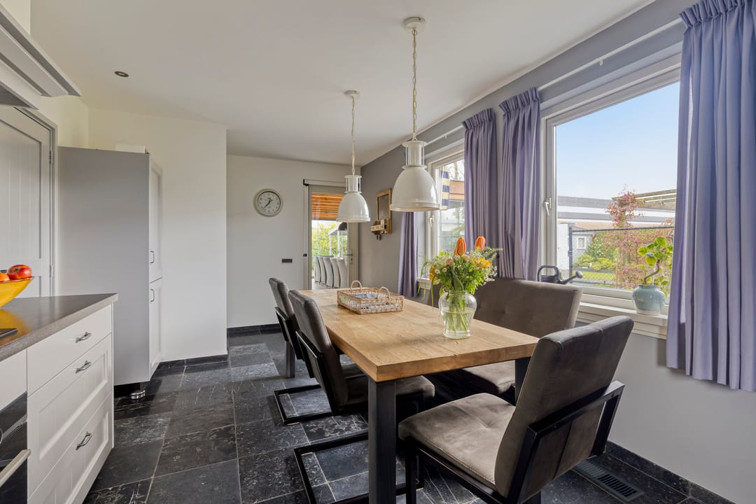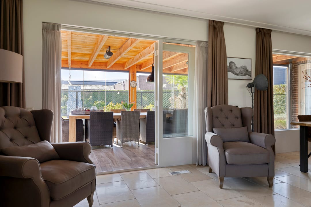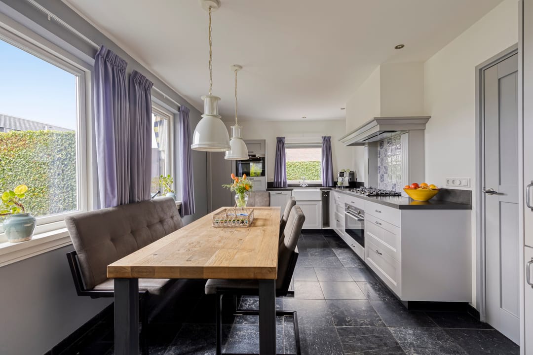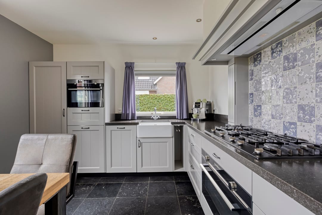 De voortuin biedt een prettige afstand tot de straat wat zorgt voor extra privacy. Entree in de ruime hal met een mooie, hoge vide, trapopgang, garderobe, meterkast en de toiletruimte. Ook is er toegang tot de werkkamer aan de straatzijde. De woonkamer is royaal opgezet, heeft een fijn licht karakter door de grote raampartijen en een sfeervolle pallet kachel. Openslaande deuren leiden naar de prachtige serre. Een heerlijke extra leefruimte met grote glazen schuifpanelen aan drie zijden, waardoor binnen en buiten naadloos in elkaar overlopen. Dankzij de plafondheaters is dit een plek om het hele jaar door van te genieten. De leefkeuken staat in open verbinding met de woonkamer en heeft een licht hoekmeubel in landelijke stijl met alle benodigde inbouwapparatuur en voldoende ruimte voor een tweede eethoek. Via de keuken bereik je zowel de serre, als de bijkeuken. Hier tref je de aansluitingen voor de wasapparatuur, de unit voor de luchtverwarming, CV-ketel, vaste kasten en een gootsteen. De bijkeuken is eveneens bereikbaar vanuit de werkkamer en de oprit.
