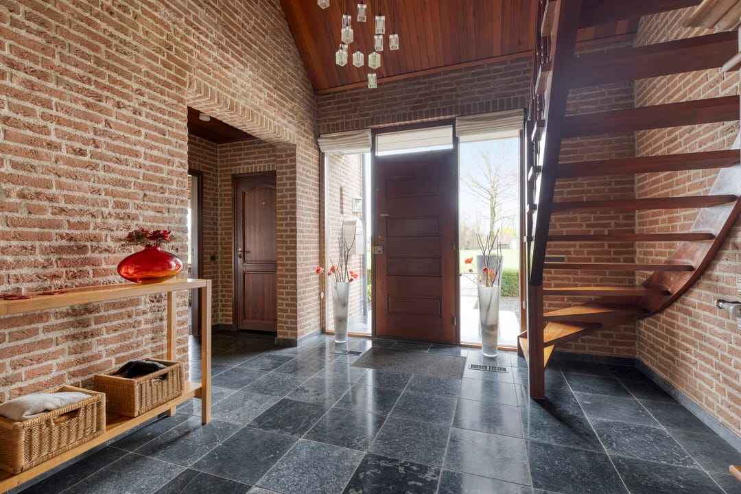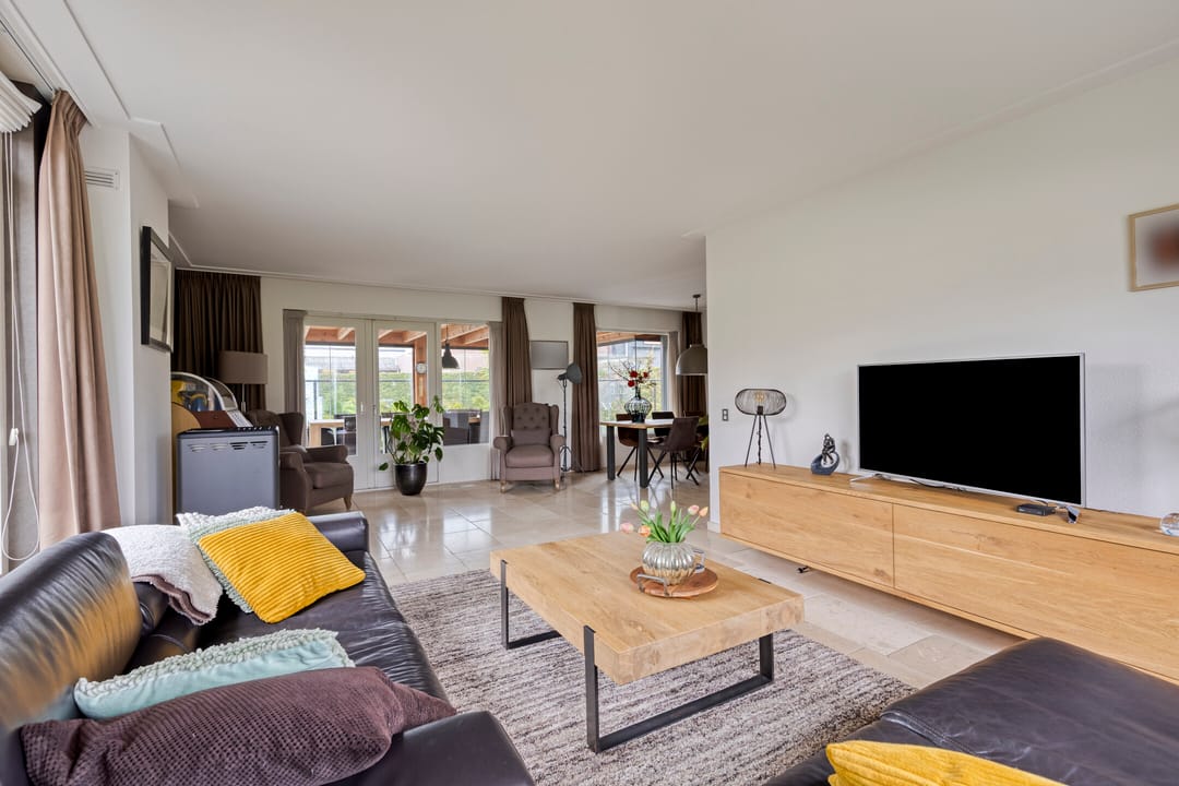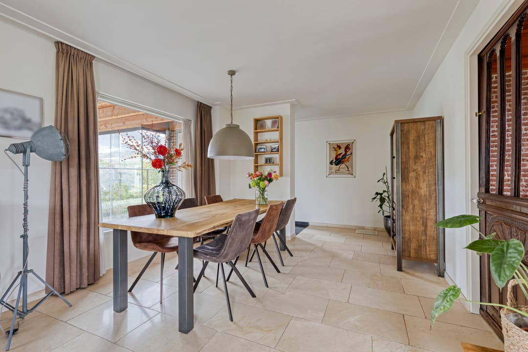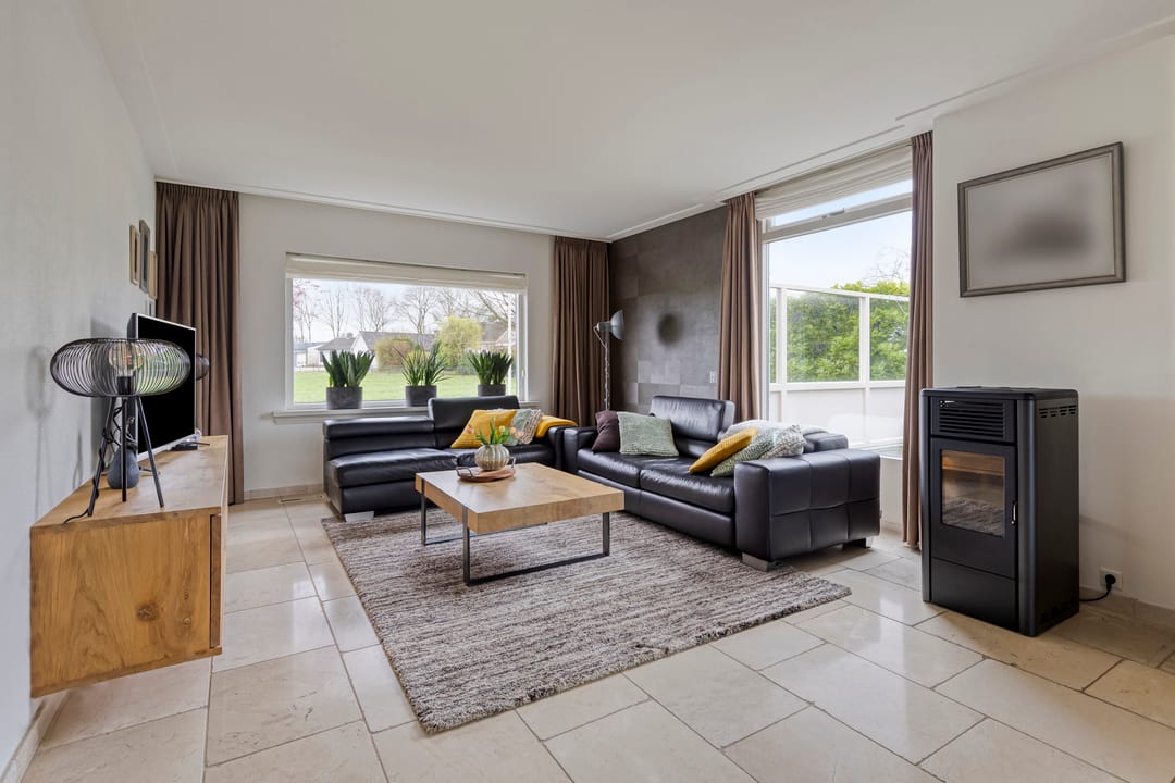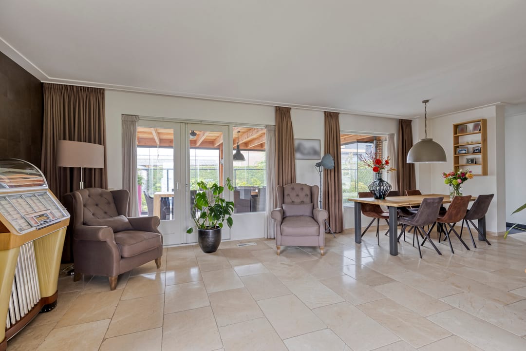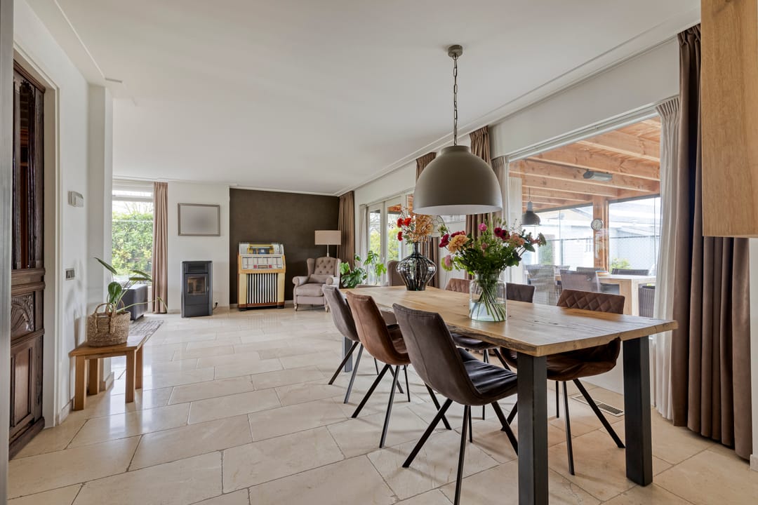 De voortuin biedt een prettige afstand tot de straat wat zorgt voor extra privacy. Entree in de ruime hal met een mooie, hoge vide, trapopgang, garderobe, meterkast en de toiletruimte. Ook is er toegang tot de werkkamer aan de straatzijde. De woonkamer is royaal opgezet, heeft een fijn licht karakter door de grote raampartijen en een sfeervolle pallet kachel. Openslaande deuren leiden naar de prachtige serre. Een heerlijke extra leefruimte met grote glazen schuifpanelen aan drie zijden, waardoor binnen en buiten naadloos in elkaar overlopen. Dankzij de plafondheaters is dit een plek om het hele jaar door van te genieten. De leefkeuken staat in open verbinding met de woonkamer en heeft een licht hoekmeubel in landelijke stijl met alle benodigde inbouwapparatuur en voldoende ruimte voor een tweede eethoek. Via de keuken bereik je zowel de serre, als de bijkeuken. Hier tref je de aansluitingen voor de wasapparatuur, de unit voor de luchtverwarming, CV-ketel, vaste kasten en een gootsteen. De bijkeuken is eveneens bereikbaar vanuit de werkkamer en de oprit.