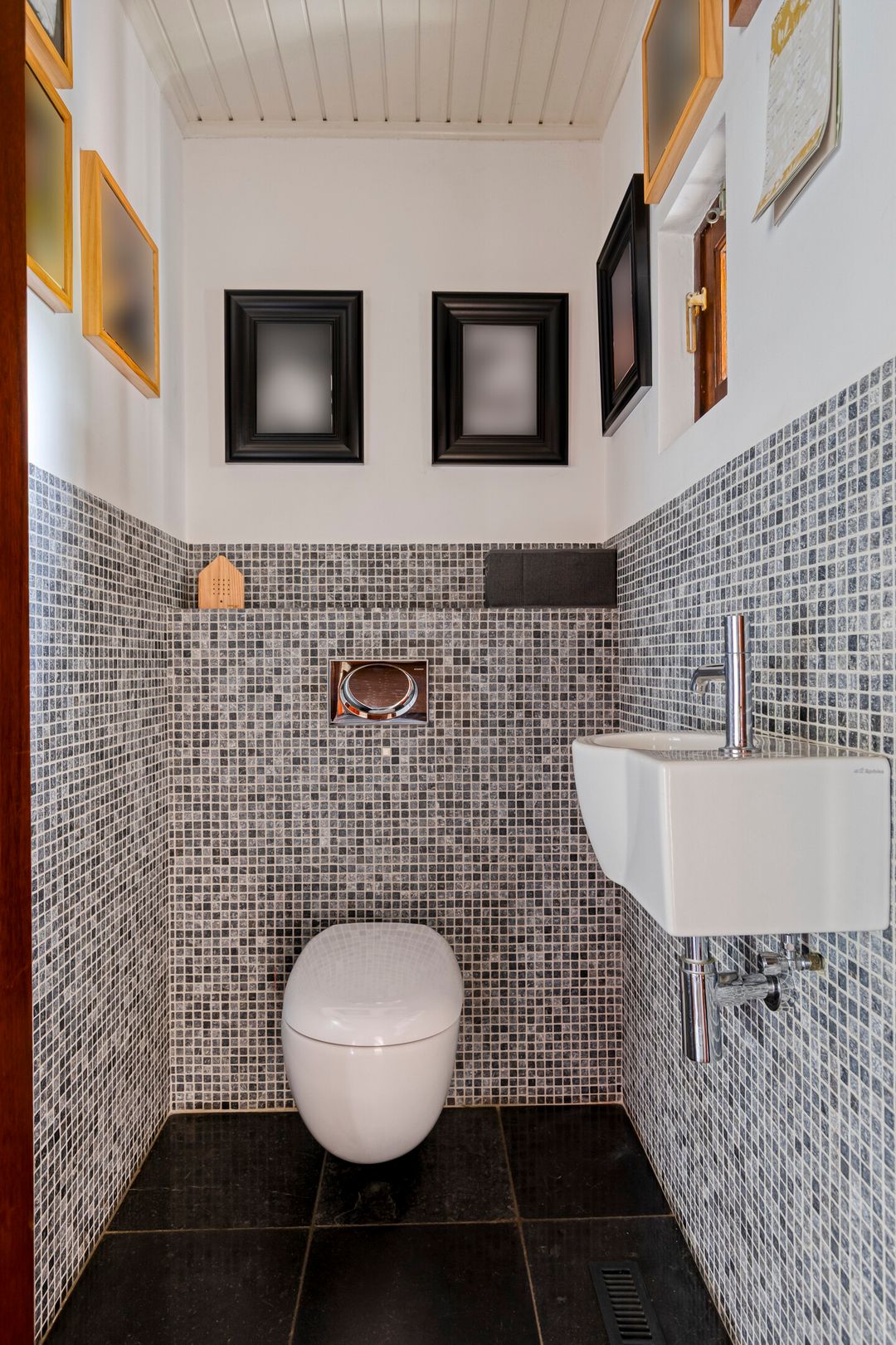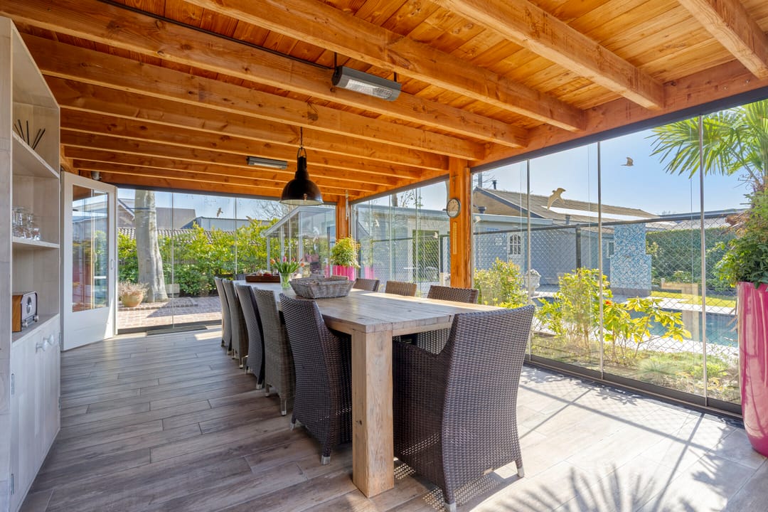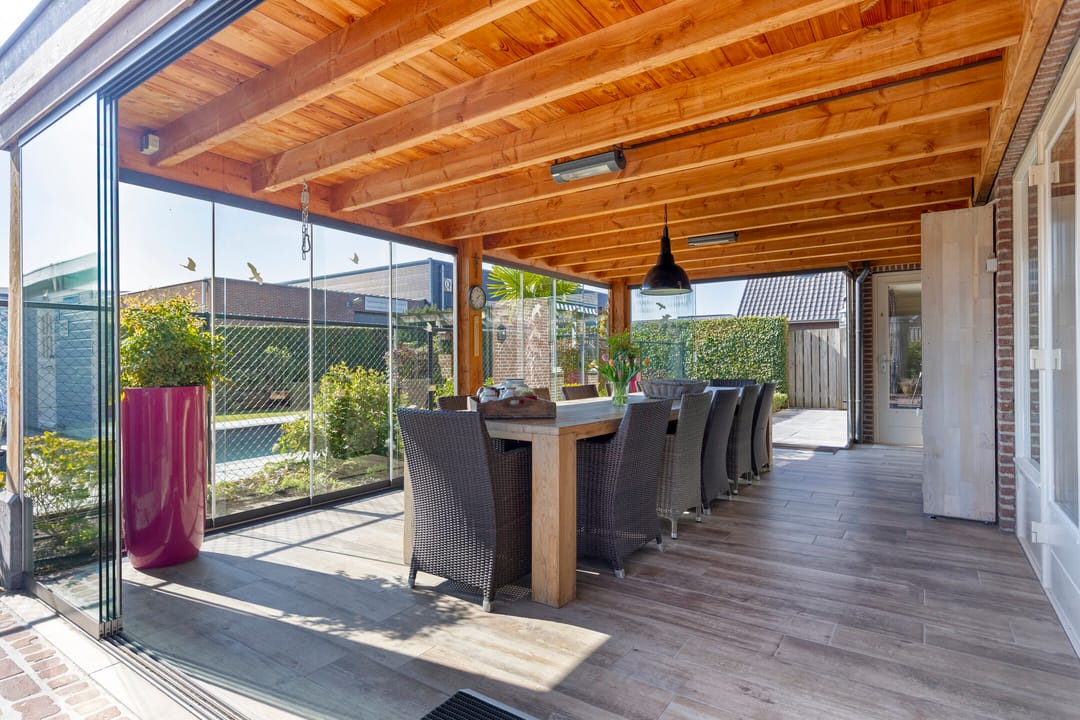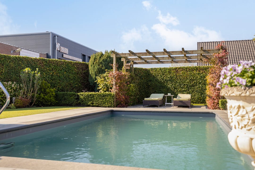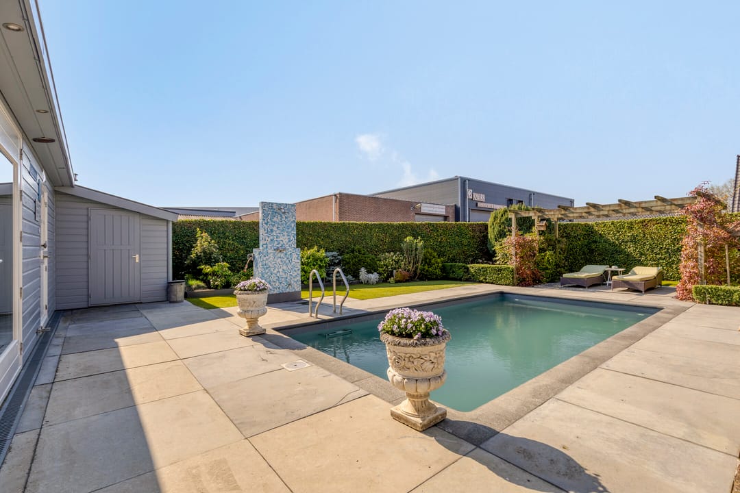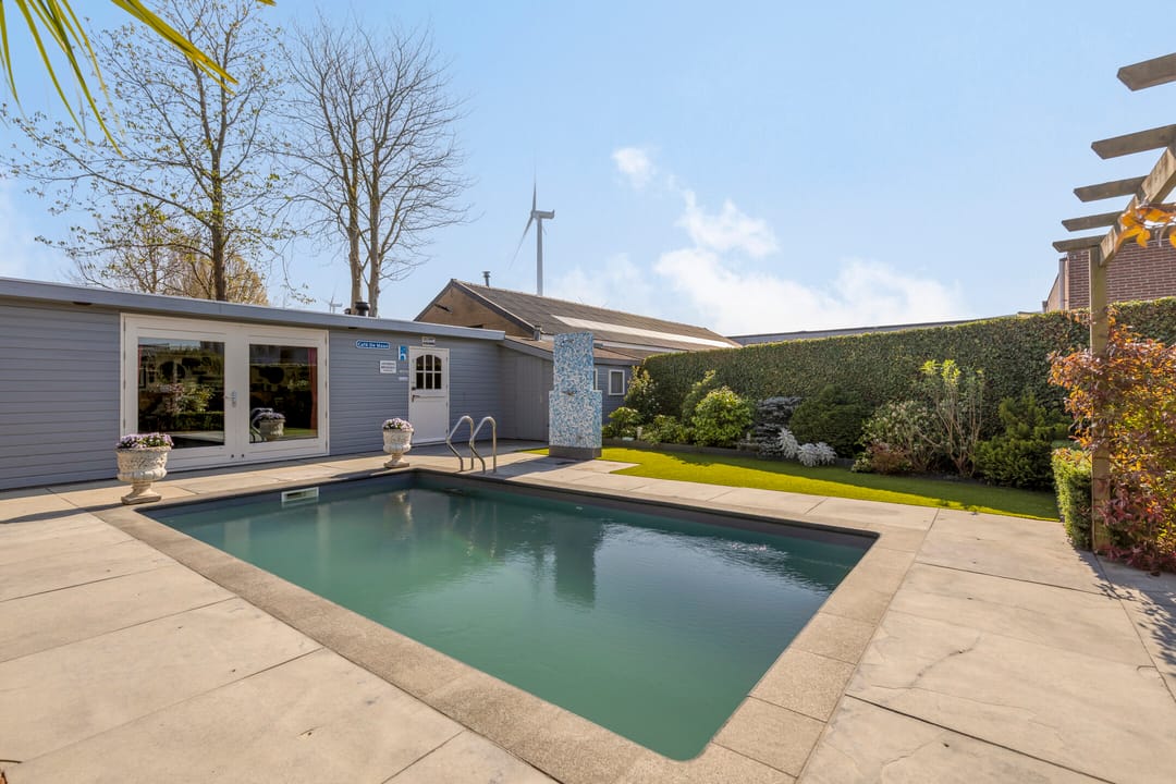 De ruime en besloten tuin is gunstig gesitueerd op het zuidwesten, biedt veel privacy, is keurig verzorgd en strak en onderhoudsvriendelijk aangelegd. Het verwarmde zwembad vormt het uitnodigende middelpunt. Voor extra comfort is er een buitendouche (met warm water) en een toilet in de berging. Als verrassende extra bevindt zich in de tuin nog een multifunctionele ruimte, ingericht als een sfeervol eigen café met bar, verwarming en wateraansluiting. Hier kan menig feestje gevierd worden.