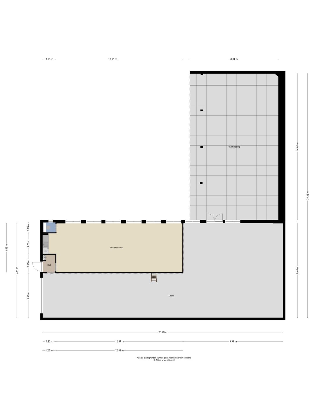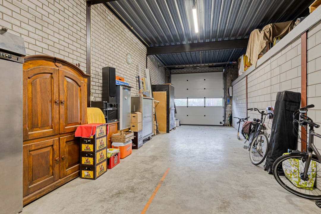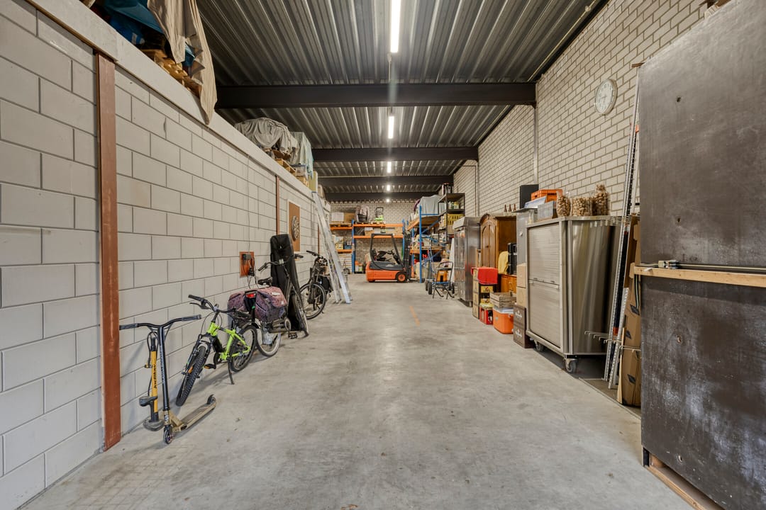 Het vrijstaande bedrijfsgebouw meet ca. 24 x 9,5 meter. Het bestaat grotendeels uit een ruime, hoge loods/opslagruimte met een brede segmenteerdeur. Daarnaast is er een ruimte met eigen entree, die voorheen is gebruikt als showroom en is voorzien van eigen pantry, toiletruimte en airconditioning. Deze ruimte leent zich uiteraard eveneens uitstekend als kantine of kantoor. Aansluitend aan de bedrijfsruimte is een royale overkapping.