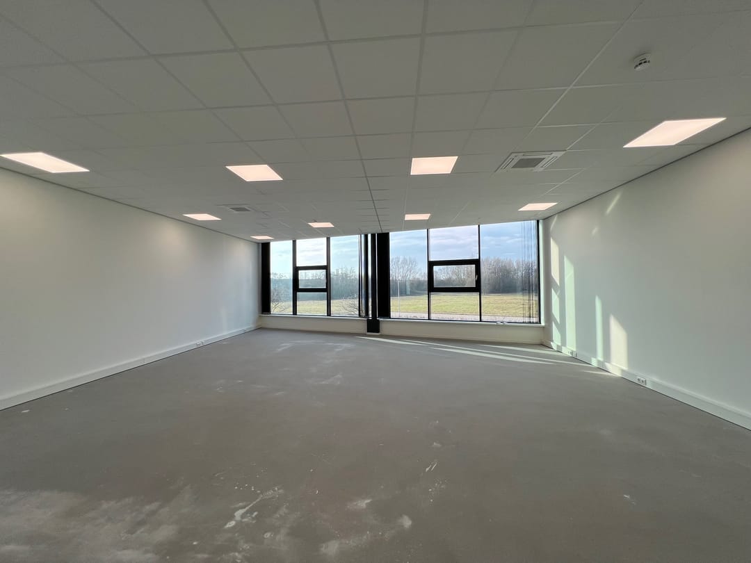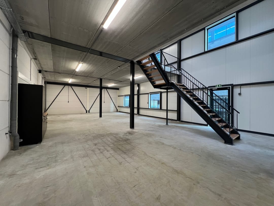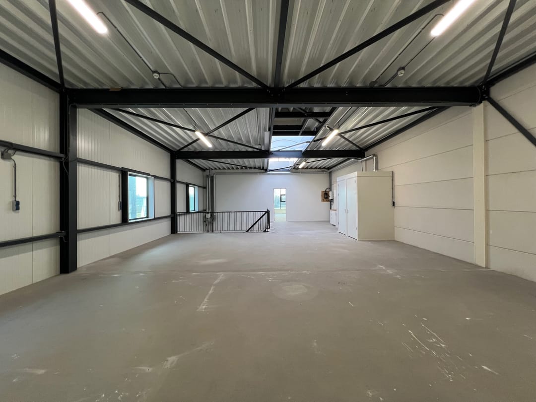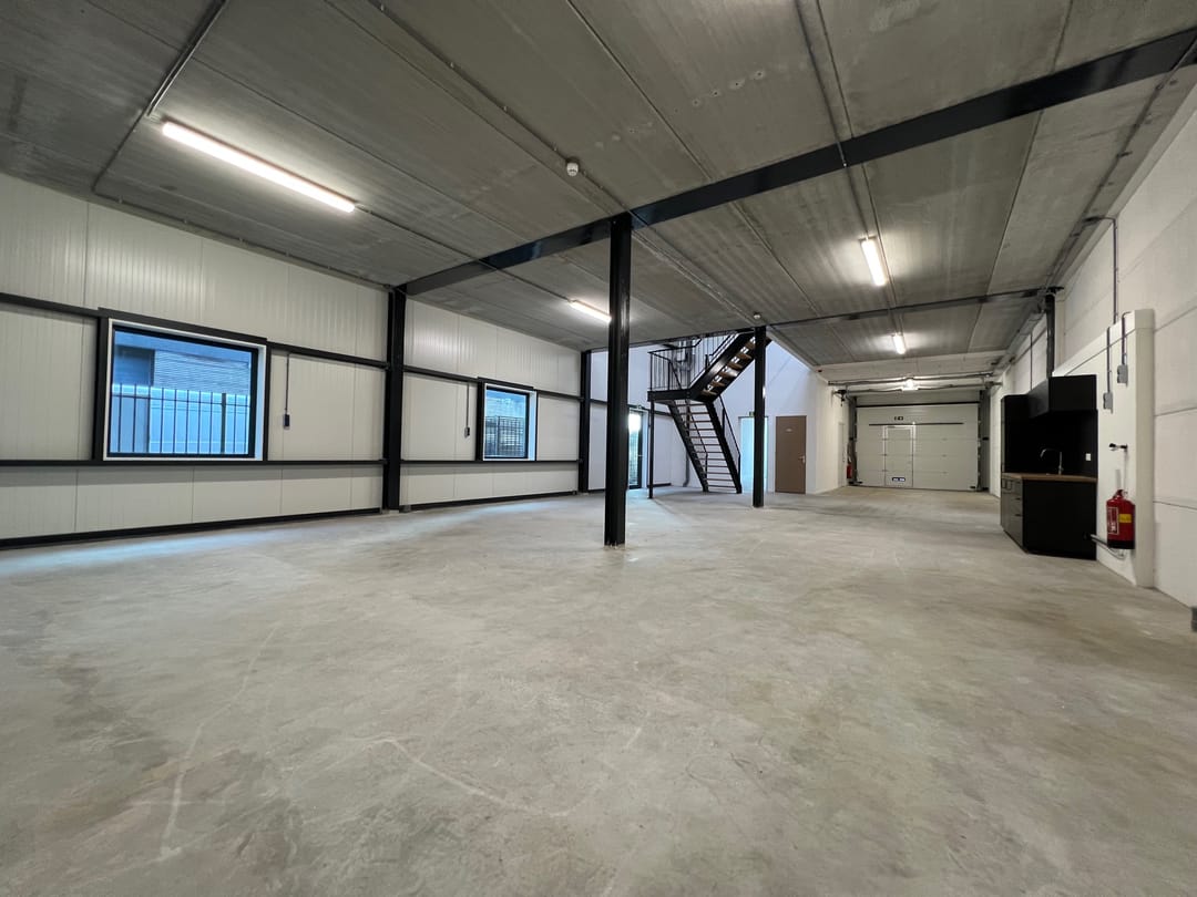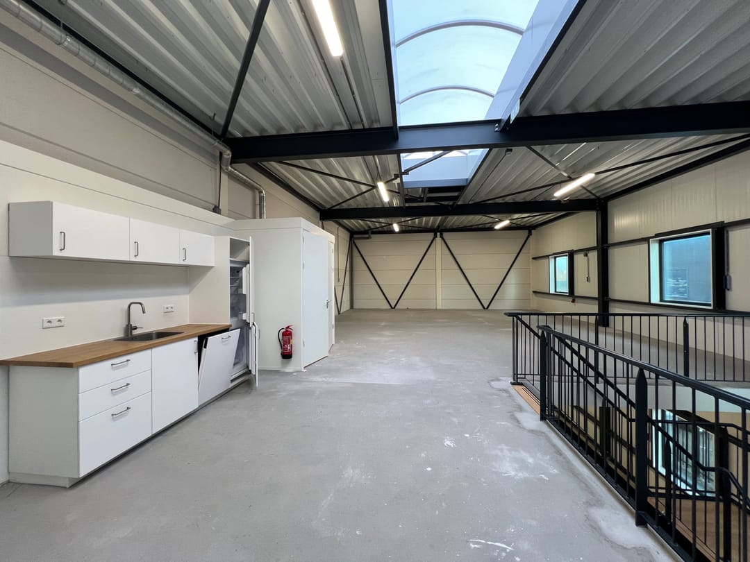 - Lichtstraten, overheaddeuren, betonvloer, toilet, pantry, airconditioning en inbouwarmaturen