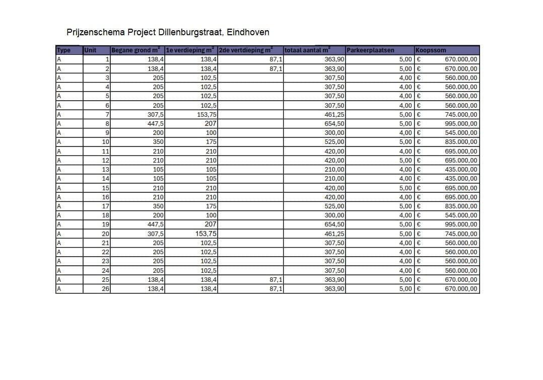De units variëren in indeling en omvang, waaronder hoekunits met extra raampartijen, units met twee of drie bouwlagen en grotere bedrijfsunits met uitgebreide vloeroppervlakken. Een volledige prijslijst en gedetailleerde plattegronden zijn beschikbaar via de verkopende makelaar.