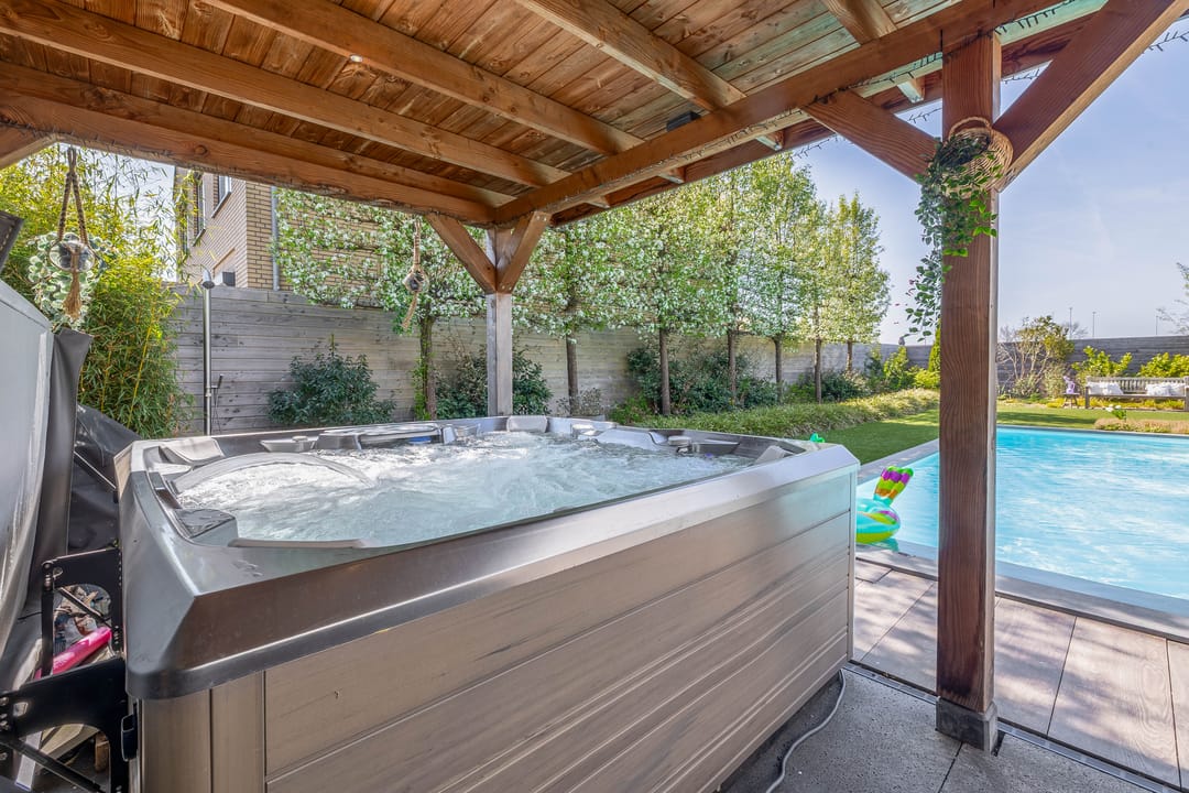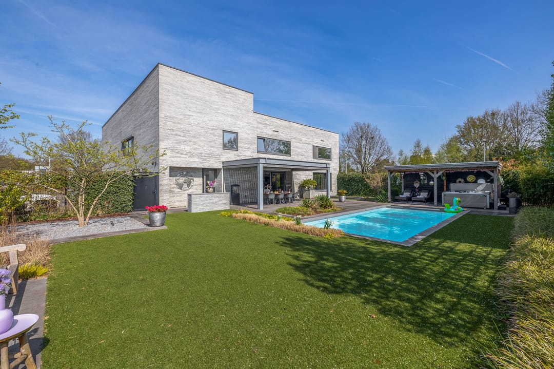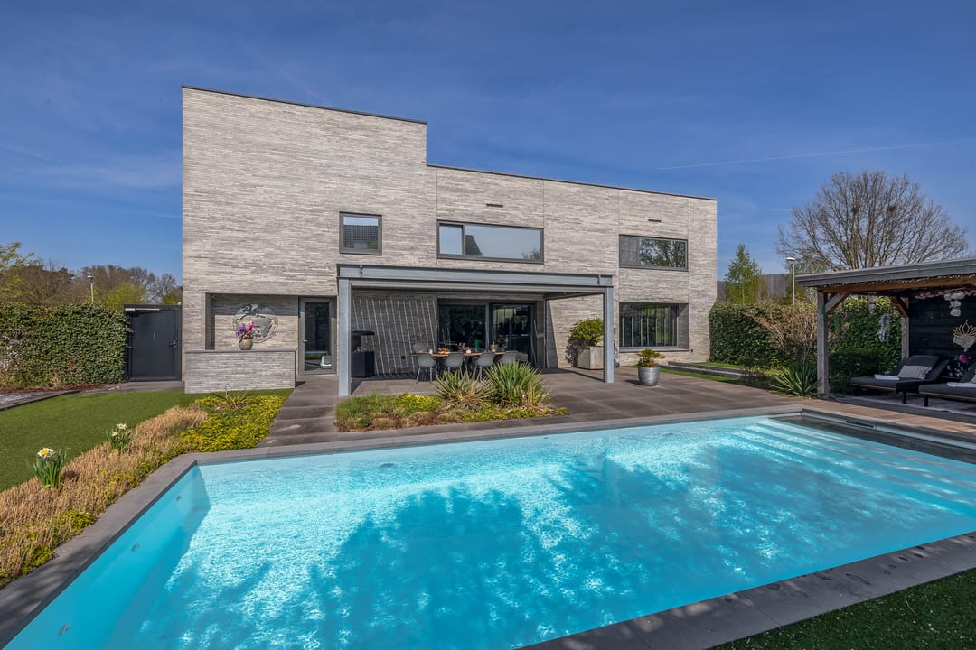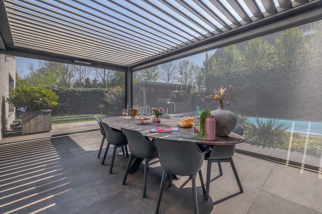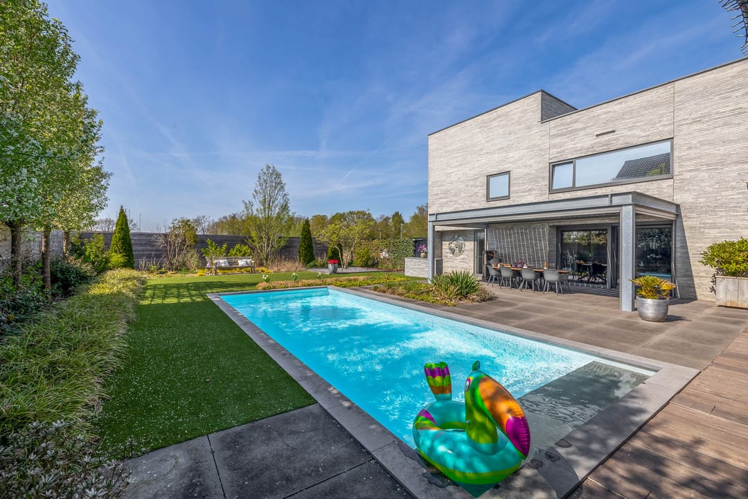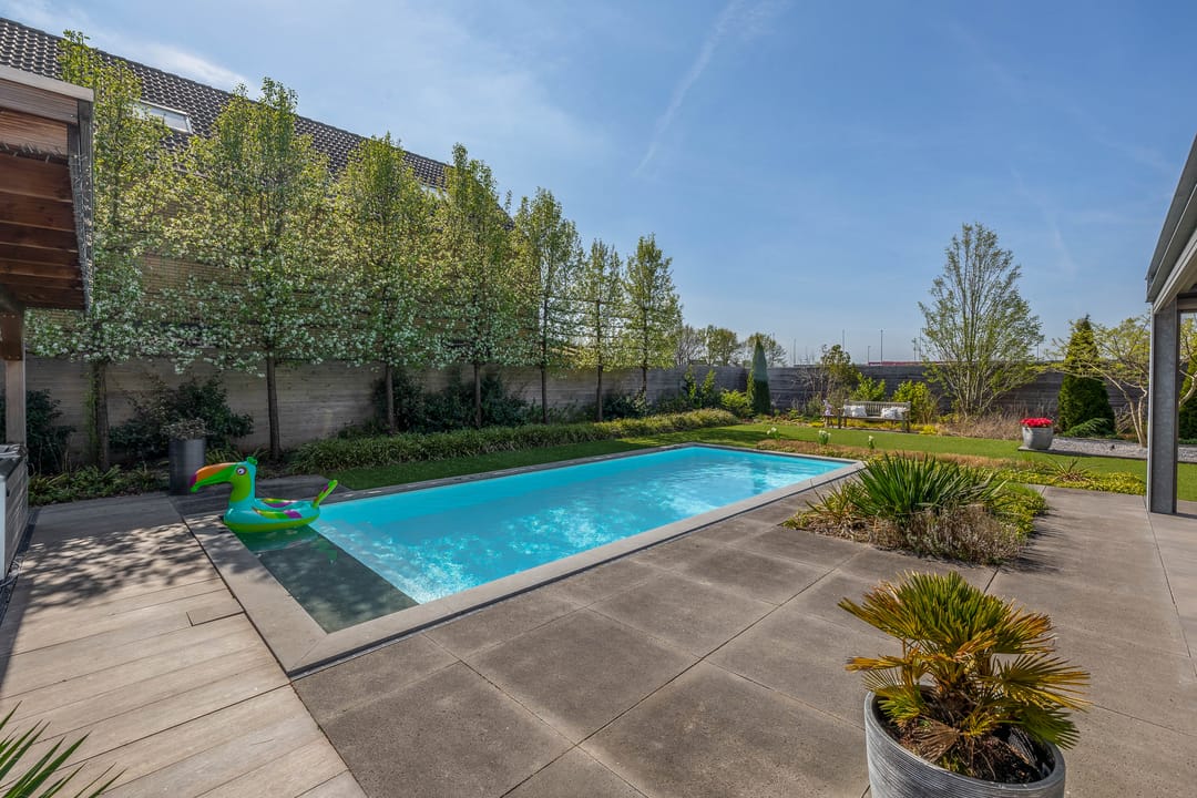 Onder architectuur aangelegde tuin met groot verwarmd zwembad (ca. 10mx4m) met trap en afdekking, overdekt terras met verstelbare lamellen (Luvium) en screen, als extra nog houten overkapping (ca. 21 m²) met een jacuzzi.