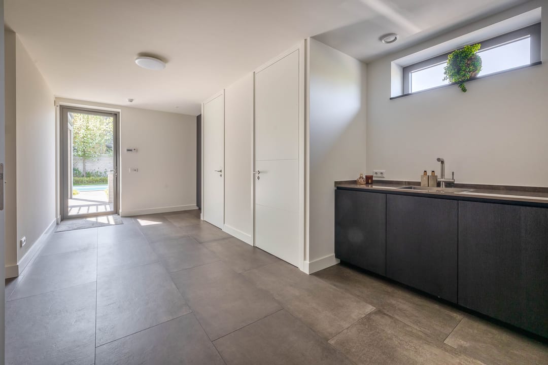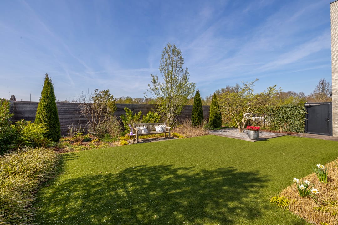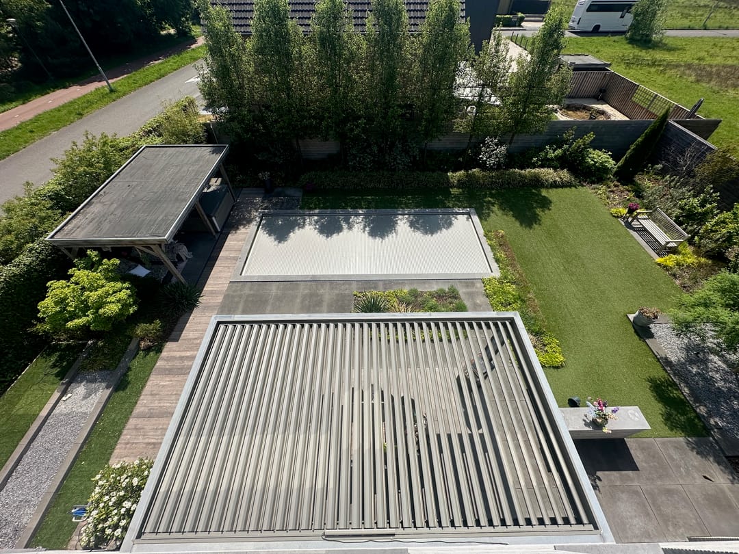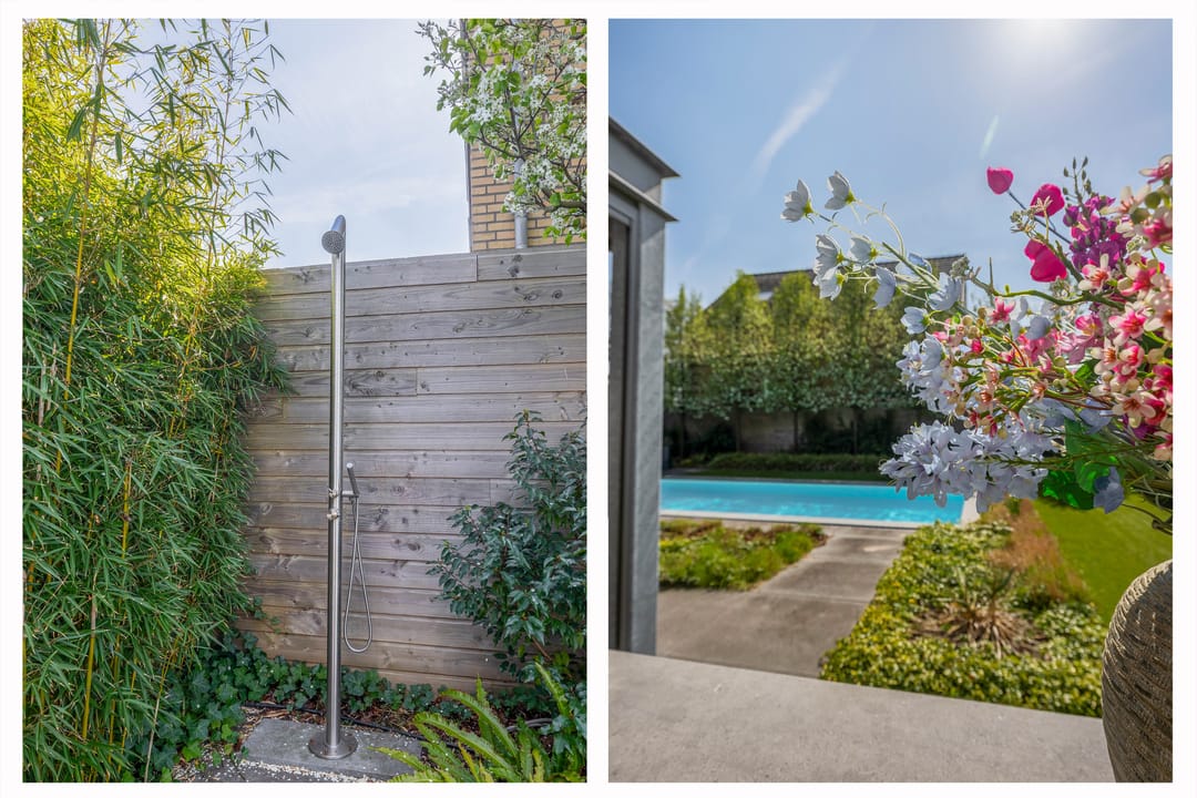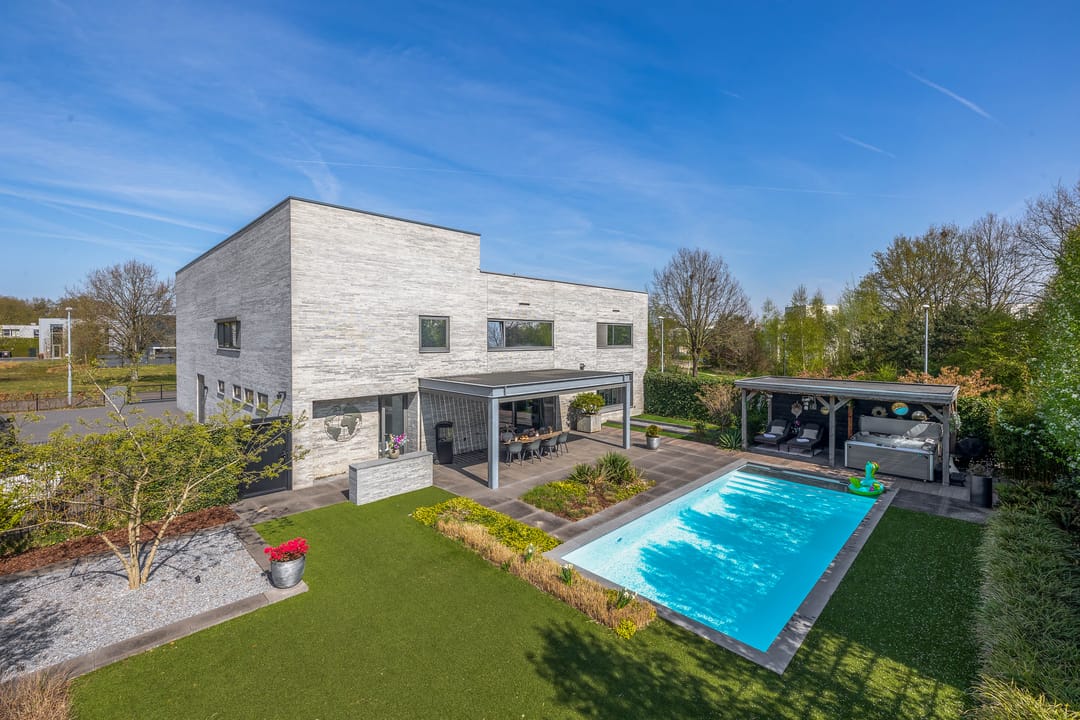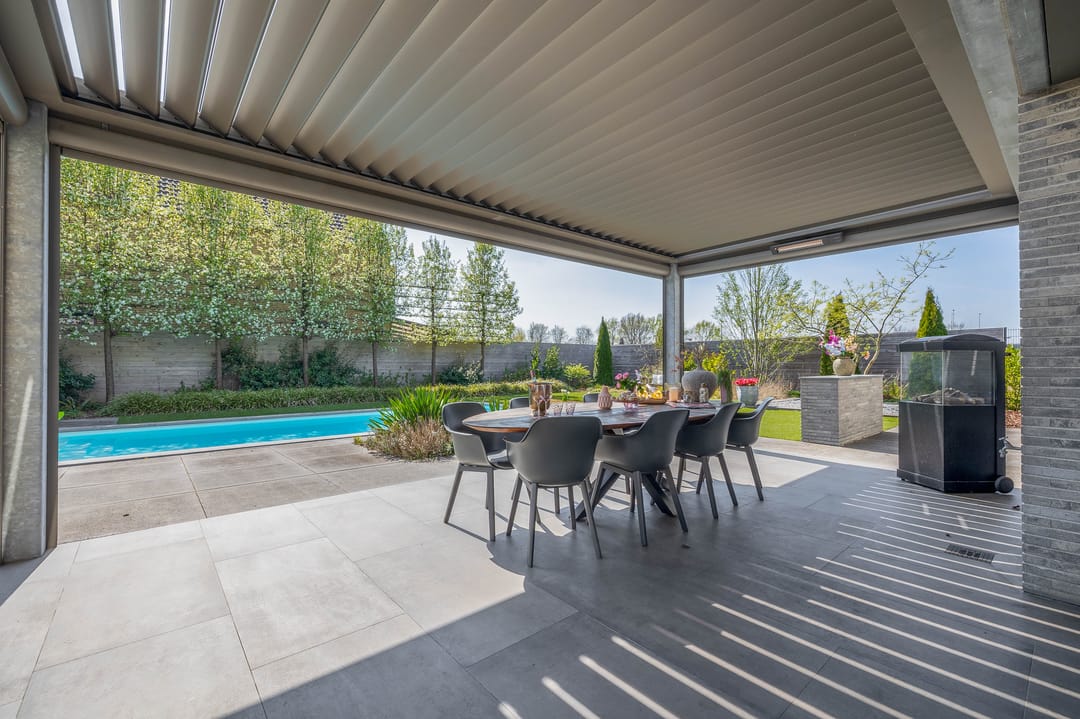 Onder architectuur aangelegde tuin met groot verwarmd zwembad (ca. 10mx4m) met trap en afdekking, overdekt terras met verstelbare lamellen (Luvium) en screen, als extra nog houten overkapping (ca. 21 m²) met een jacuzzi.