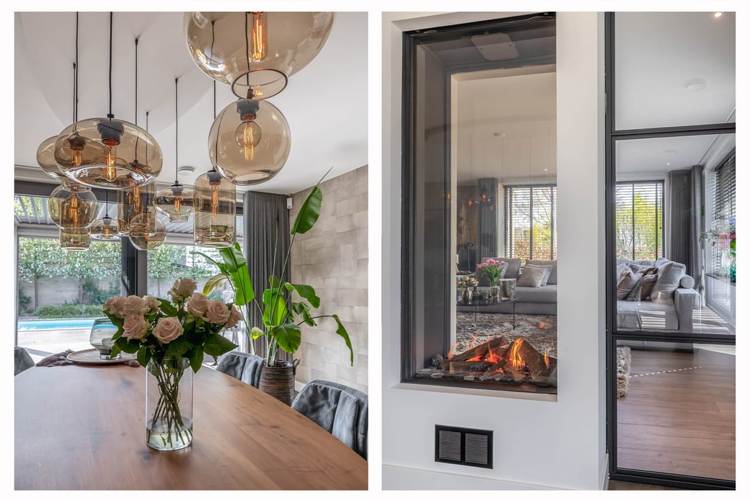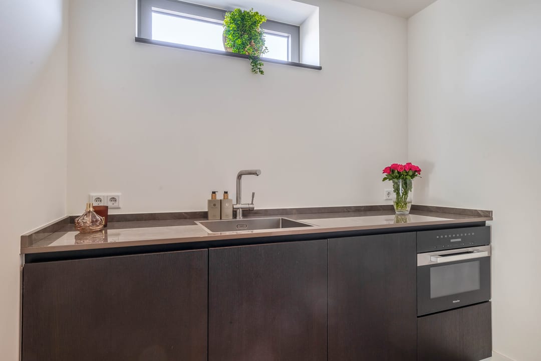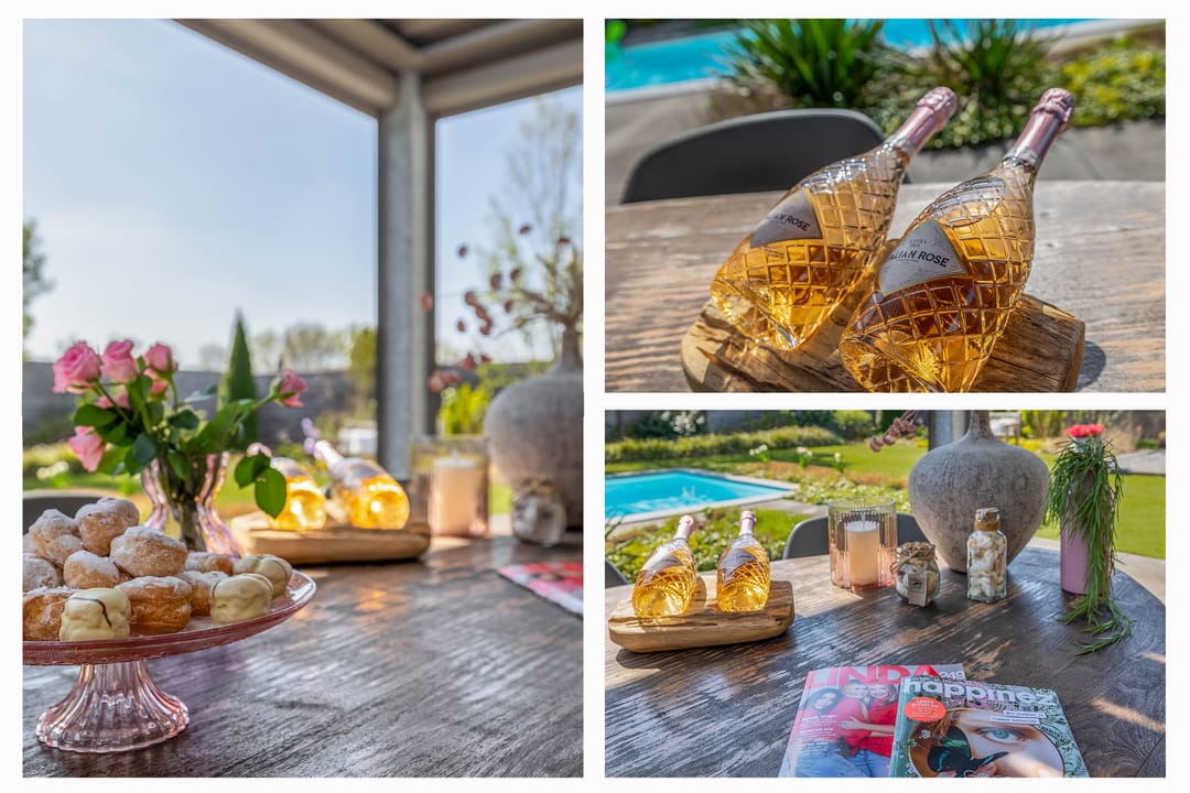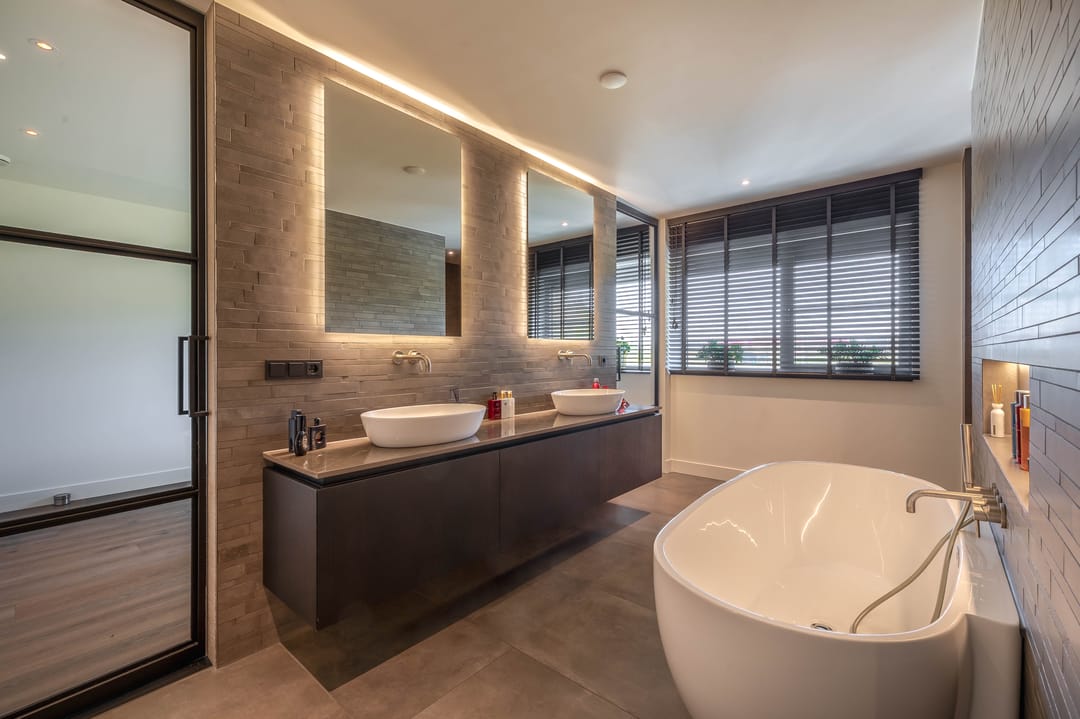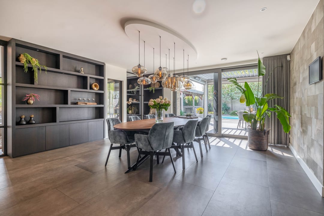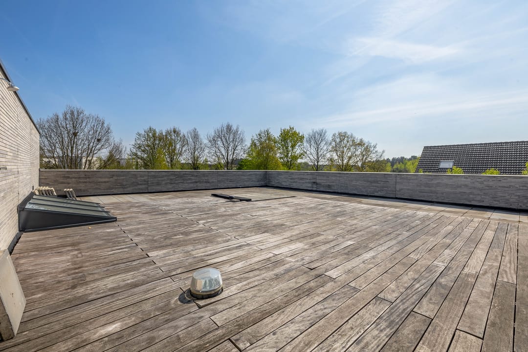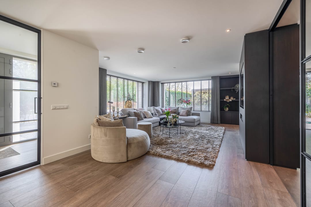 Onder architectuur aangelegde tuin met groot verwarmd zwembad (ca. 10mx4m) met trap en afdekking, overdekt terras met verstelbare lamellen (Luvium) en screen, als extra nog houten overkapping (ca. 21 m²) met een jacuzzi.
