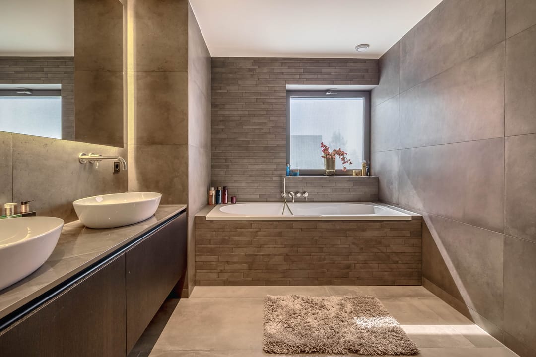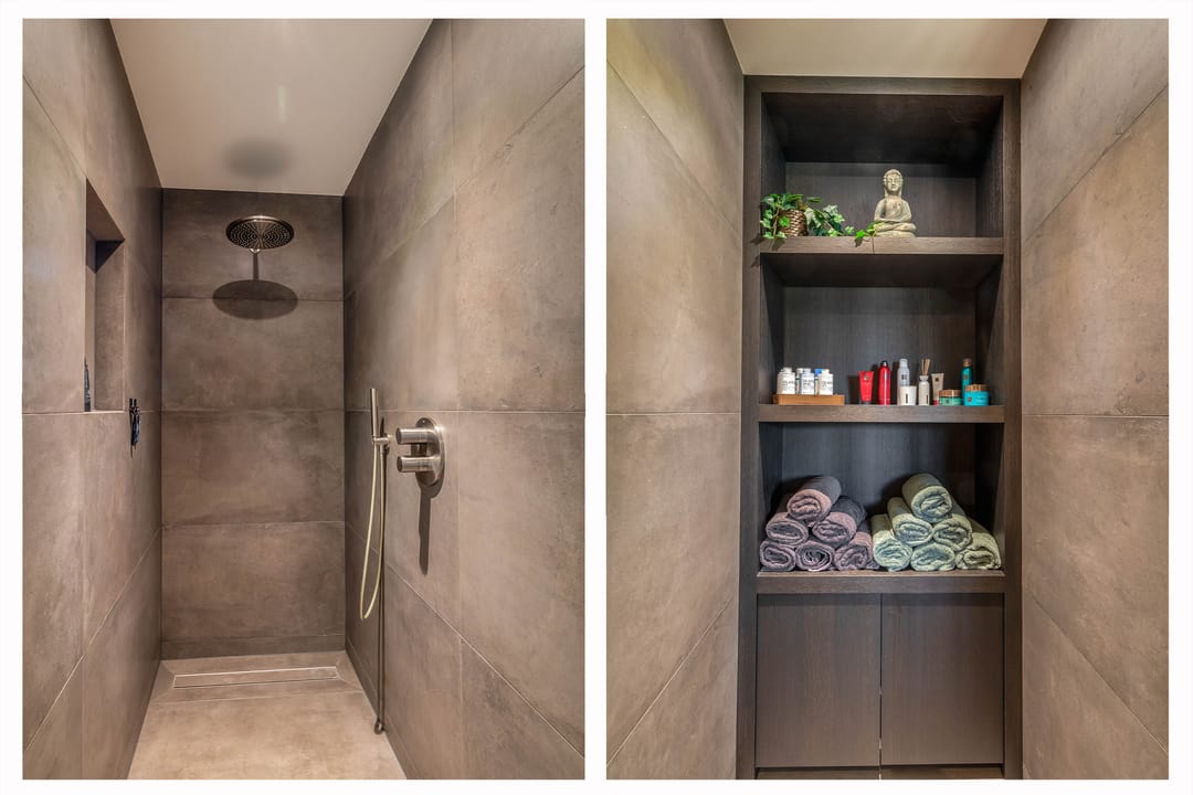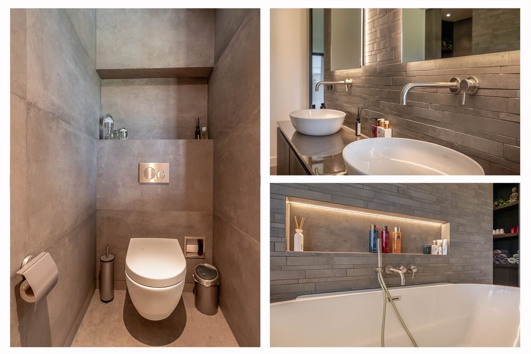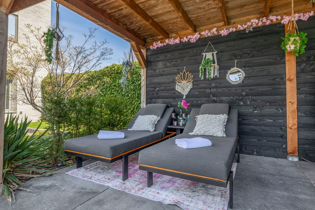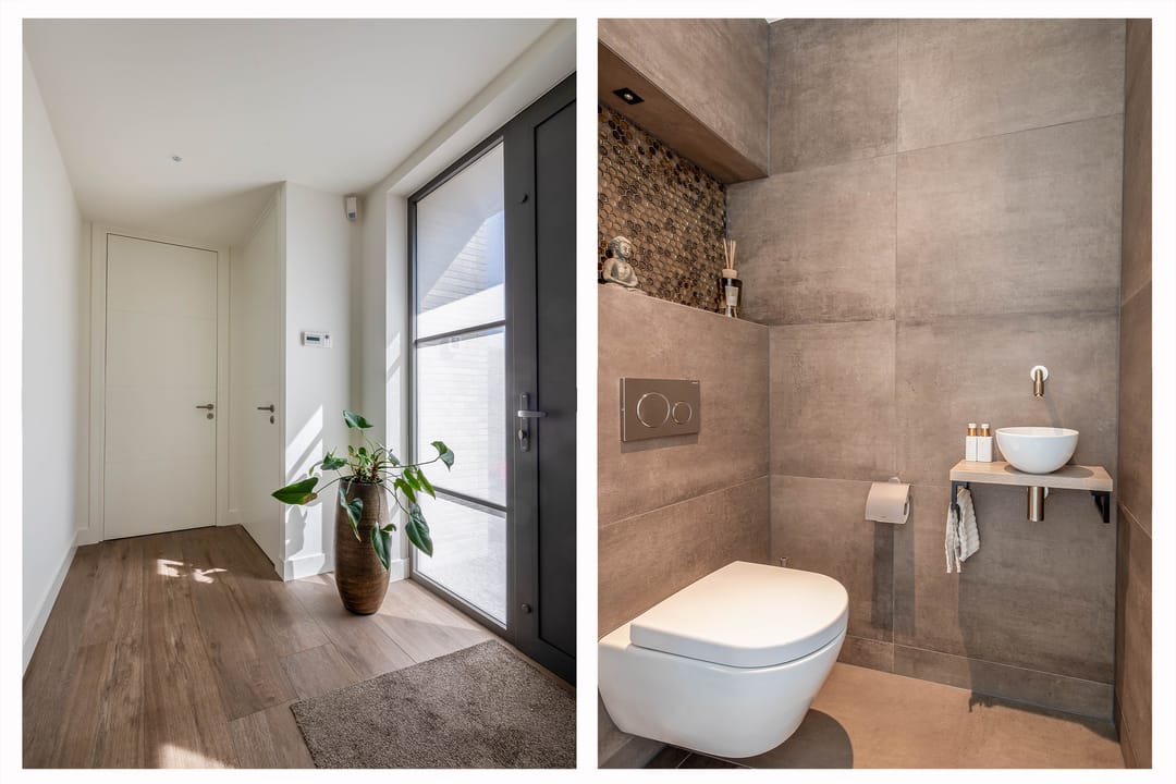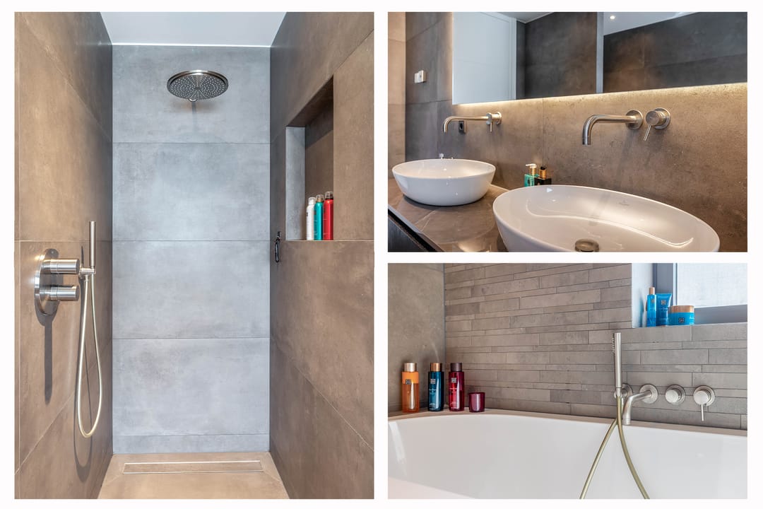 Onder architectuur aangelegde tuin met groot verwarmd zwembad (ca. 10mx4m) met trap en afdekking, overdekt terras met verstelbare lamellen (Luvium) en screen, als extra nog houten overkapping (ca. 21 m²) met een jacuzzi.