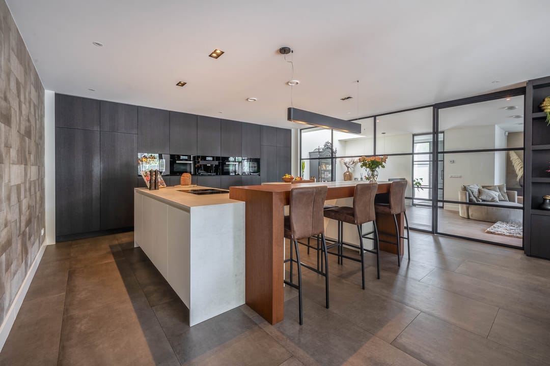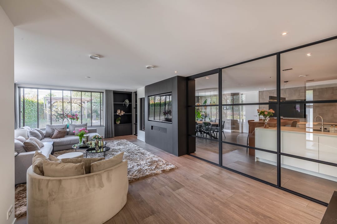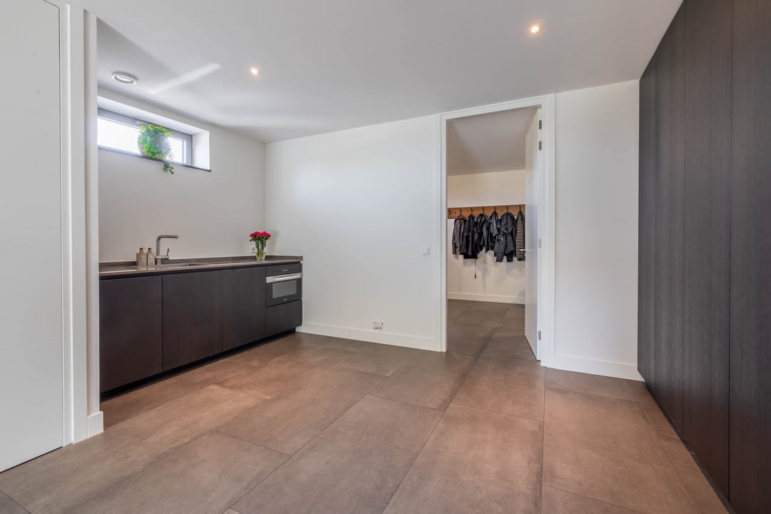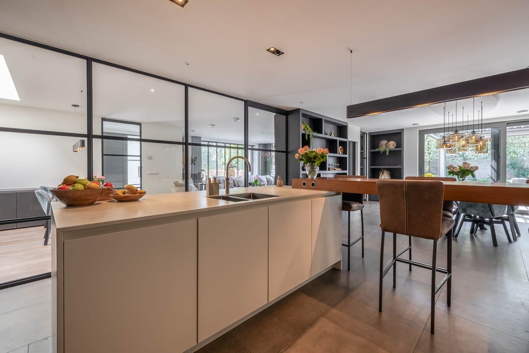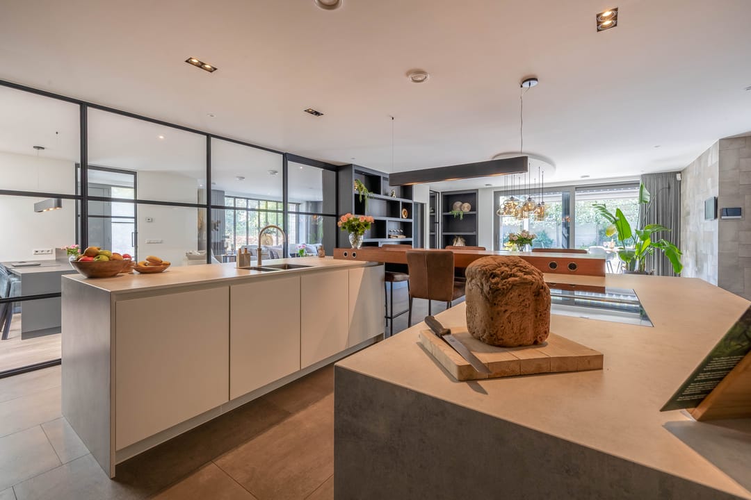 Entree. Ontvangsthal met meterkast. Toiletruimte. Bijzonder sfeervolle woonkamer met vaste inbouwkasten, veel lichtinval en doorkijk gashaard. Royale woonkeuken (ca. 60m²) met dubbel kook- en spoeleiland en een uitgebreid pakket aan Miele & Bora professional inbouwapparatuur. Portaal met toegang tot technische ruimte. Multifunctionele ruimte met dames en heren toiletgroep en pantry. Bijkeuken met toegang tot bedrijfsruimte.