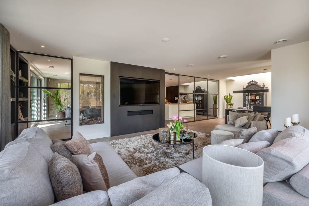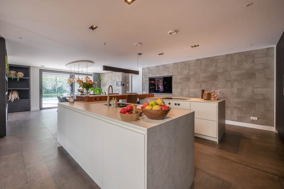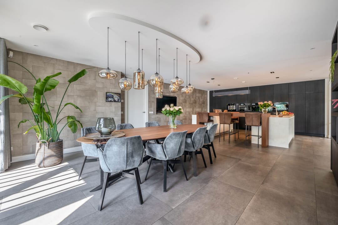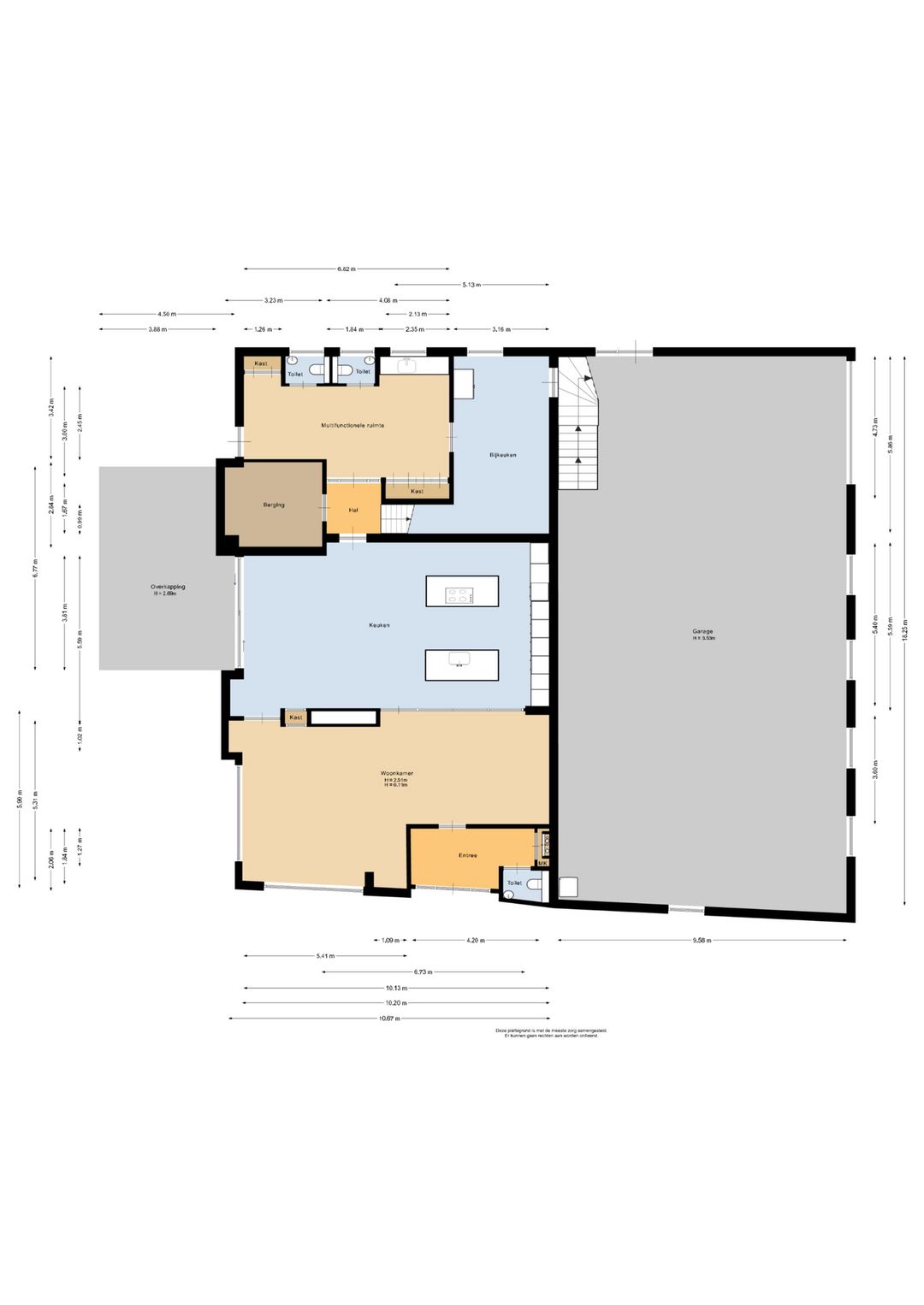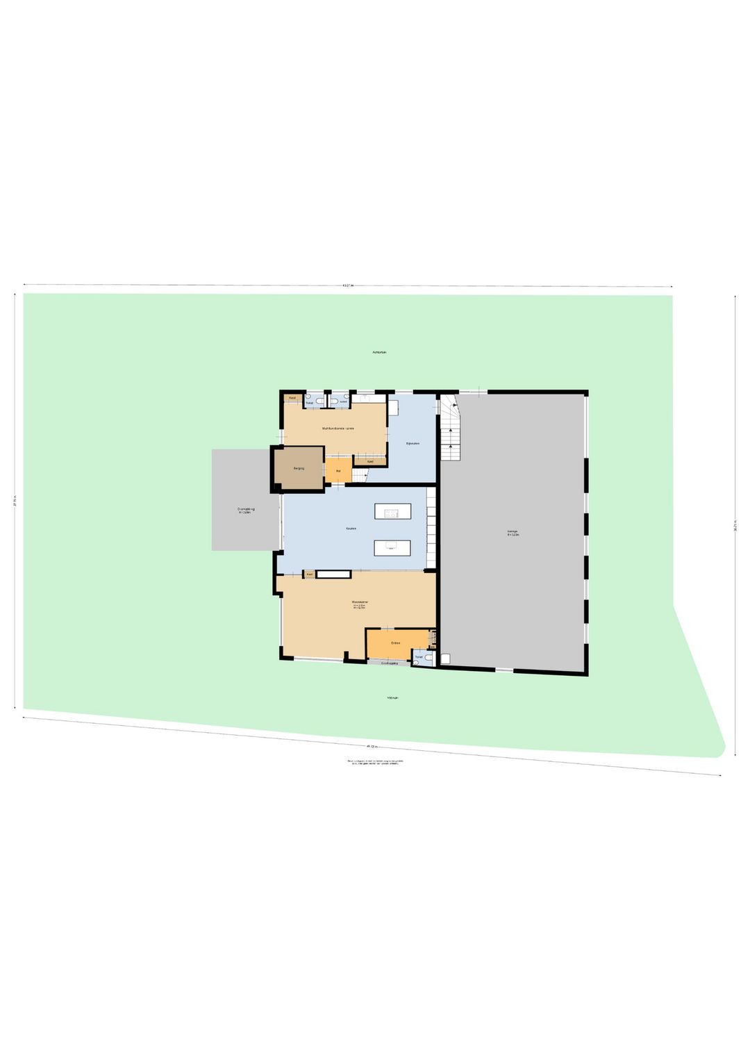 Entree. Ontvangsthal met meterkast. Toiletruimte. Bijzonder sfeervolle woonkamer met vaste inbouwkasten, veel lichtinval en doorkijk gashaard. Royale woonkeuken (ca. 60m²) met dubbel kook- en spoeleiland en een uitgebreid pakket aan Miele & Bora professional inbouwapparatuur. Portaal met toegang tot technische ruimte. Multifunctionele ruimte met dames en heren toiletgroep en pantry. Bijkeuken met toegang tot bedrijfsruimte.