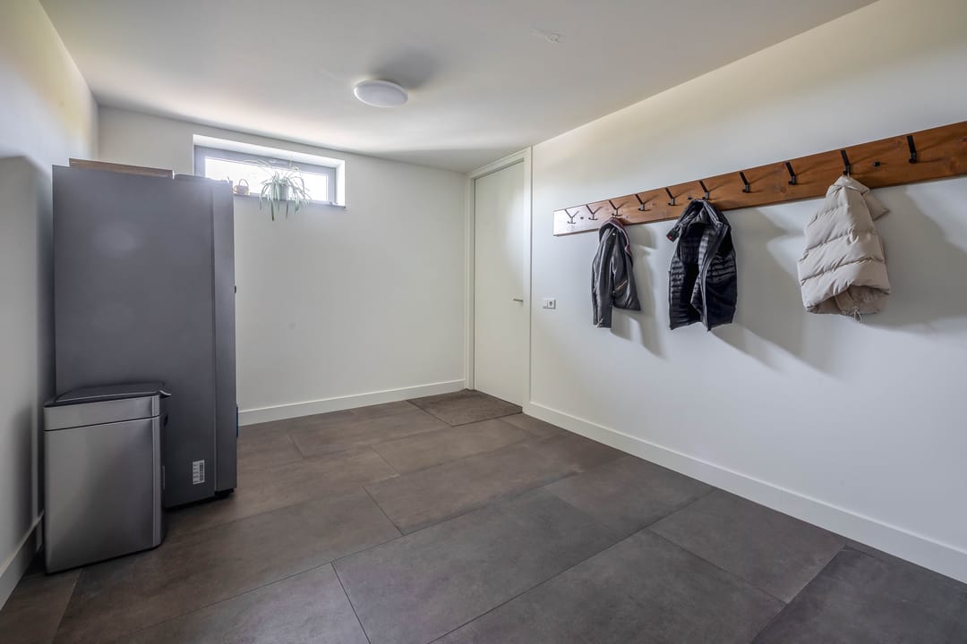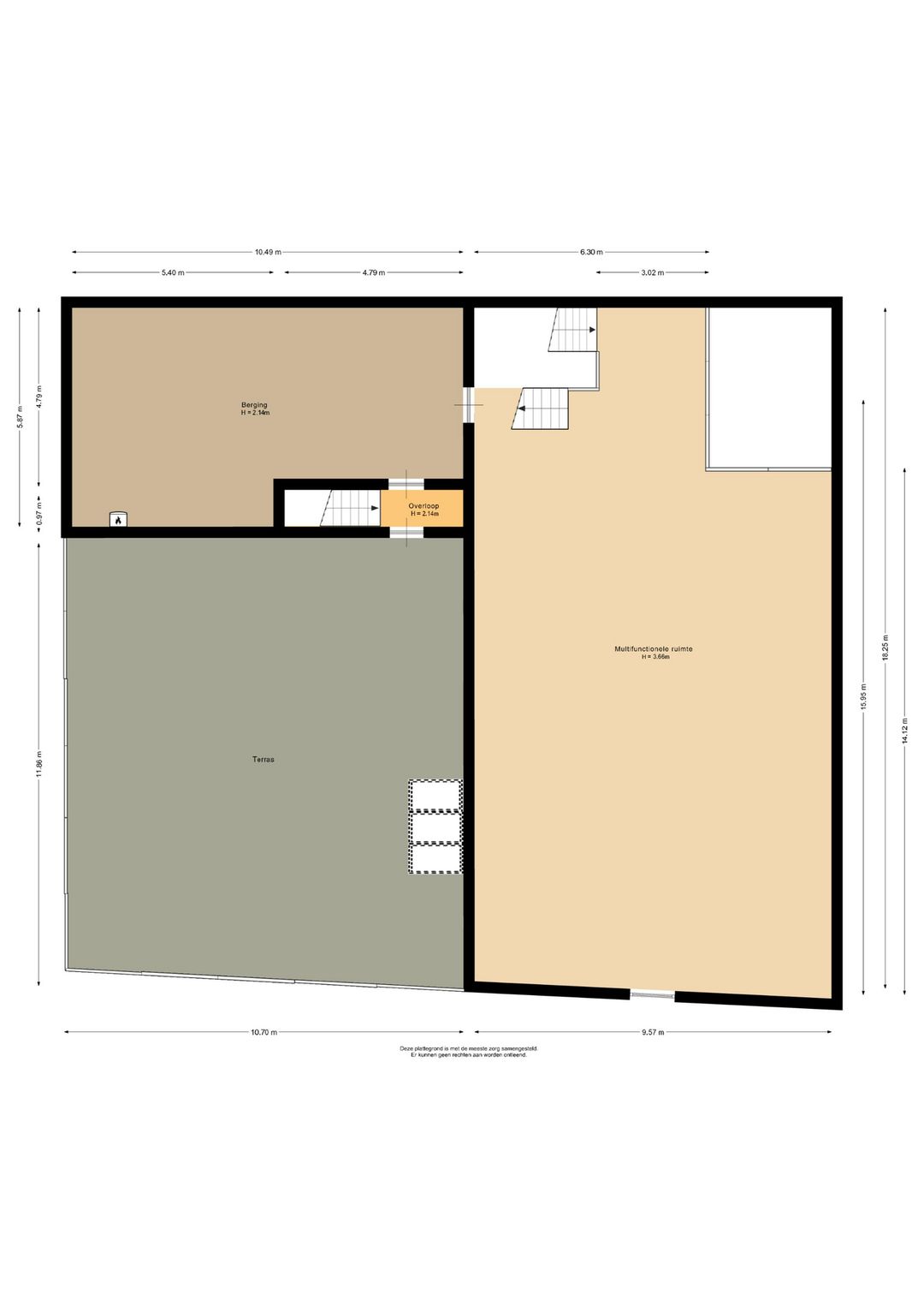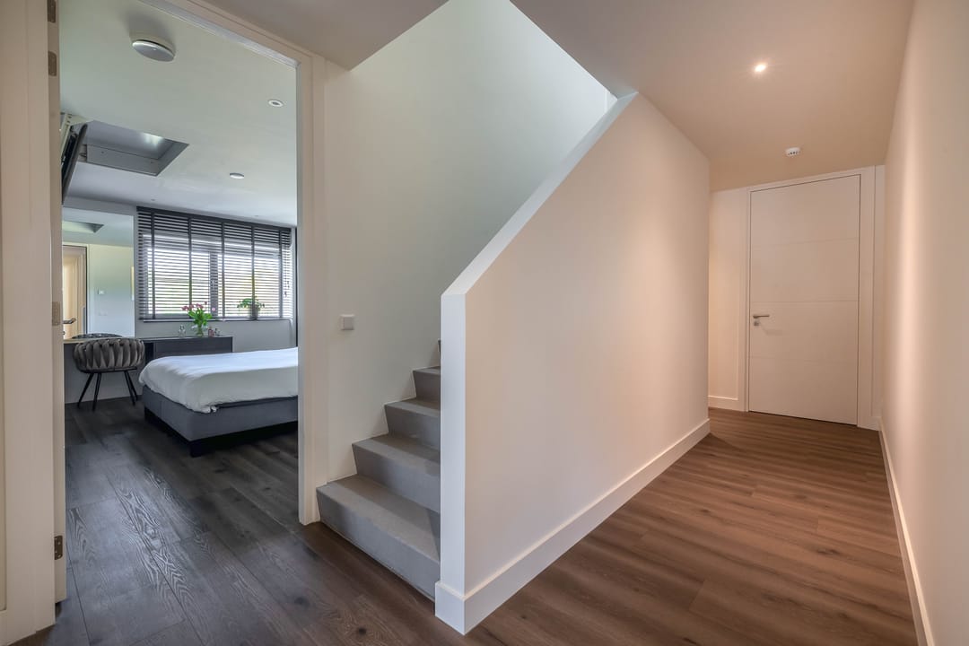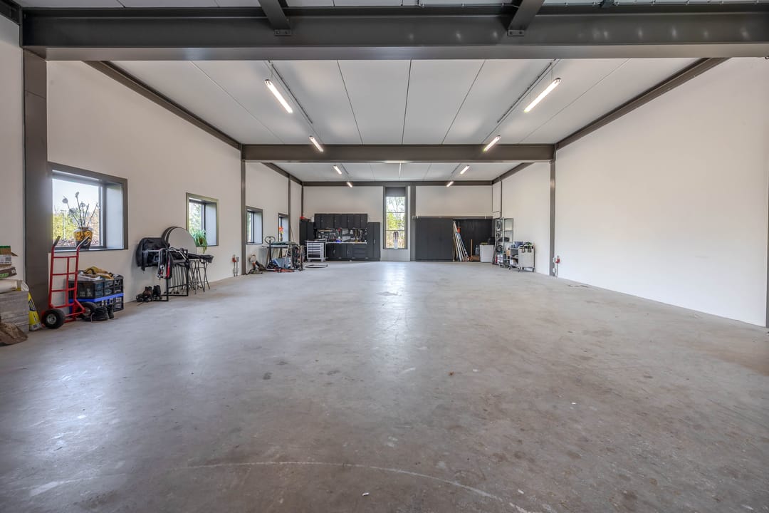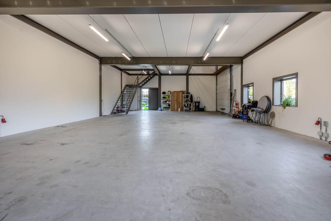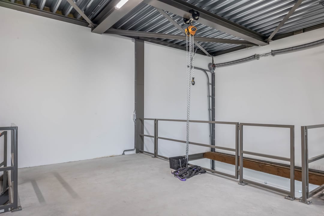 Vaste betonnen trap naar overloop. Bergruimte met doorgang naar multifunctionele ruimte met (2 ton) takel en een vrije hoogte van ca. 3,66m. Royaal dakterras.