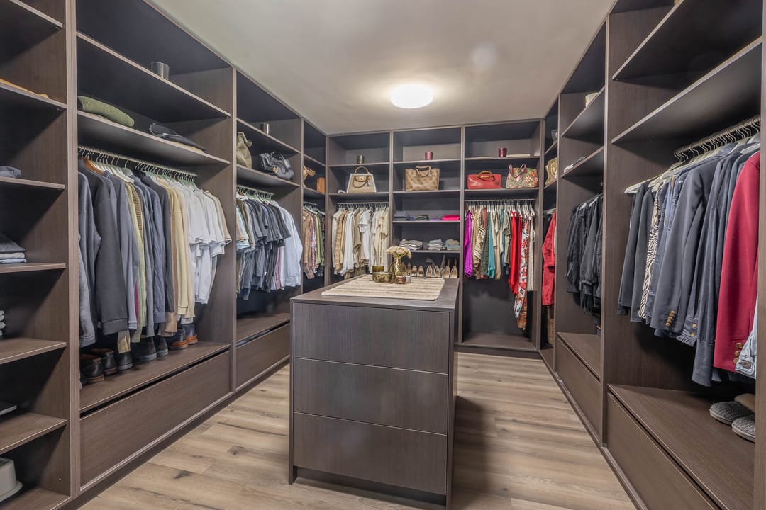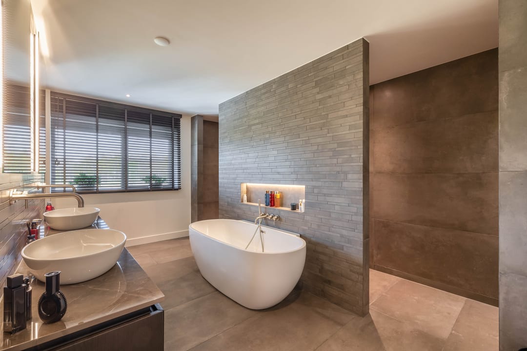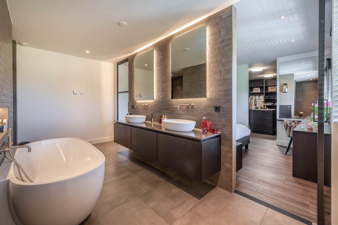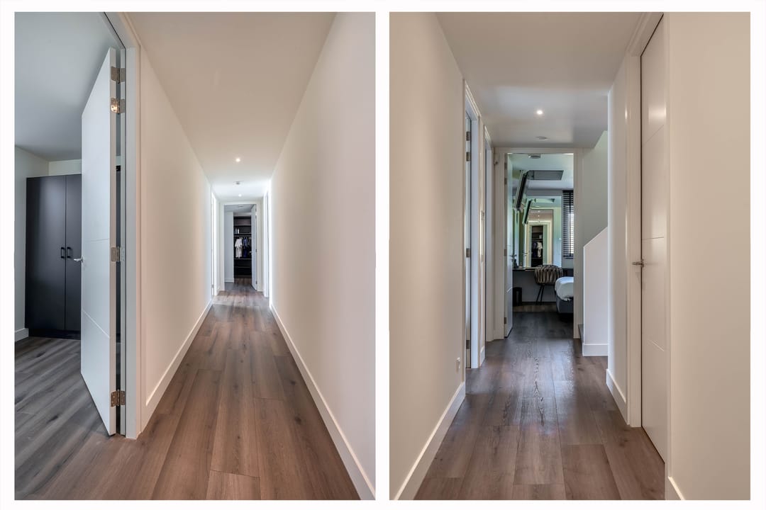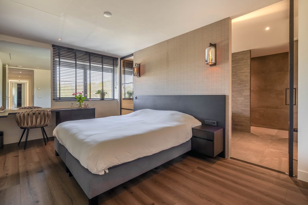 Vaste betonnen trap naar overloop. Ouderslaapkamer 1 met kleedruimte en badkamer en suite. Badkamer is met ligbad, inloopdouche, twee wastafels en toilet. Slaapkamer 2 met inloopkast. Slaapkamer 3 met inbouwkast. Slaapkamer 4 met inloopkast. Kantoorruimte 5. Wasruimte 6 met pantry. De 2e Badkamer is ook met ligbad, inloopdouche en twee wastafels. Separate toiletruimte.