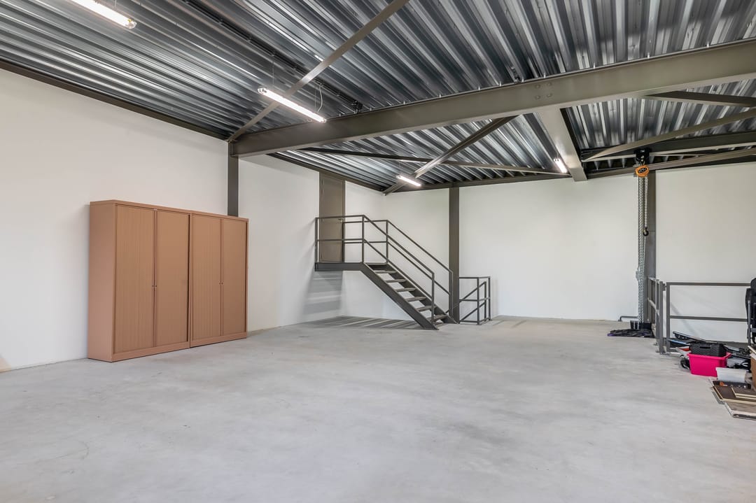 Bedrijfsruimte met overhead, betonvloer en trapopgang naar 2e verdieping.