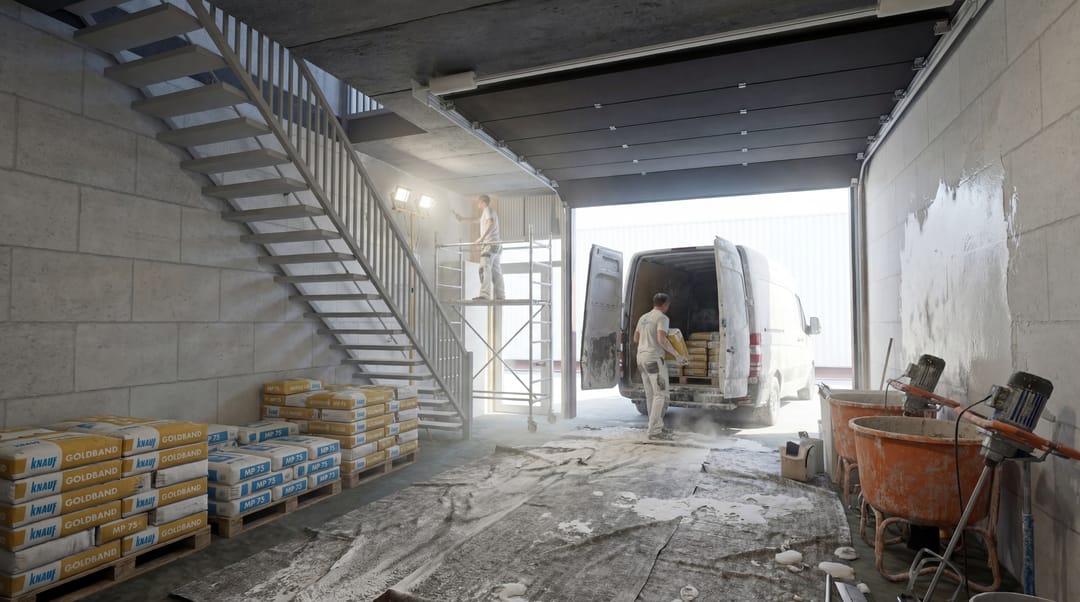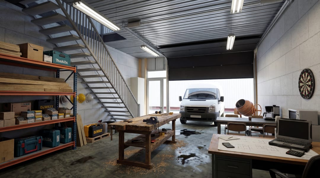 - Overheaddeuren, krachtstroom, betonvloer, toilet, pantry, inbouwarmaturen en te openen ramen