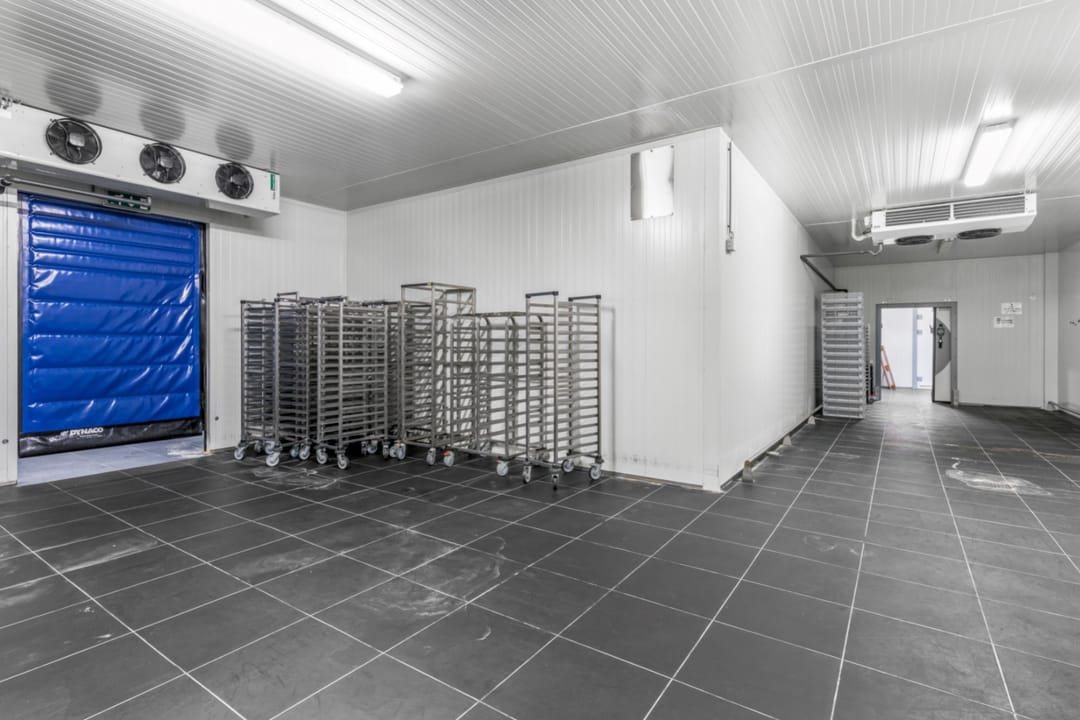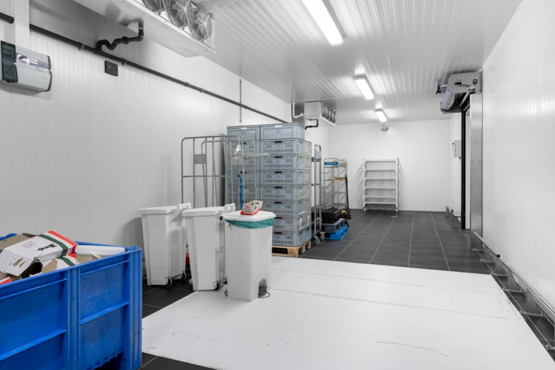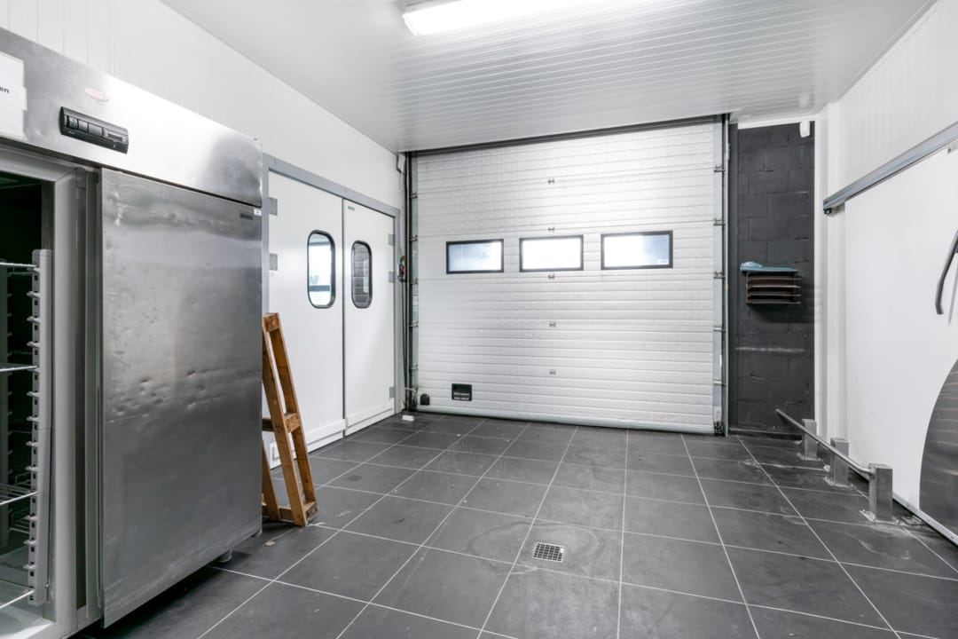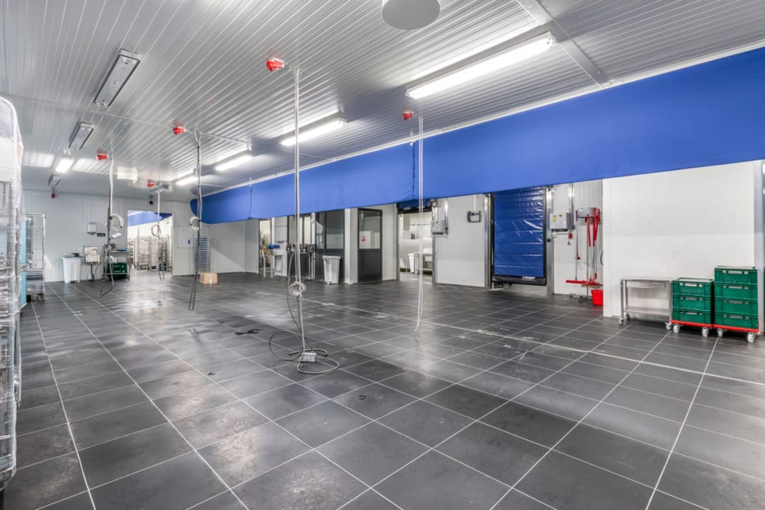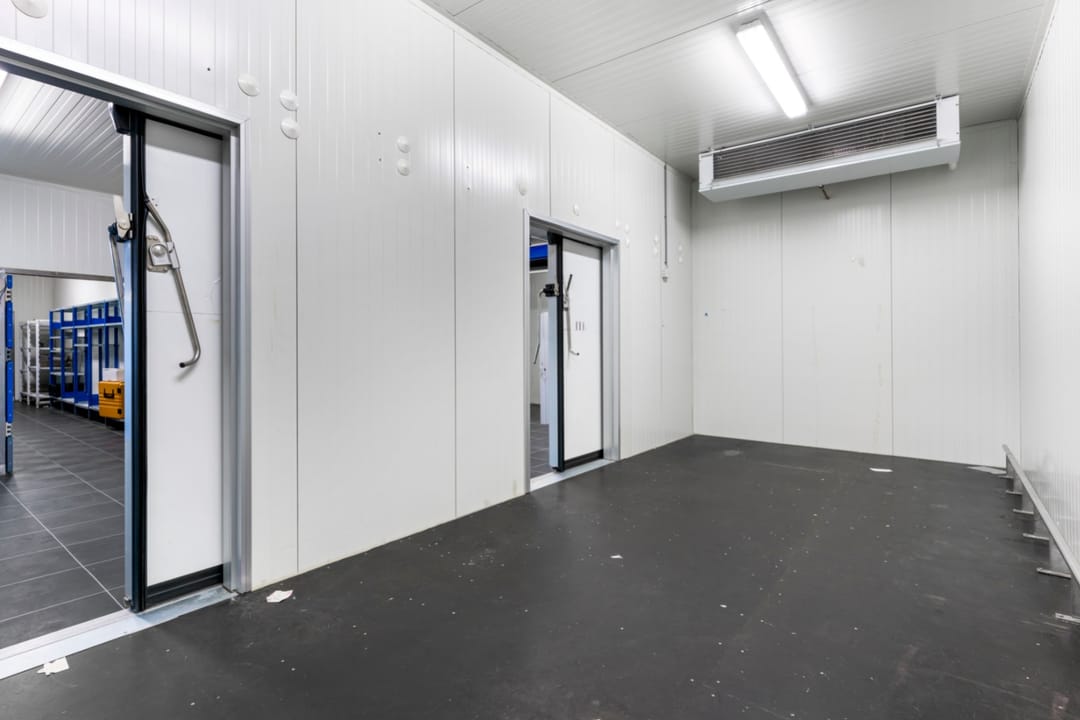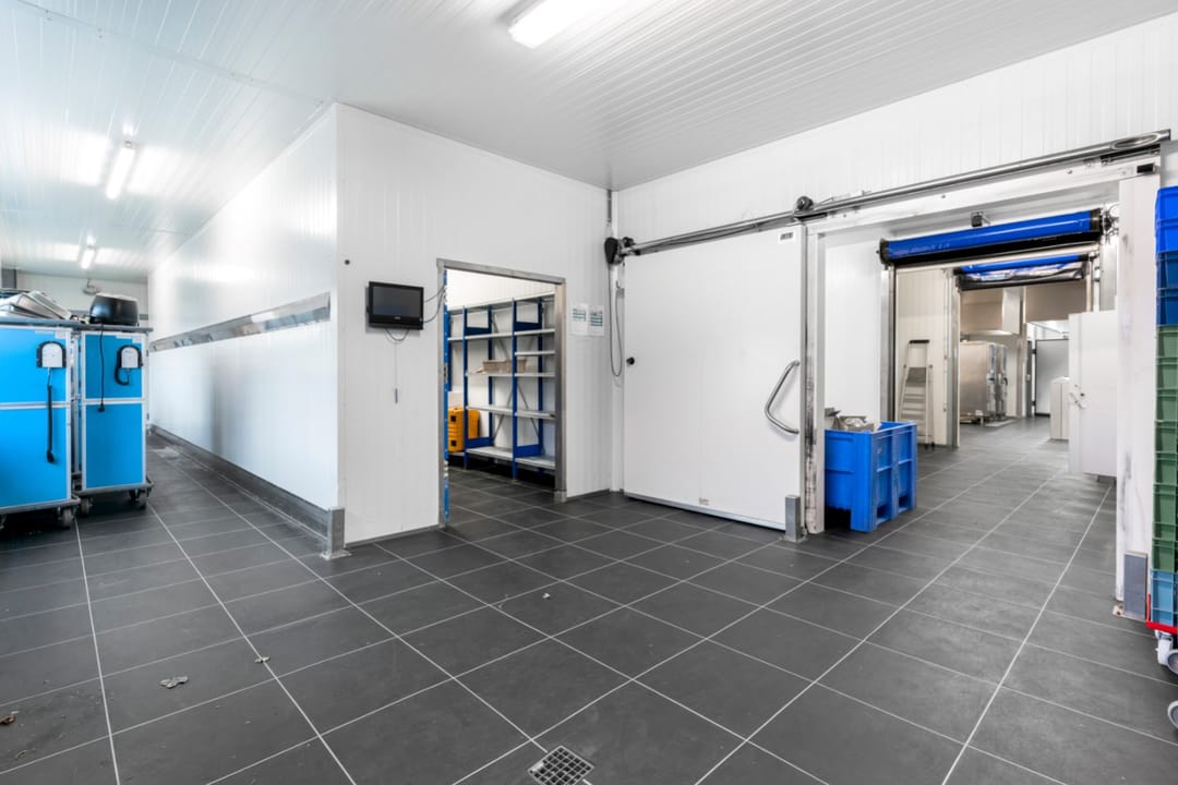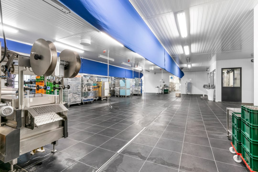 Entree/ontvangsthal met toegang tot het kantoor, bedrijfsbureau, dames- en heren kleedruimtes met toiletten, de productieruimte met koelsysteem en diverse opslagruimten. De productieruimte is voorzien van 4 elektrische overheaddeuren. Op de begane grond zijn tevens een demokeuken, de verpakkingsruimte en diverse koel- en vriesruimten gelegen. Op de eerste verdieping bevinden zich 3 kantoren, voorzien van laminaatvloer en airconditioning.