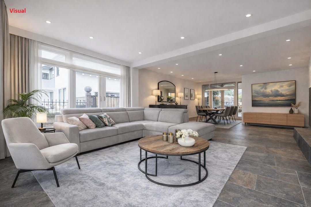 De woonkamer heeft een gashaard en dubbele deuren naar de tweede oprit. Aansluitend ligt de eetkamer, eveneens voorzien van dubbele deuren die toegang geven tot de sfeervolle overkapping en de achtertuin.