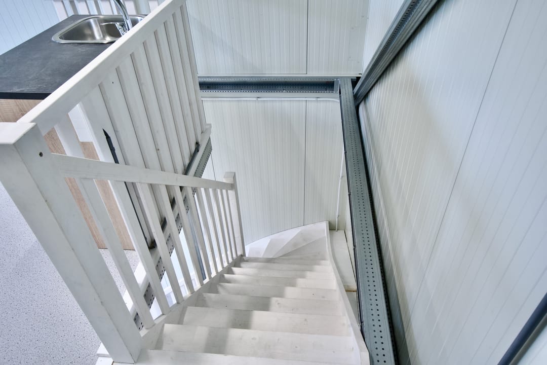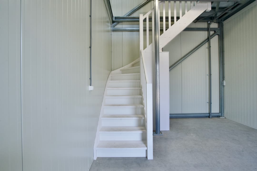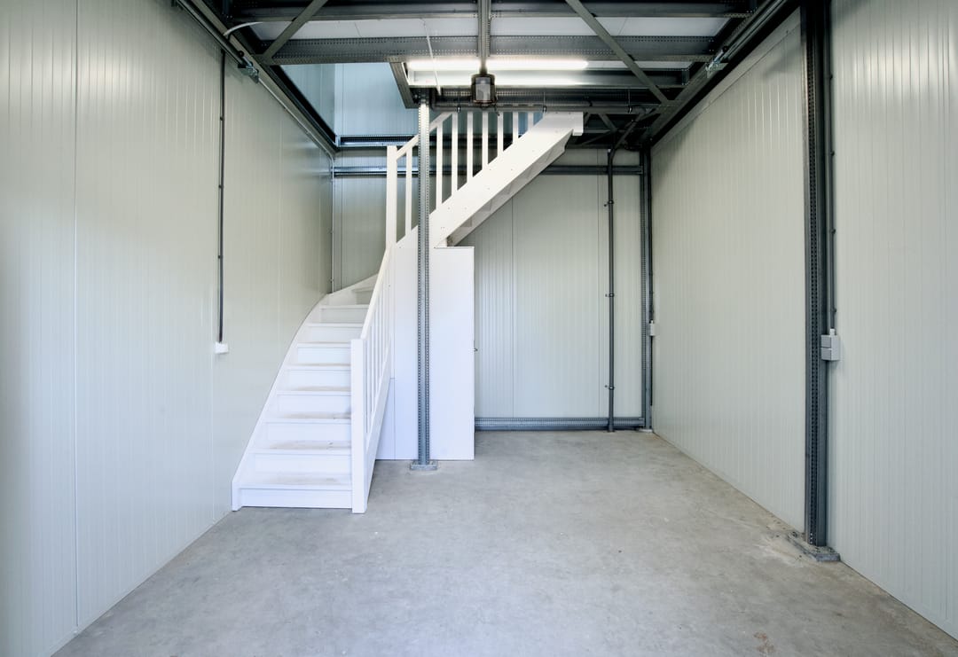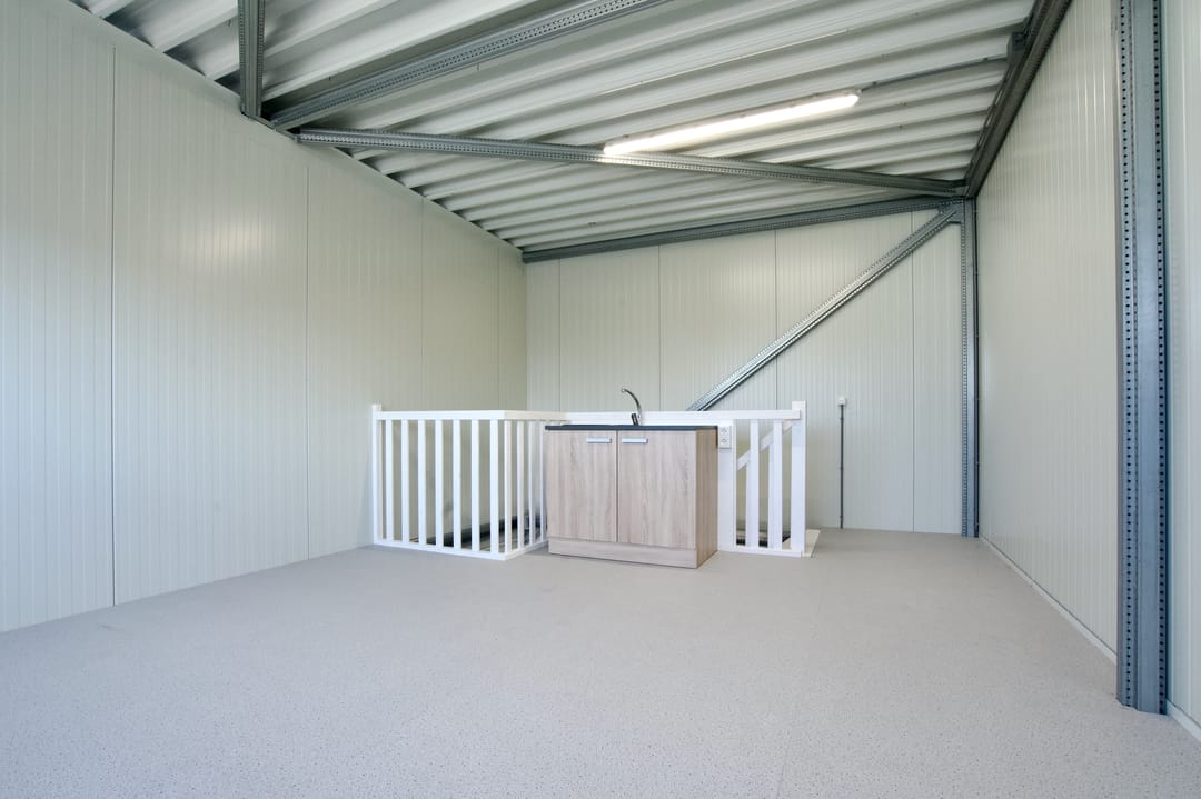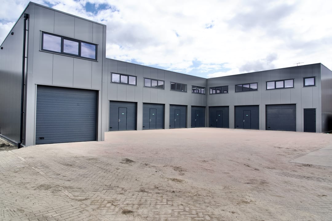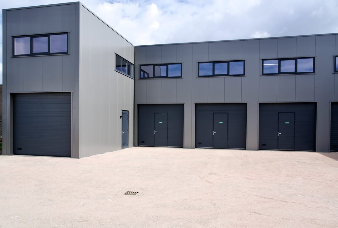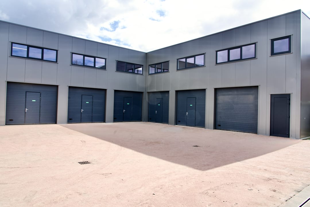 De units zijn uitstekend afgewerkt en duurzaam gebouwd met 10 cm dikke sandwichpanelen (Rc ± 4,5 m²K/W) en beschikken over een geïsoleerde, gevlinderde betonvloer. De oppervlakte is verdeeld over twee verdiepingen, beiden bereikbaar via een vaste trap — ideaal voor een combinatie van werkruimte, opslag en kantoor.