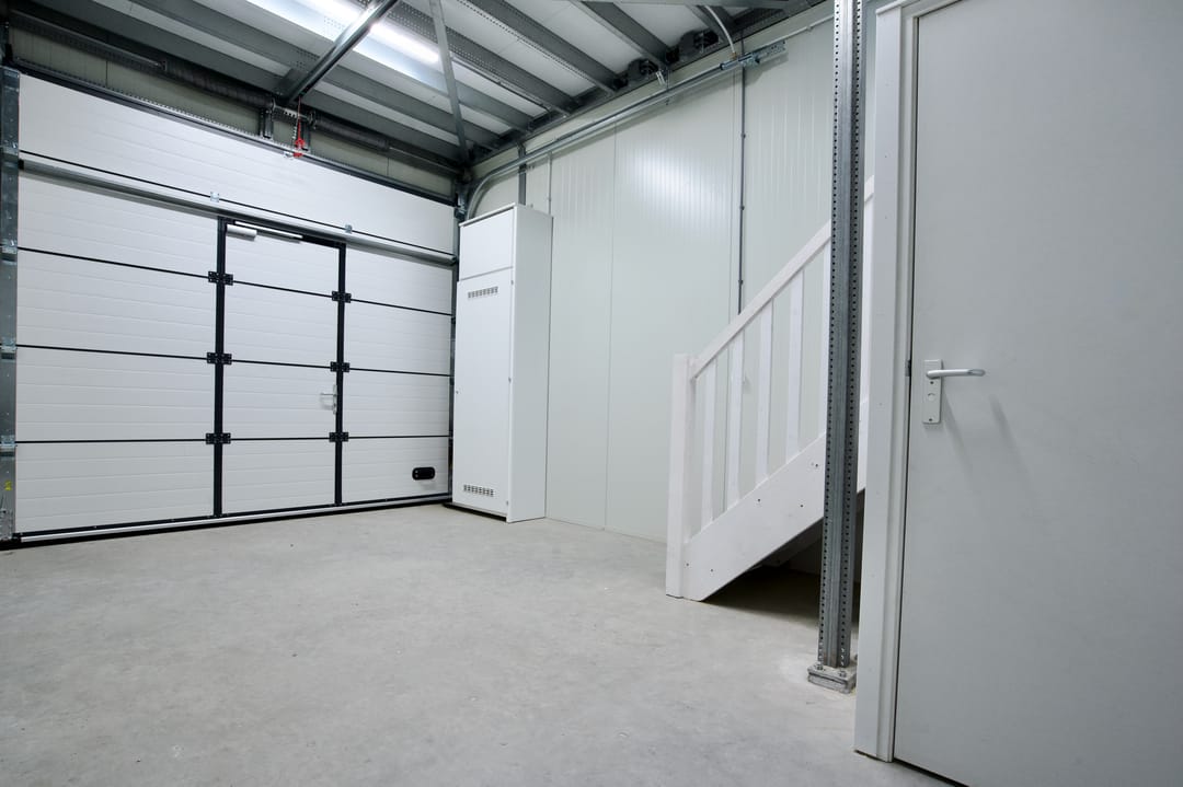 - Overheaddeuren, betonvloer, toilet, pantry en te openen ramen