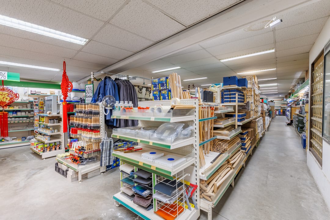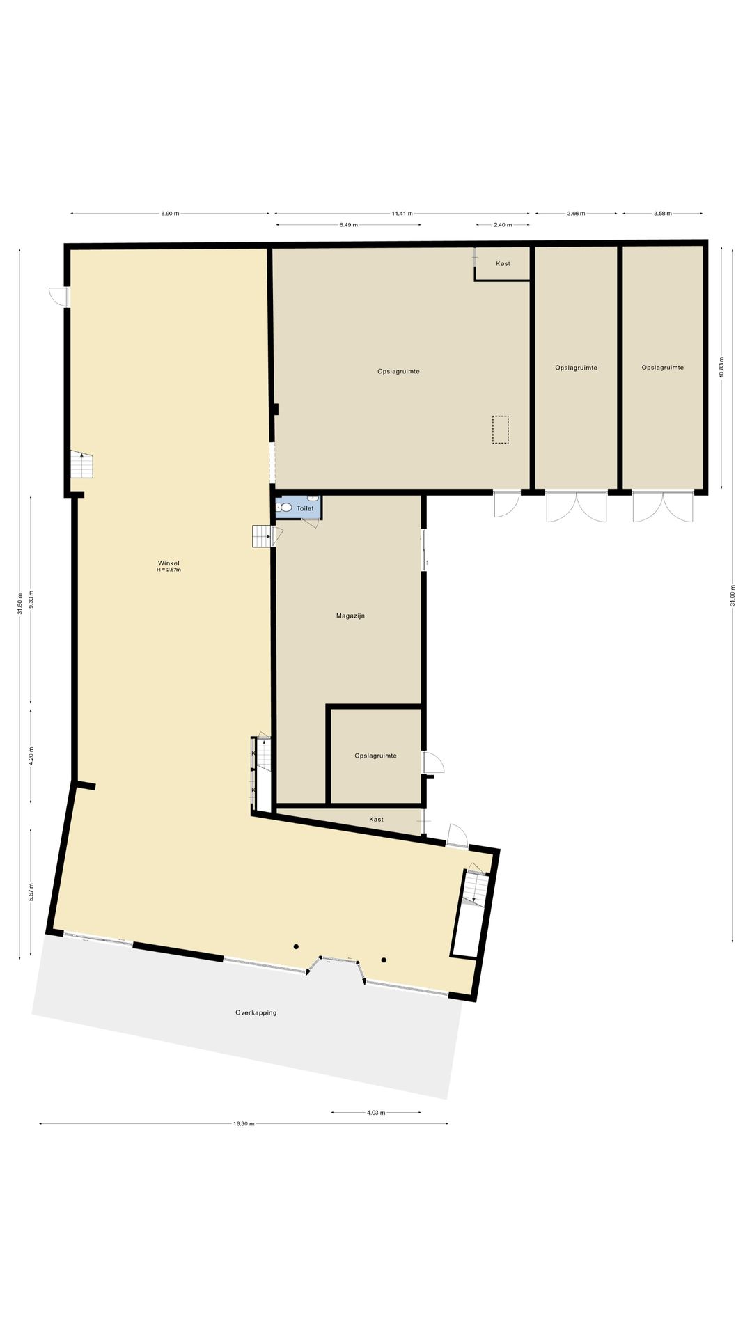 Winkelruimte, bedrijfsruimte-/opslagruimte onderverdeeld in een aantal compartimenten met diverse toegangsdeuren en een toiletruimte. In een gedeelte van de bedrijfsruimte is een houten entresolvloer aangebracht voor extra afzetruimte.