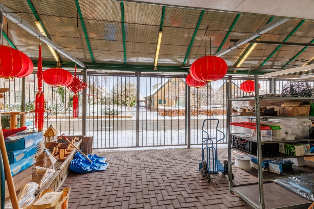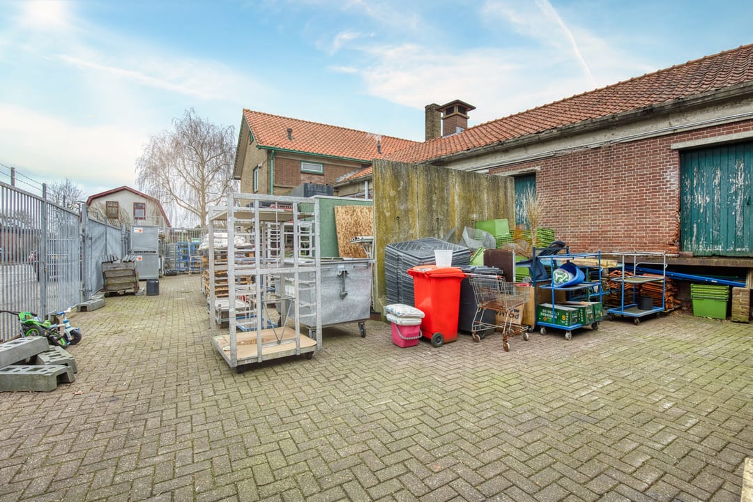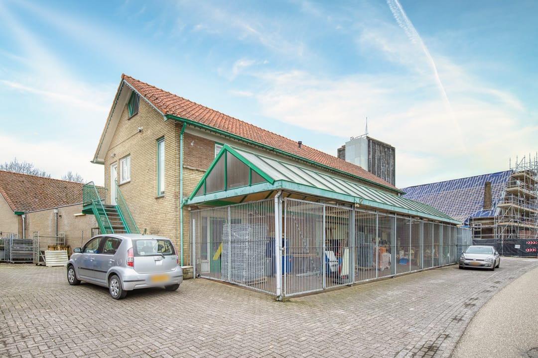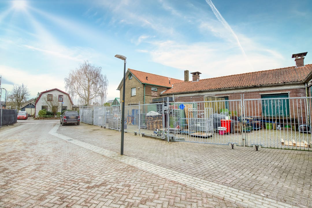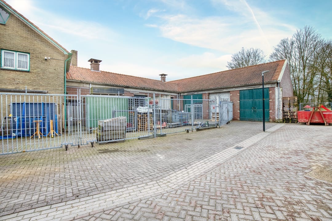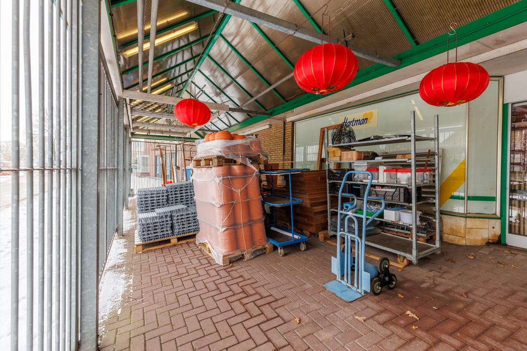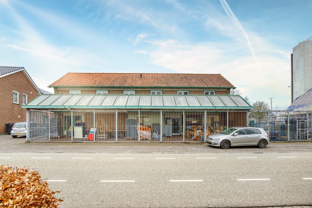De ruimte rondom het gebouw is verhard met klinkers. Een gedeelte van het perceel is afgezet met hekwerk en aan de voorzijde is een luifel aangebracht. Deze gedeelten zijn thans in gebruik als buitenopslag en een gedeelte is in gebruik voor parkeren.