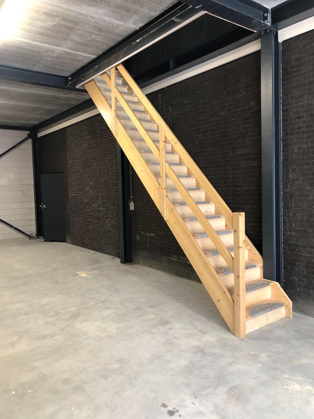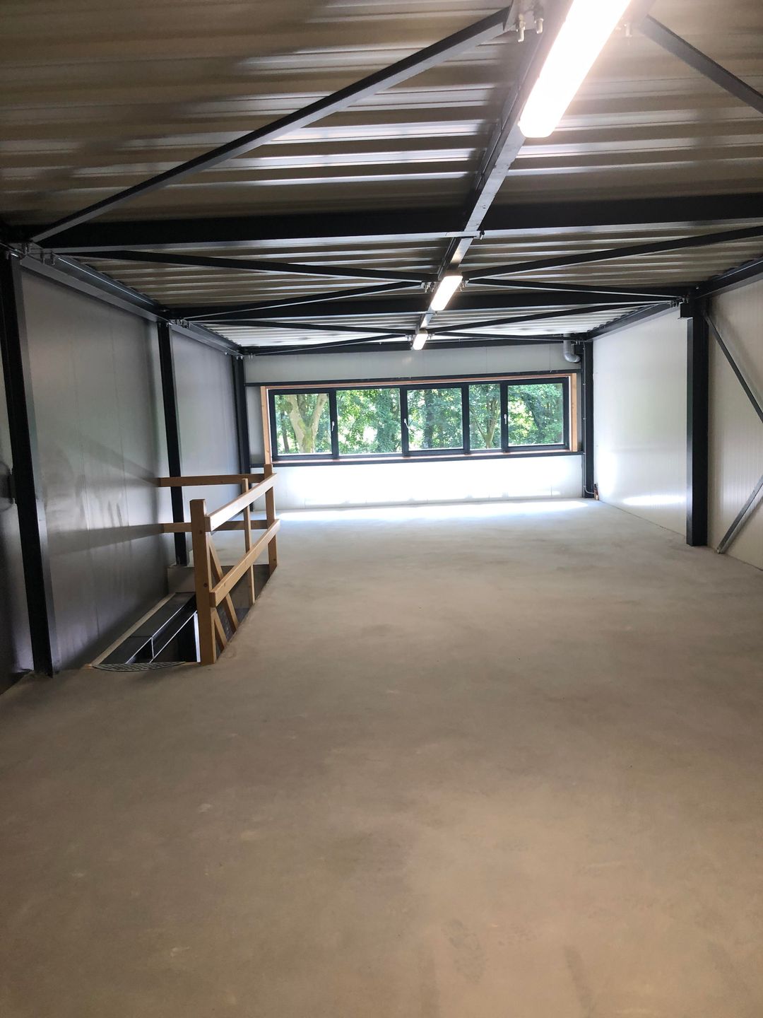 - De hoofdunit: Deze heeft een begane grond van ca. 80 m² en een verdieping van ca. 77 m². De benedenverdieping is een fijne, open werkruimte met een strakke betonvloer. Via een nette houten trap kom je op de bovenverdieping. Deze is dankzij de grote raampartij aan de voorzijde heerlijk licht en kijkt uit op het groen, wat het een ideale plek maakt voor een kantoor of extra opslag.