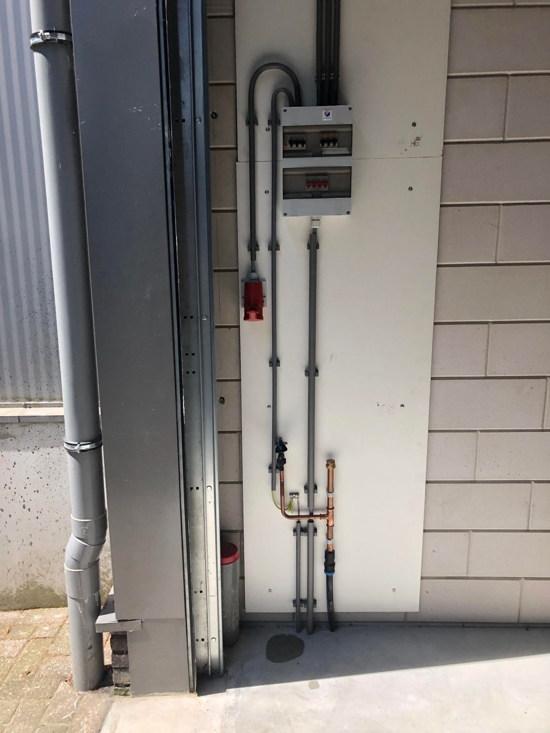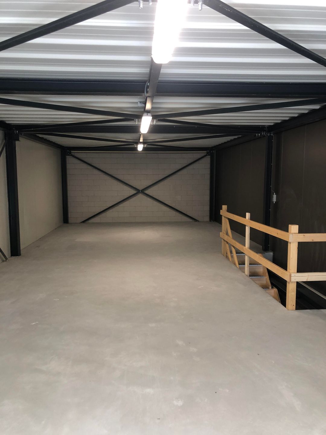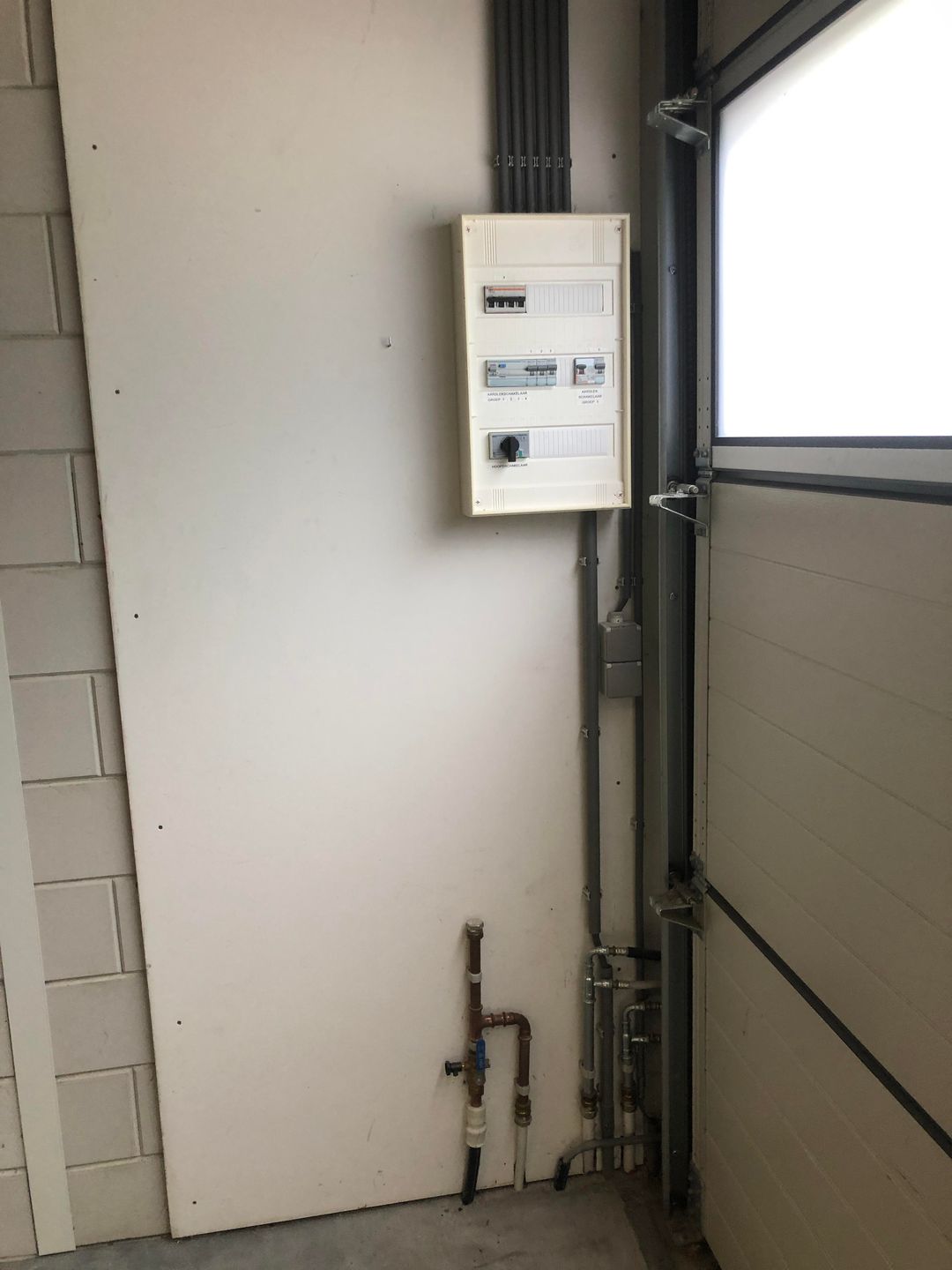 De ruimtes zijn instapklaar en van alle gemakken voorzien. Je komt binnen via de aparte loopdeur of de brede overheaddeur, die dankzij de glaspanelen voor prettig natuurlijk licht op de werkvloer zorgt. Binnen is de basis uitstekend geregeld: er is een complete meterkast met krachtstroom (3 x 25 A) voor zwaardere machines, een nette wateraansluiting en op beide verdiepingen hangt al goede verlichting. Je kunt hier dus eigenlijk direct aan de slag.