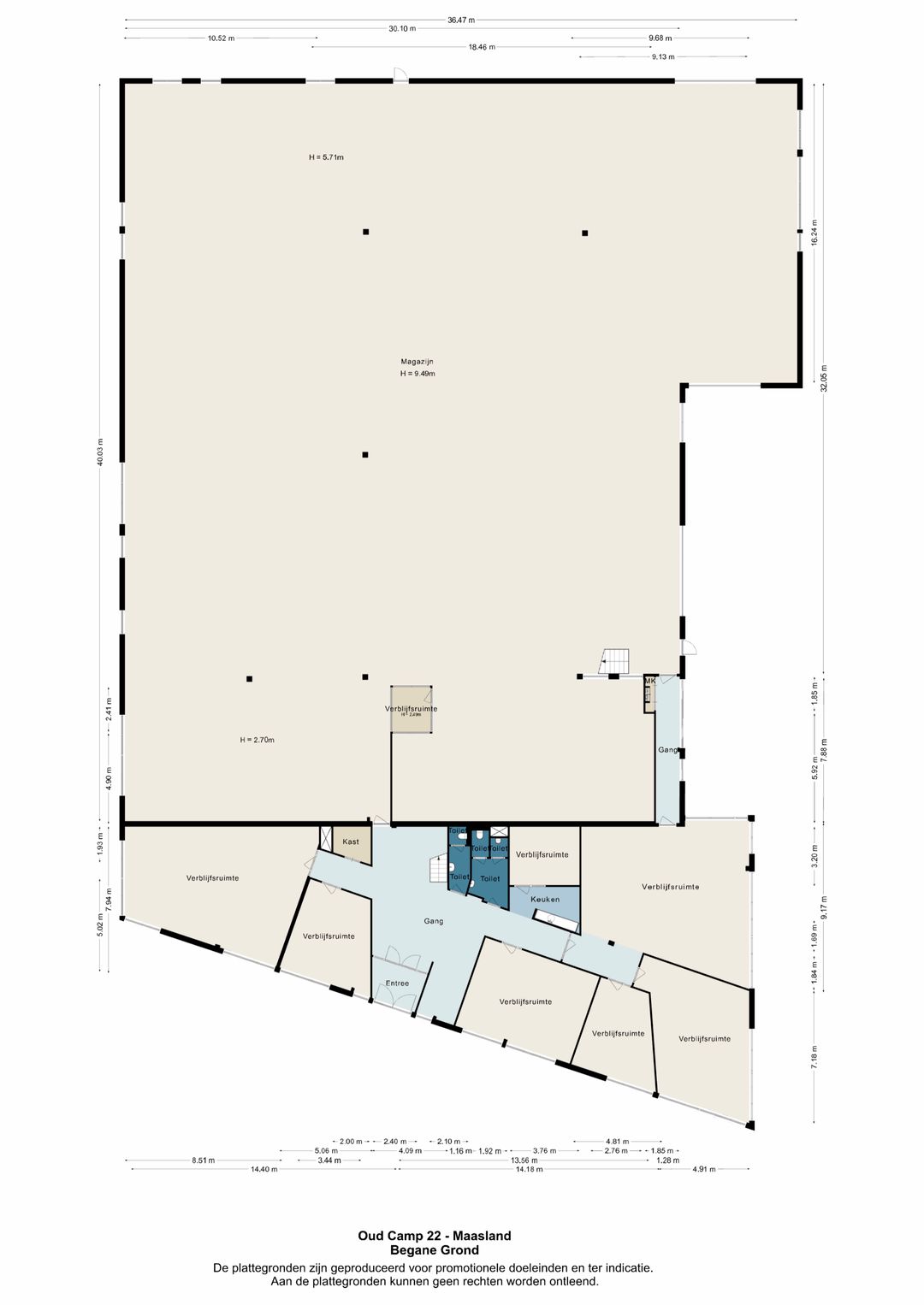 - vrije hoogte van 9,49 m1 onder spant;