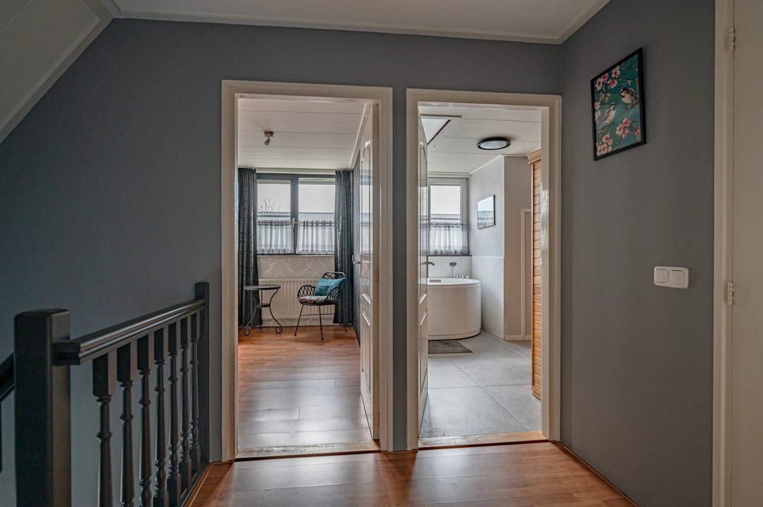 Entree/hal met trapopgang, meterkast (opstelling waterontharder) en trapopgang. Moderne toiletruimte (ca. 2023) met hangend spoeltoilet met afstandsbediening en wastafel. Vanuit de hal toegang tot een kantoorruimte, welke eventueel ook geschikt is voor het realiseren van een slaap- en badkamer op de begane grond.