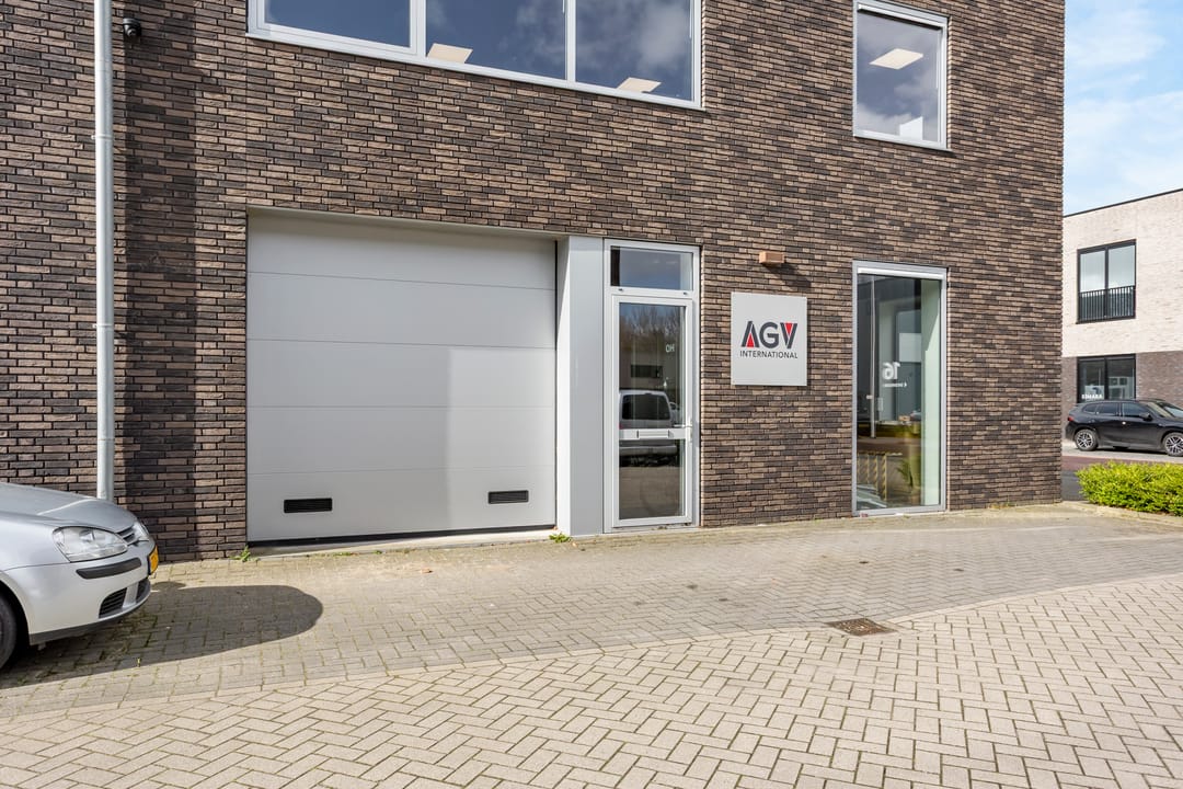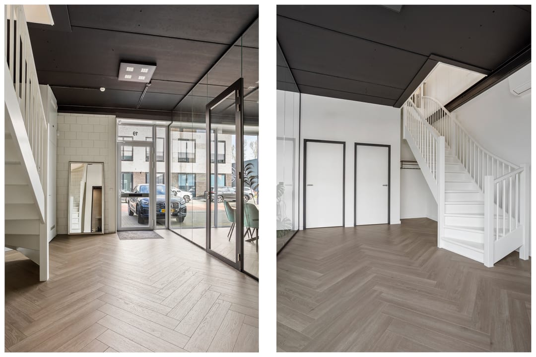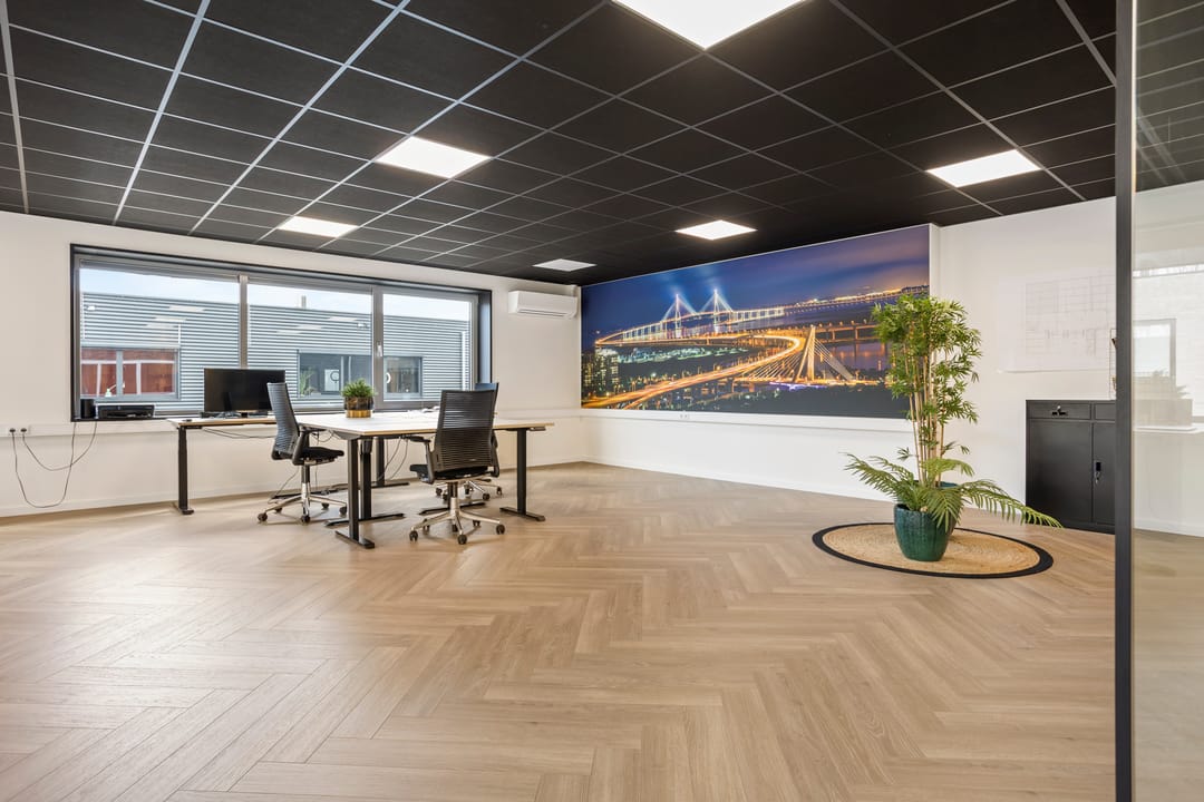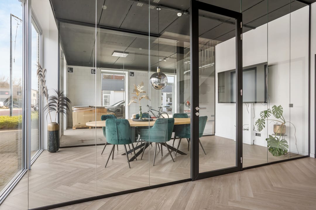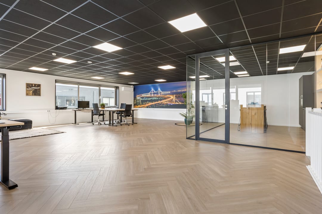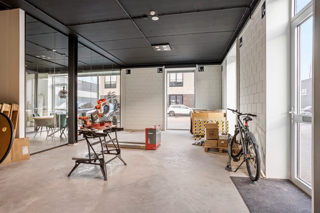 Bij binnenkomst tref je de hal met meterkast, alarminstallatie (met 2 camera's) en een nette toiletruimte voorzien van urinoir, wastafel en hangend toilet. Vanuit de hal is er toegang tot de bedrijfsruimte, die beschikt over een overheaddeur (ca. 3,03 m hoog en 2,99 m breed) en een vrije hoogte van circa 3,29 meter. Dit maakt de ruimte uitstekend geschikt voor opslag, werkplaats of logistieke doeleinden. Daarnaast is er op de begane grond een afgesloten vergaderruimte met glazen wanden, wat zorgt voor een open en professionele uitstraling. In de hal is airconditioning aanwezig.