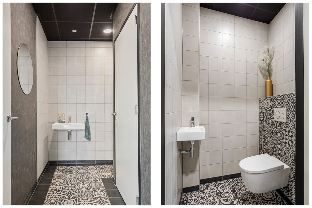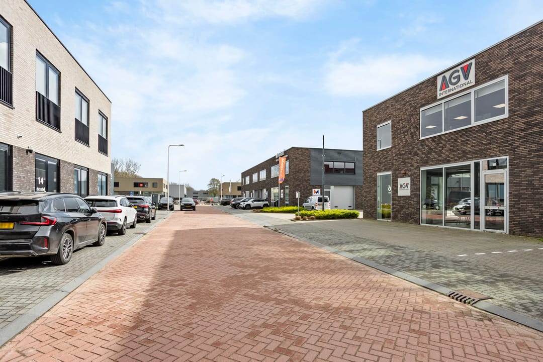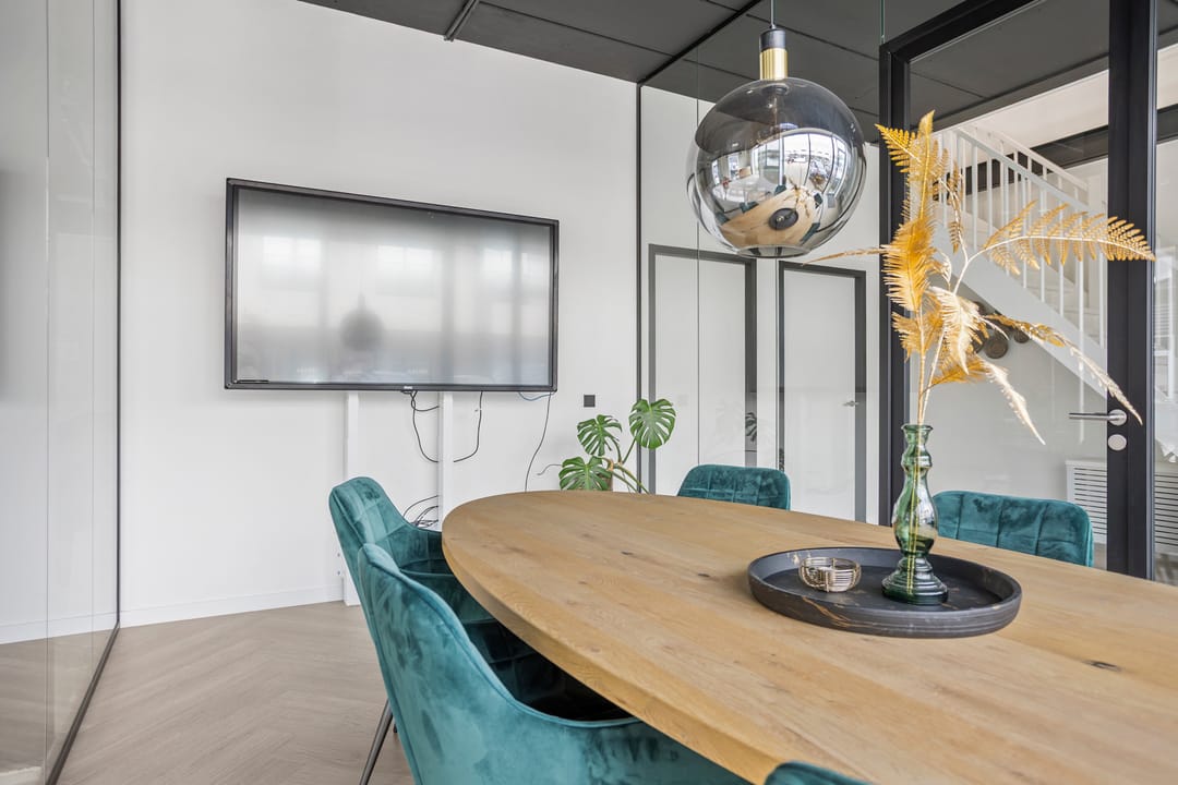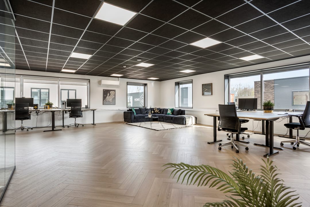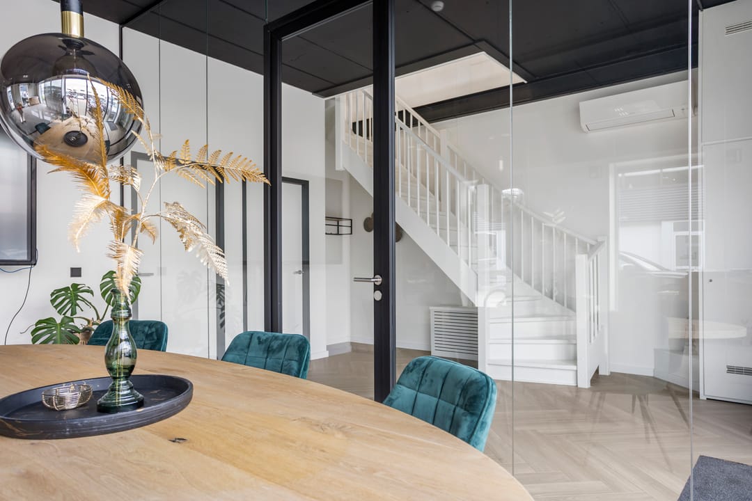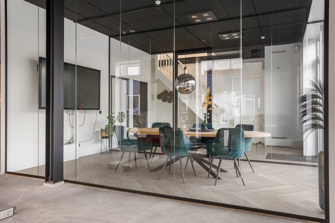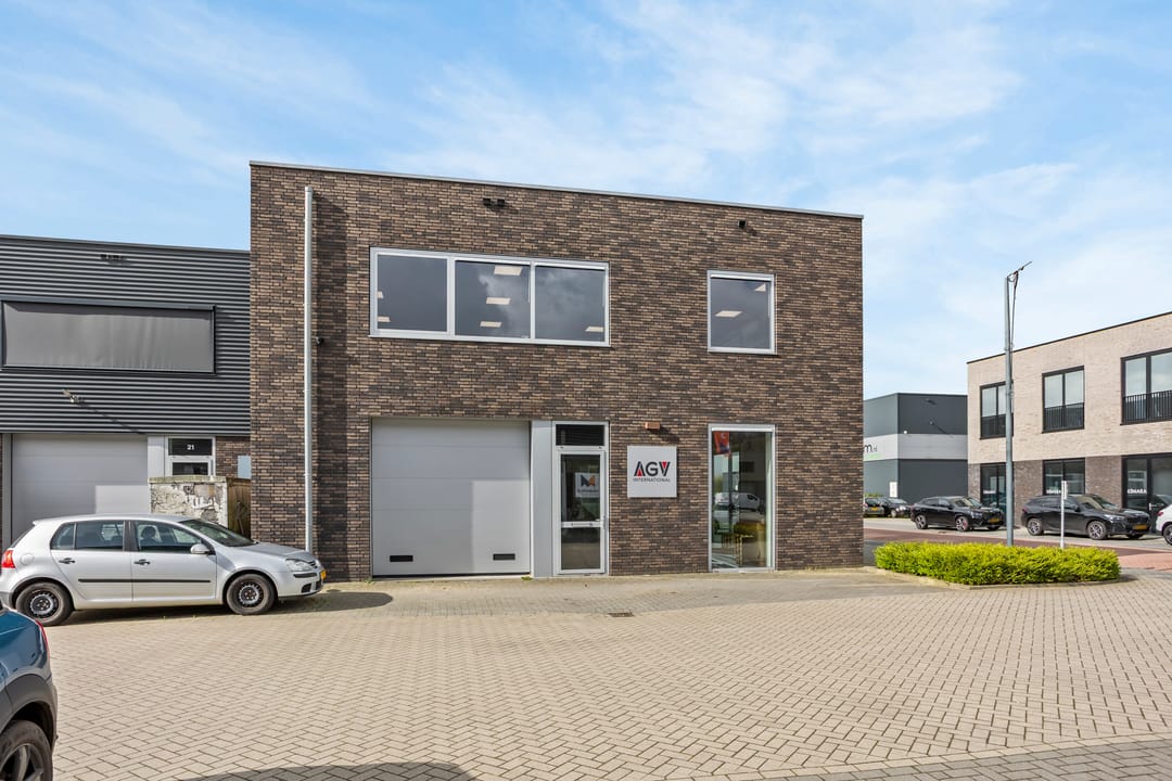 Bij binnenkomst tref je de hal met meterkast, alarminstallatie (met 2 camera's) en een nette toiletruimte voorzien van urinoir, wastafel en hangend toilet. Vanuit de hal is er toegang tot de bedrijfsruimte, die beschikt over een overheaddeur (ca. 3,03 m hoog en 2,99 m breed) en een vrije hoogte van circa 3,29 meter. Dit maakt de ruimte uitstekend geschikt voor opslag, werkplaats of logistieke doeleinden. Daarnaast is er op de begane grond een afgesloten vergaderruimte met glazen wanden, wat zorgt voor een open en professionele uitstraling. In de hal is airconditioning aanwezig.