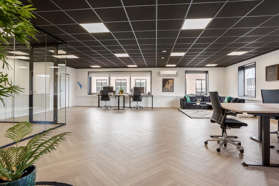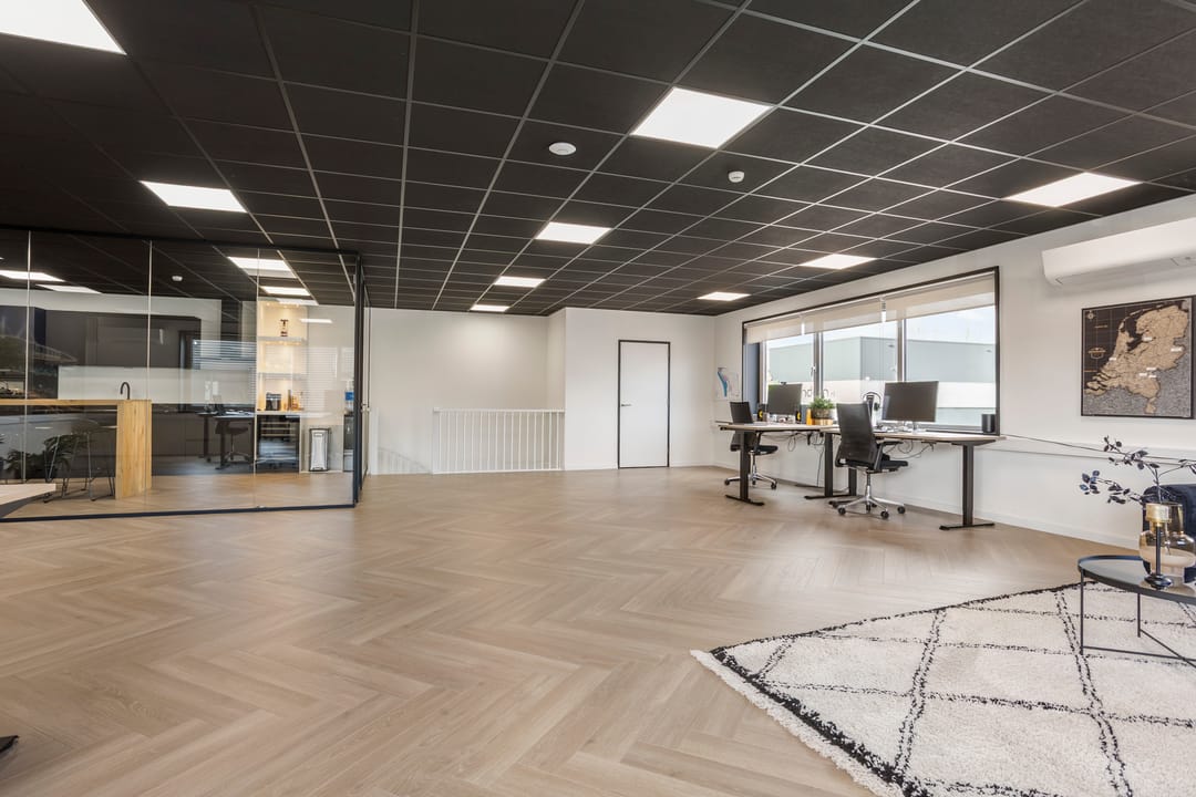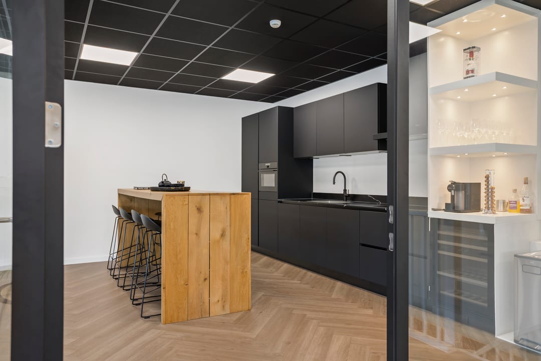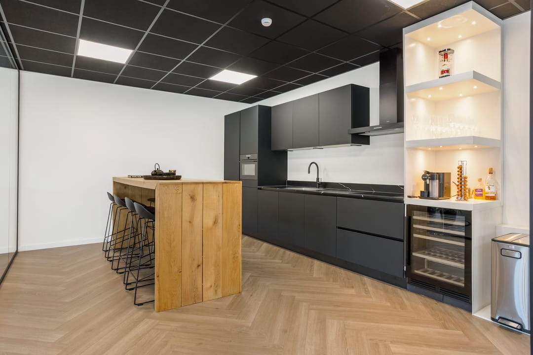 De eerste verdieping is ingericht als kantoorruimte en kenmerkt zich door de lichte en open opzet. De ruimte is voorzien van een laminaatvloer, strak gestucte wanden en een systeemplafond. De pantry met glazen wanden vormt een centraal punt op de verdieping en beschikt over diverse inbouwapparatuur, waaronder een koel-/vriescombinatie, combi-oven, keramische kookplaat, afzuigkap en een wijnklimaatkast. Verder is er een technische kast aanwezig met de omvormer voor de 10 zonnepanelen. De verdieping is voorzien van airconditioning (met uitzondering van de unit in de hoek welke niet werkt).