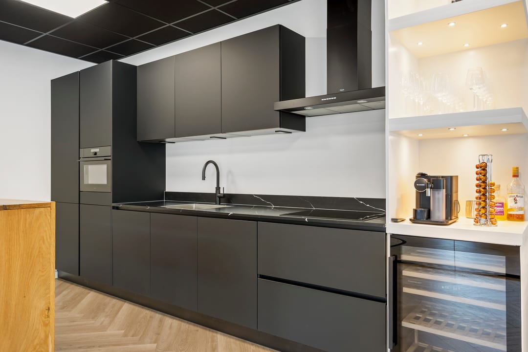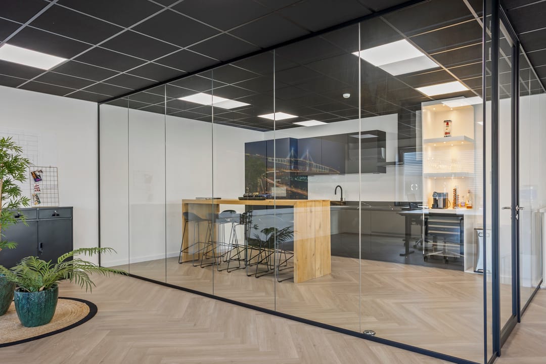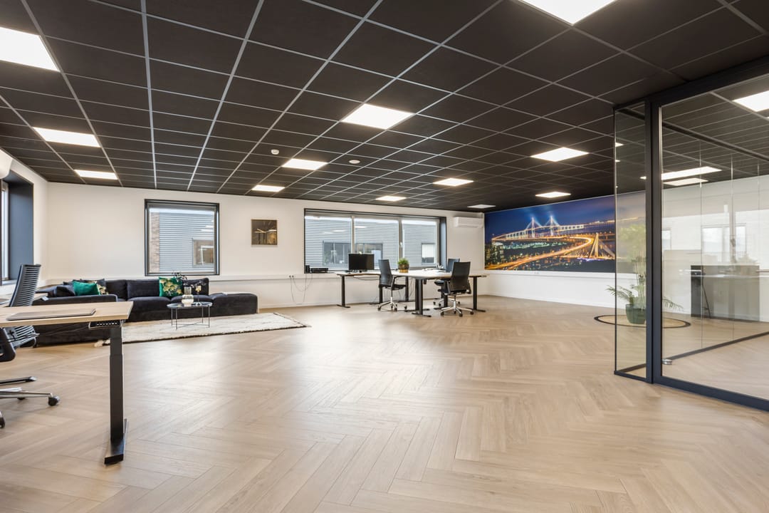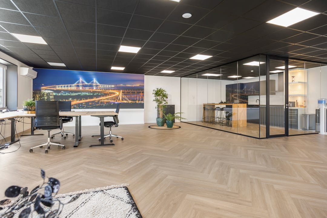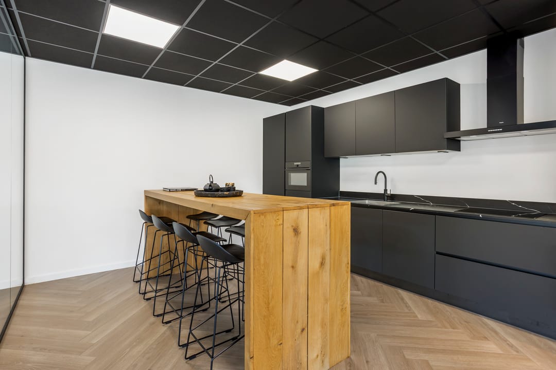 De eerste verdieping is ingericht als kantoorruimte en kenmerkt zich door de lichte en open opzet. De ruimte is voorzien van een laminaatvloer, strak gestucte wanden en een systeemplafond. De pantry met glazen wanden vormt een centraal punt op de verdieping en beschikt over diverse inbouwapparatuur, waaronder een koel-/vriescombinatie, combi-oven, keramische kookplaat, afzuigkap en een wijnklimaatkast. Verder is er een technische kast aanwezig met de omvormer voor de 10 zonnepanelen. De verdieping is voorzien van airconditioning (met uitzondering van de unit in de hoek welke niet werkt).