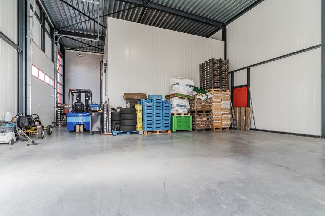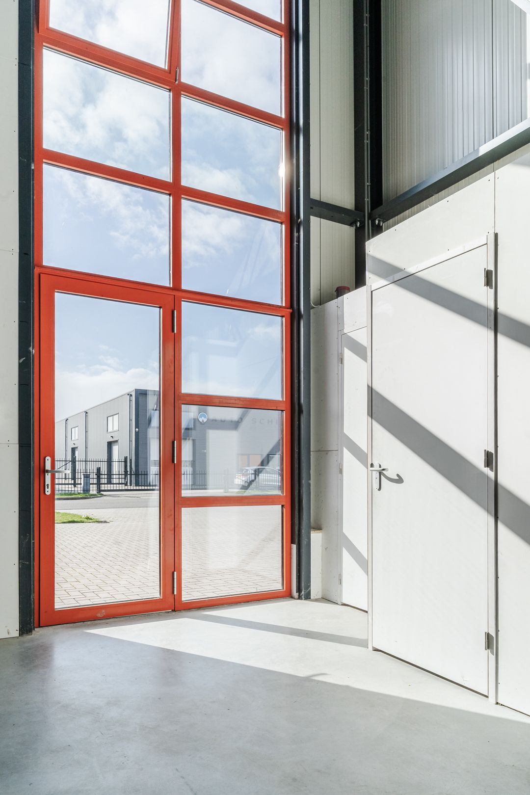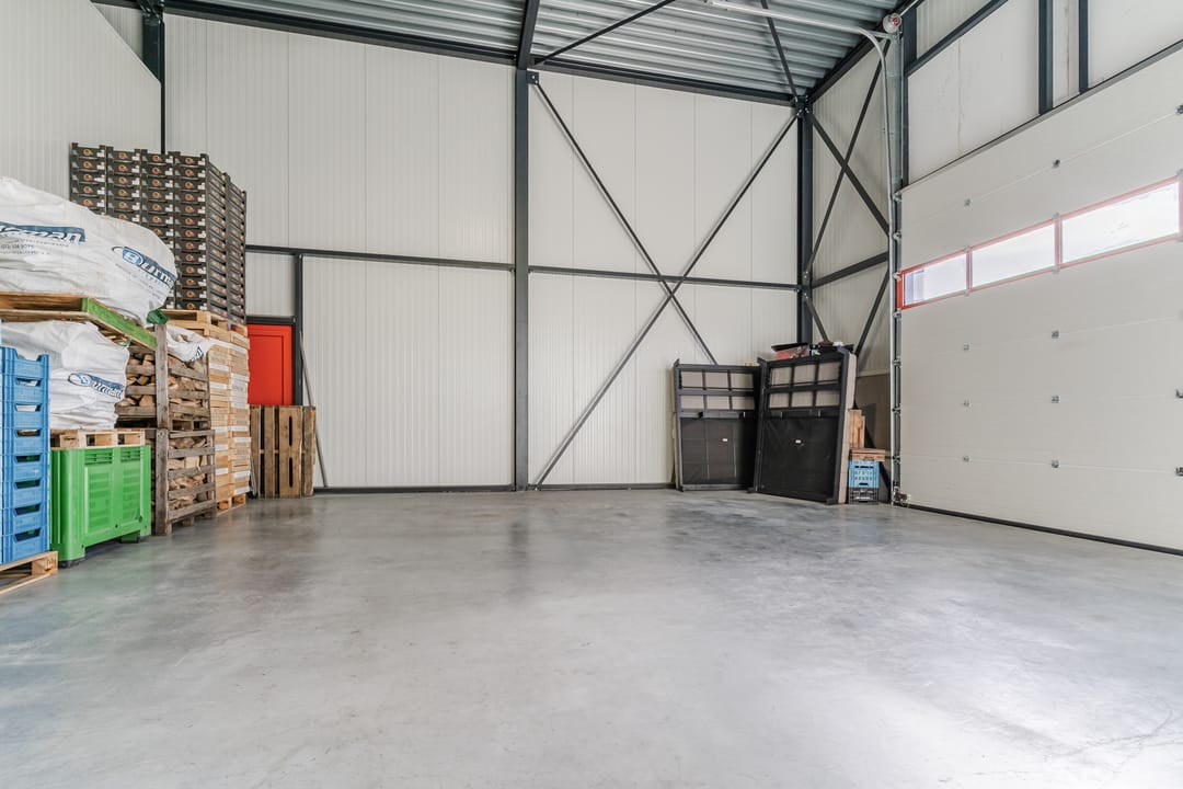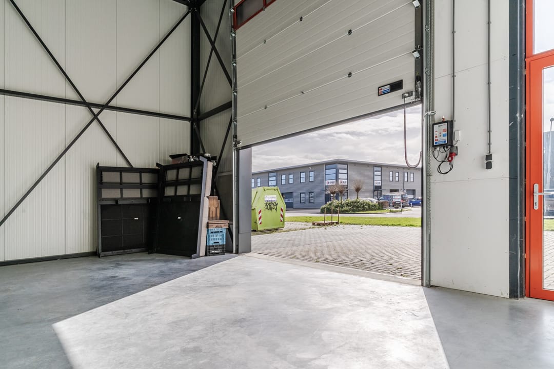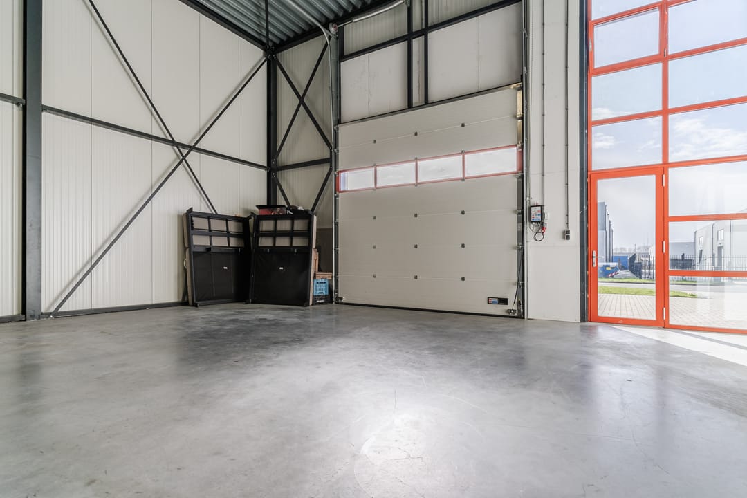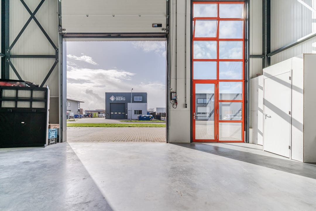 Entree via een loopdeur en overheaddeur, met toegang tot de open bedrijfsruimte. De vrije hoogte in de bedrijfsruimte bedraagt ca. 6.25m.