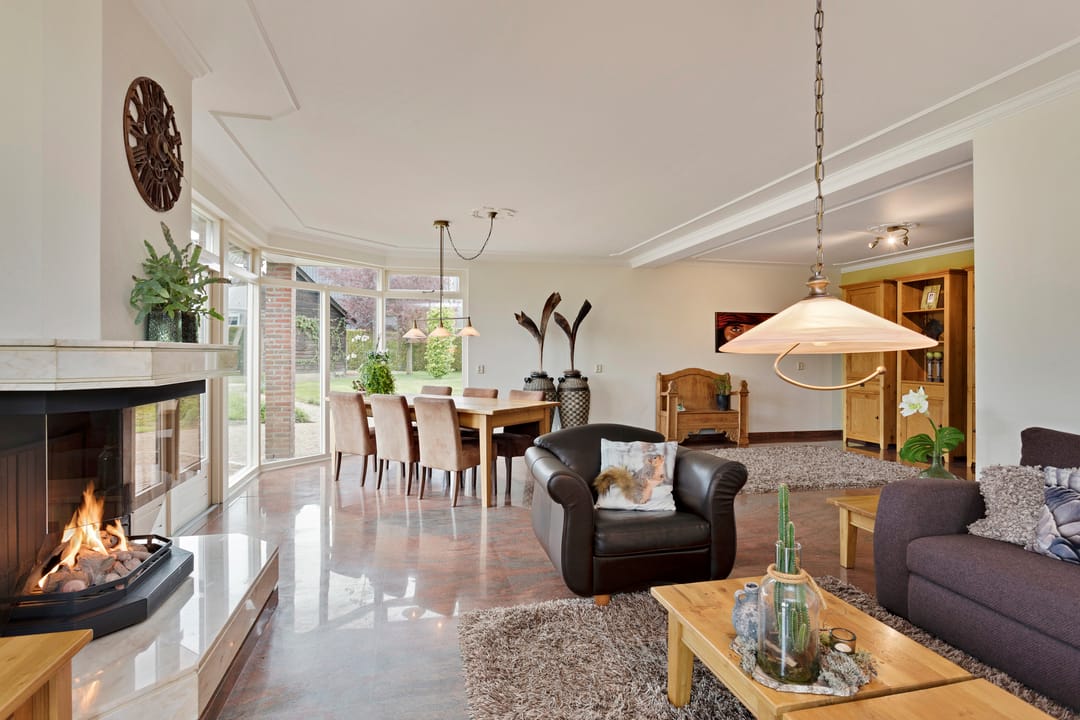De royale woonkamer is volledig gericht op de tuin. Dankzij de kamerhoge raampartijen en openslaande deuren geniet u hier van een maximale lichtinval. De geïntegreerde gashaard vormt een sfeervol middelpunt in deze lichte ruimte.