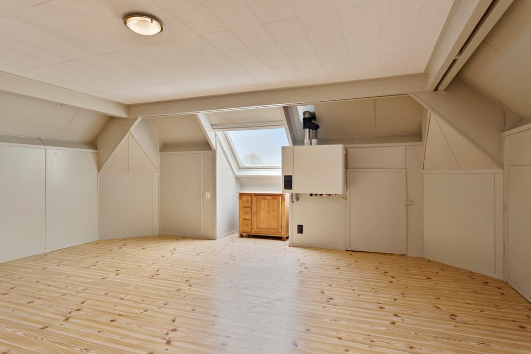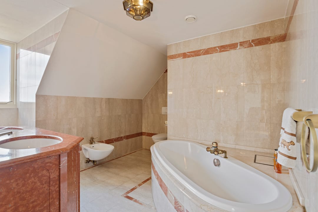 De verdieping telt vier ruime slaapkamers, waarbij de masterbedroom over een luxe ensuite badkamer beschikt. Drie kamers geven directe toegang tot het beschutte balkon. Beide badkamers zijn afgewerkt met hoogwaardig natuursteen voor een tijdloze uitstraling. Via een vaste trap bereikt u de riante zolder. Deze lichte ruimte is perfect bruikbaar als extra werkruimte, atelier of hobbykamer.