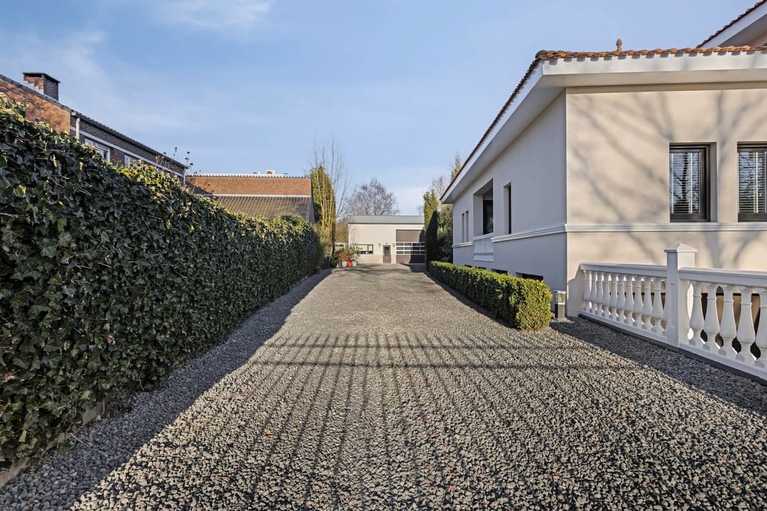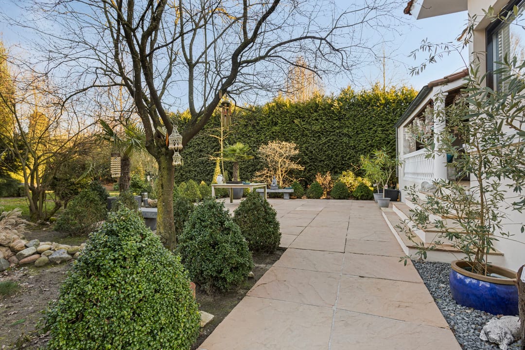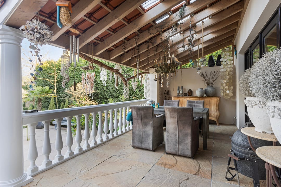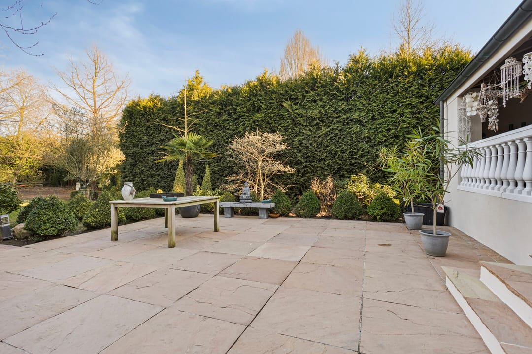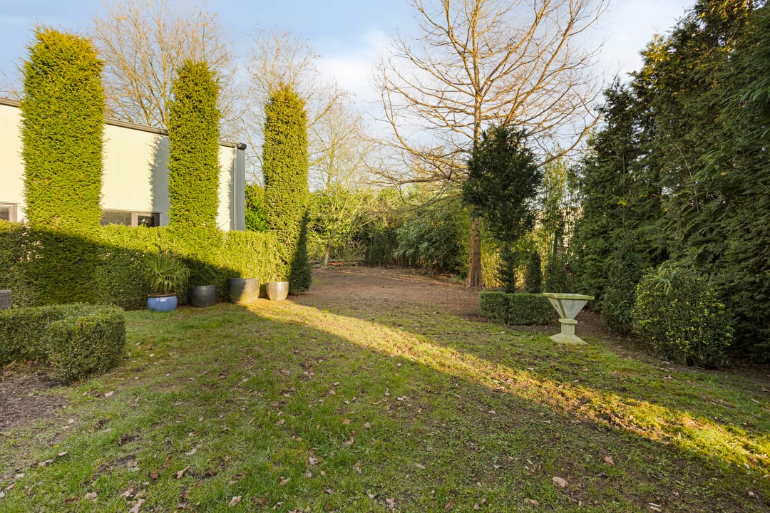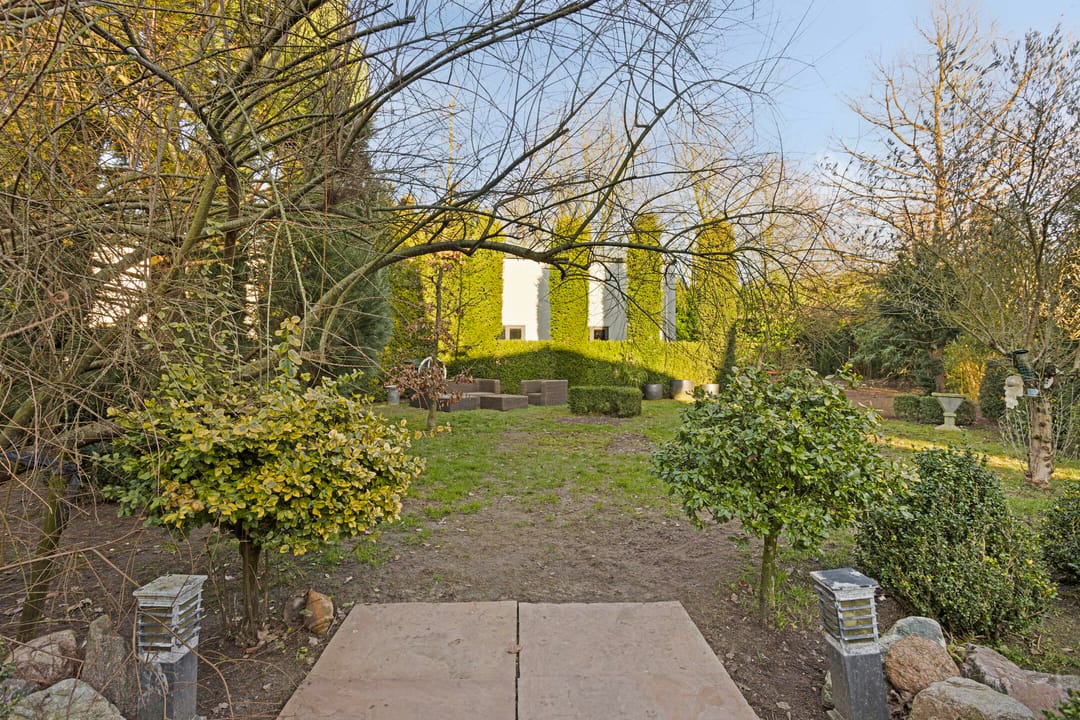 De achtertuin is royaal, groen en biedt volledige privacy. Direct aan de woning bevindt zich een sfeervol overdekt terras met mediterrane balustrade. Via een trap bereikt u een lagergelegen terras, omgeven door groenblijvende beplanting. Verderop ligt een verzorgd gazon met sierhaag en een intieme zithoek – een heerlijke plek om in alle rust te genieten.