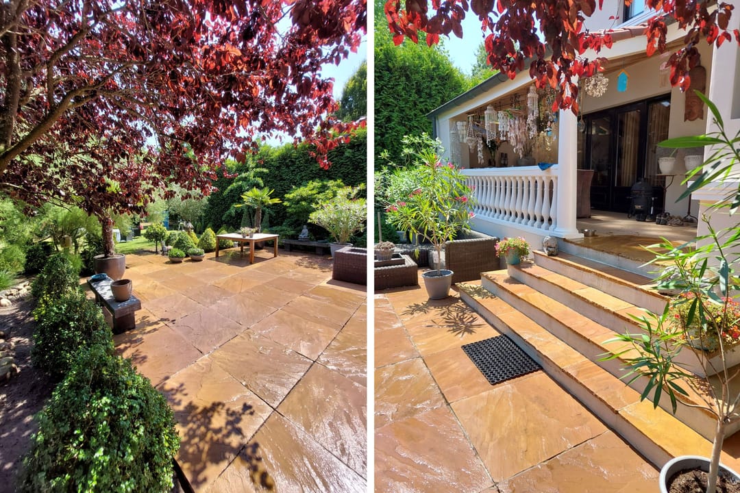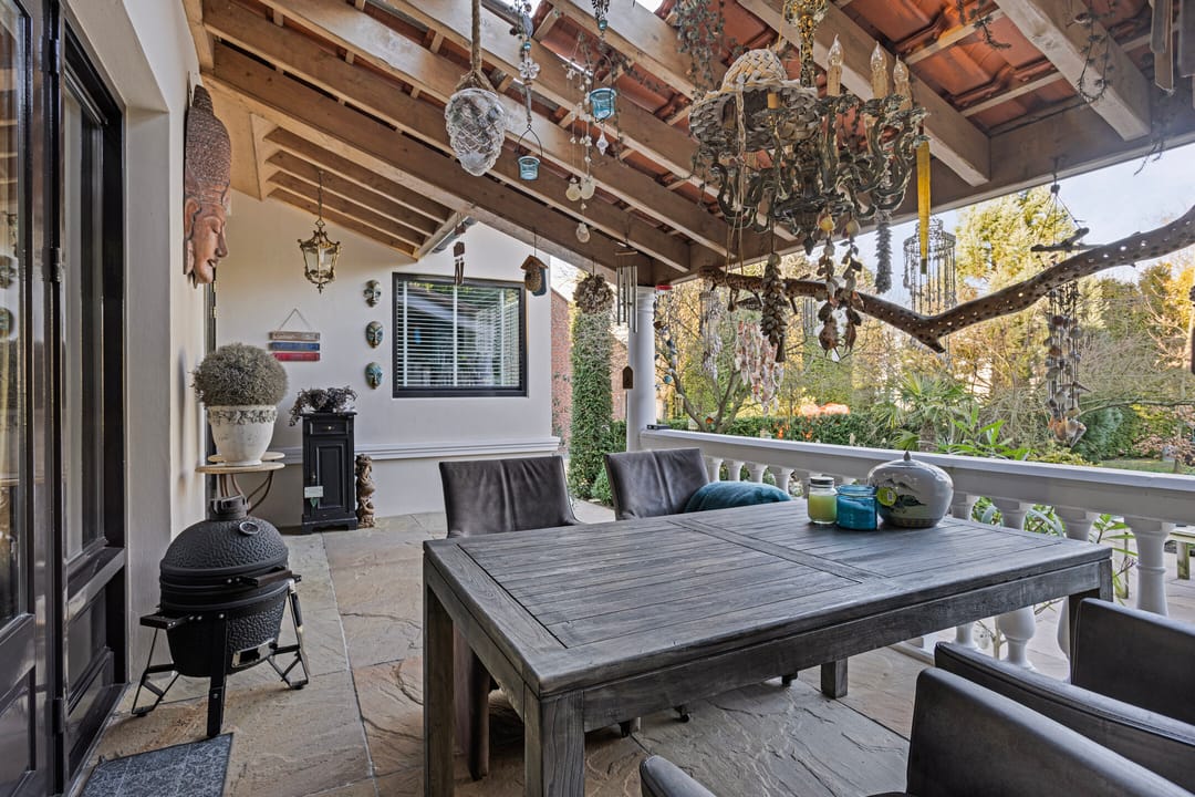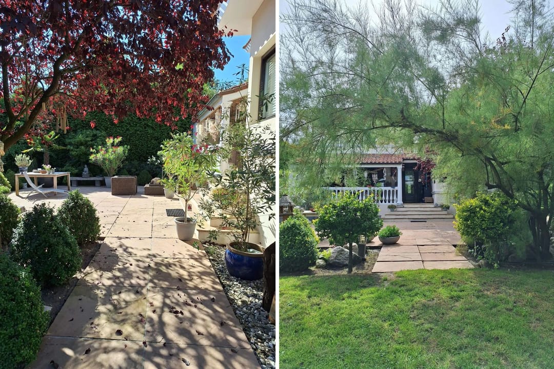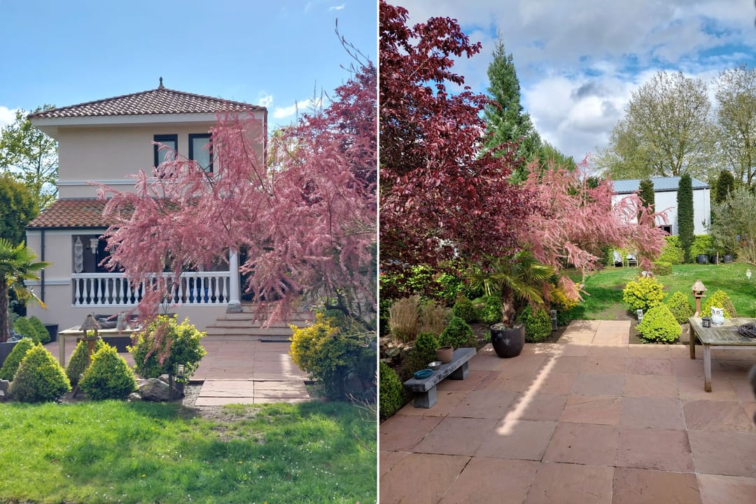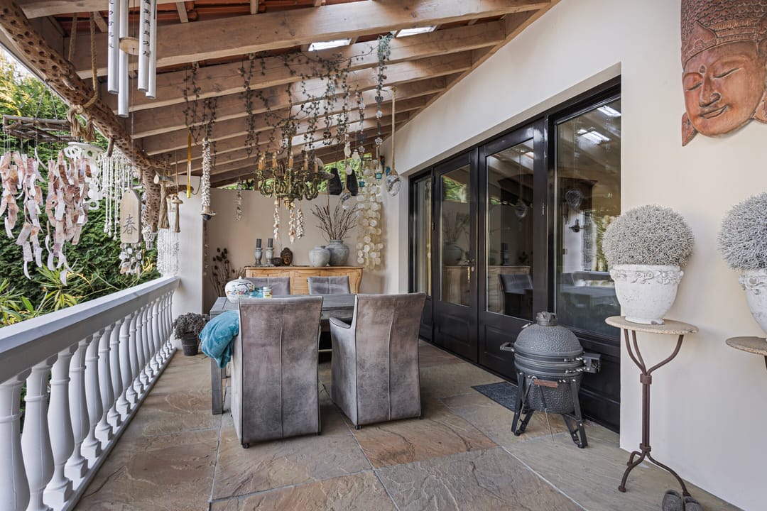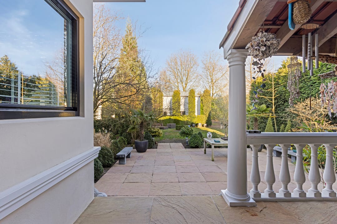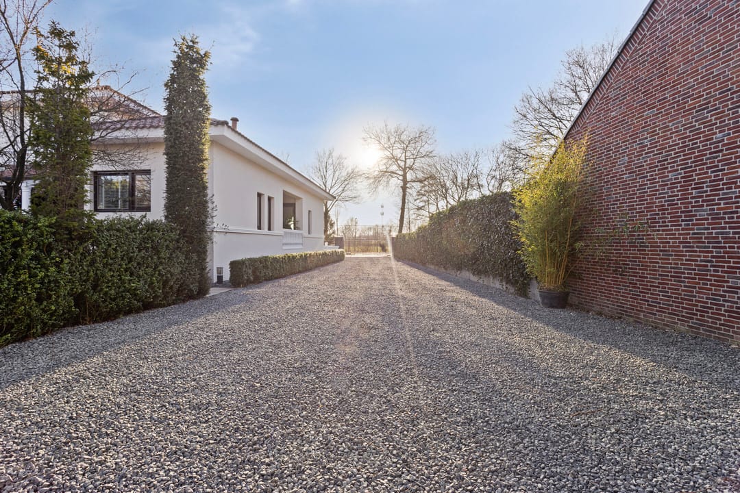 De achtertuin is royaal, groen en biedt volledige privacy. Direct aan de woning bevindt zich een sfeervol overdekt terras met mediterrane balustrade. Via een trap bereikt u een lagergelegen terras, omgeven door groenblijvende beplanting. Verderop ligt een verzorgd gazon met sierhaag en een intieme zithoek – een heerlijke plek om in alle rust te genieten.