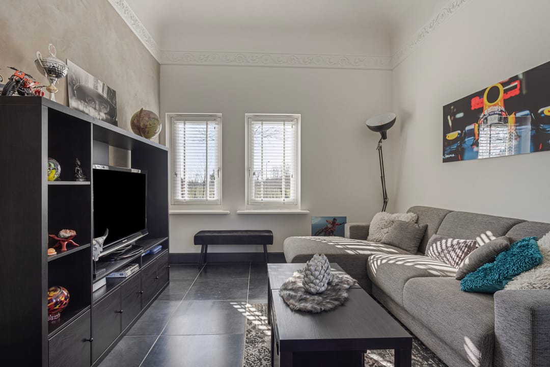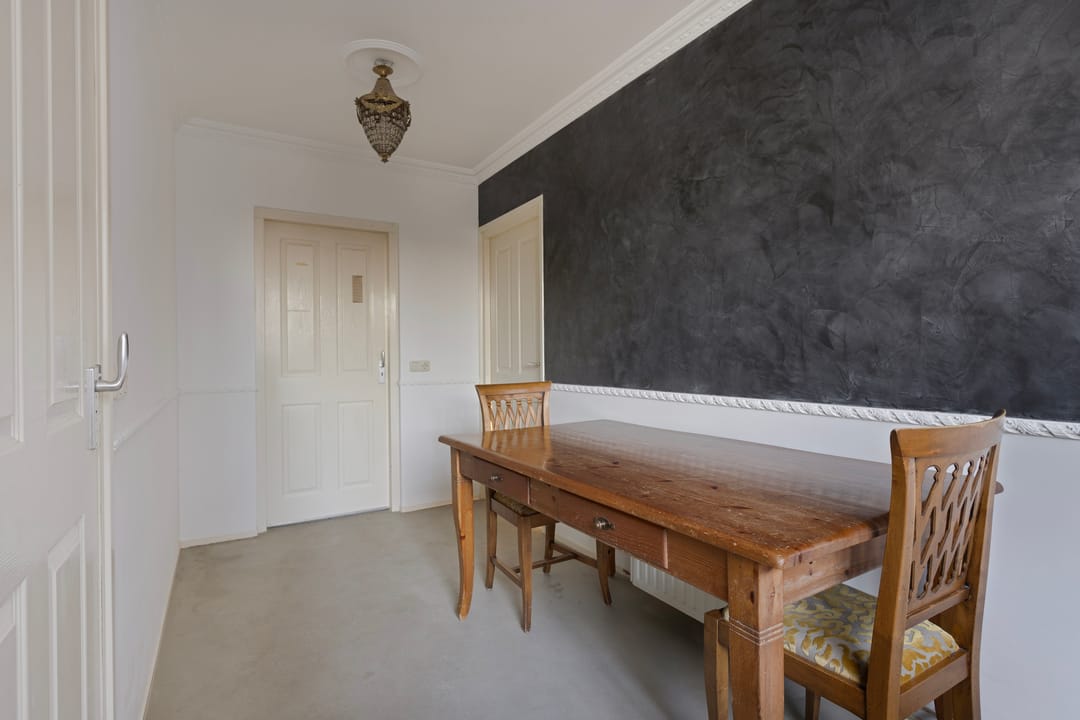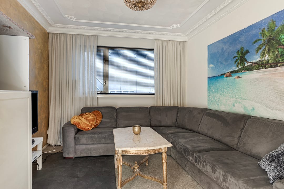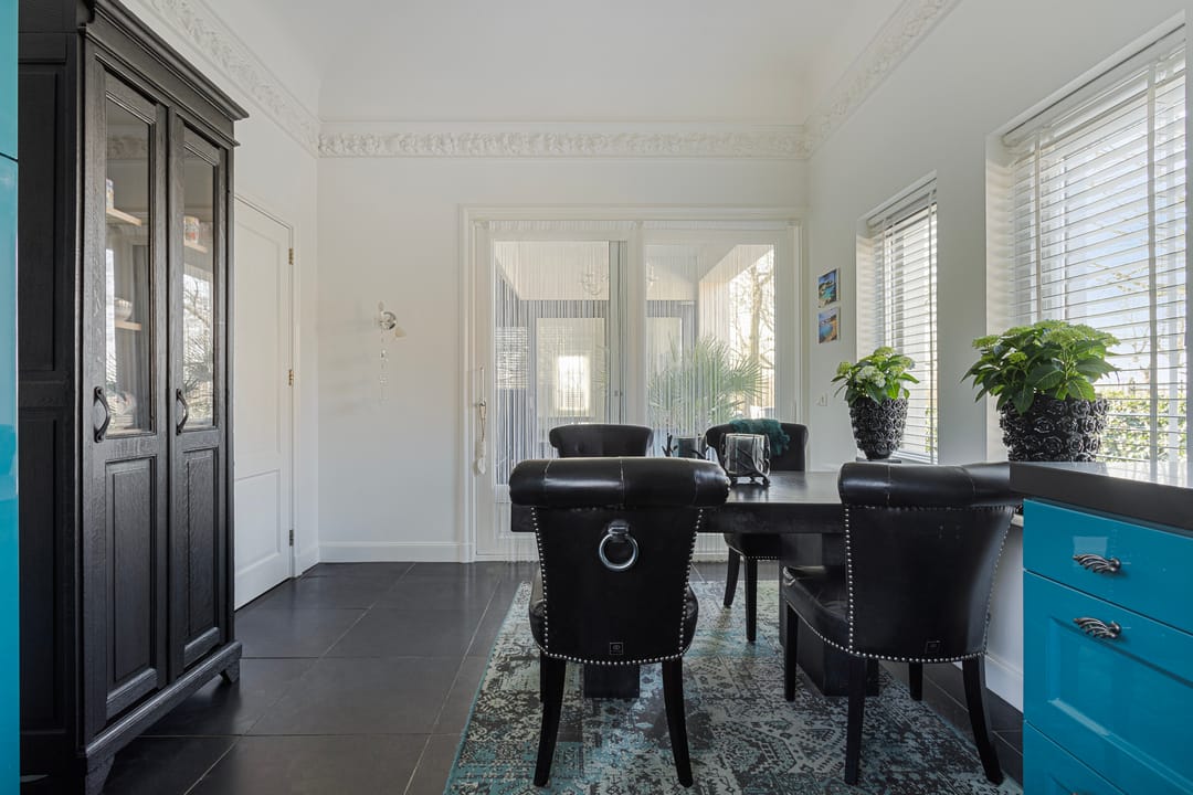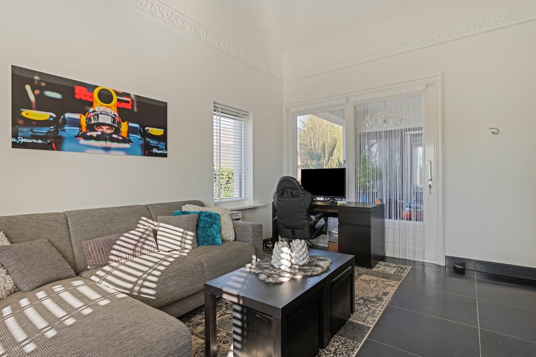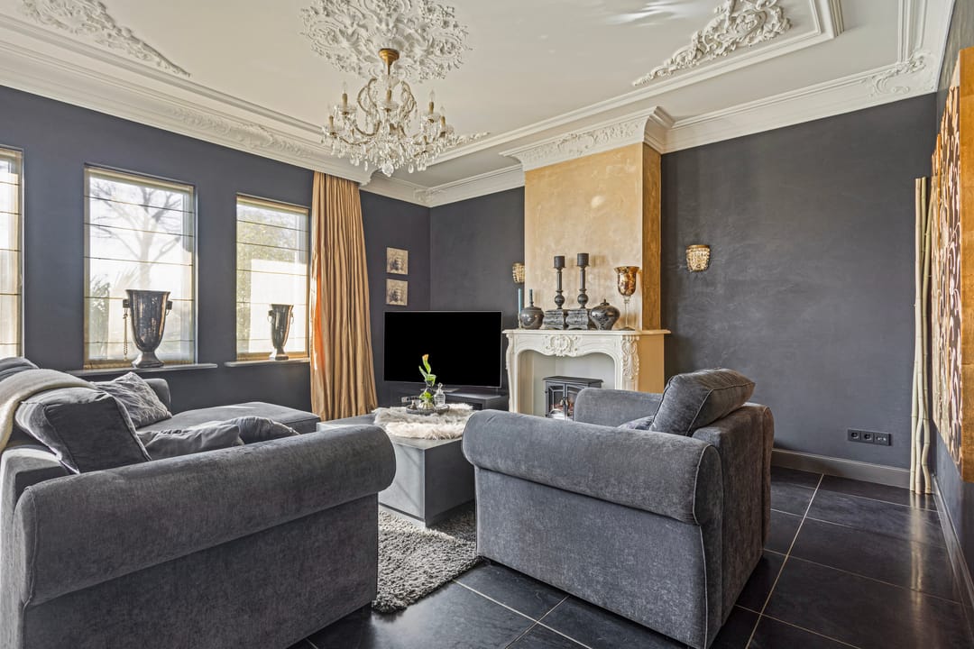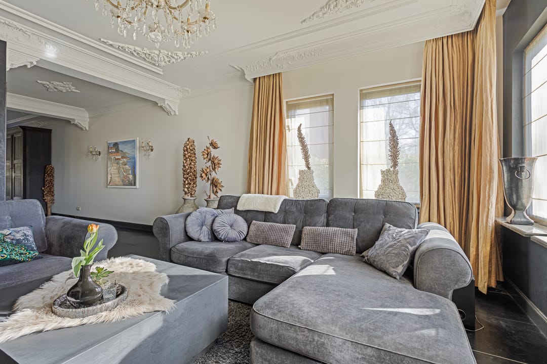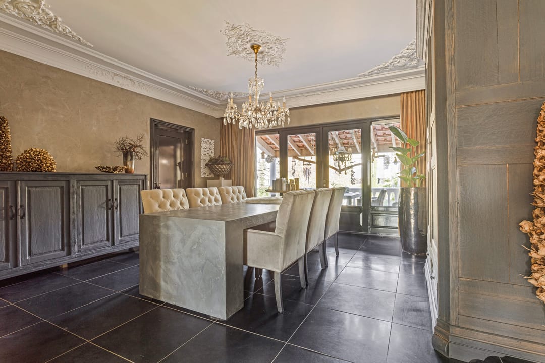 Aan de rechterzijde bevindt zich de bijzonder ruime U-vormige woonkamer, verdeeld in twee sfeervolle leefgedeelten. Aan de voorzijde ligt de elegante zitkamer met sfeerhaard en prachtig sierplafond. De achtergelegen eetkamer beschikt over openslaande deuren naar het overdekte terras waar u kunt genieten van optimale privacy.