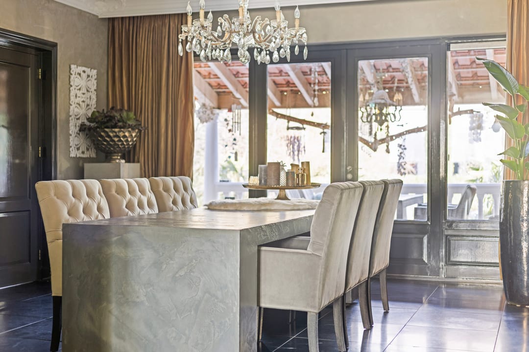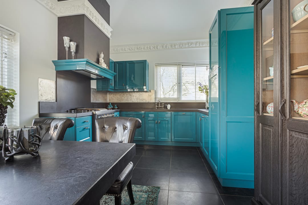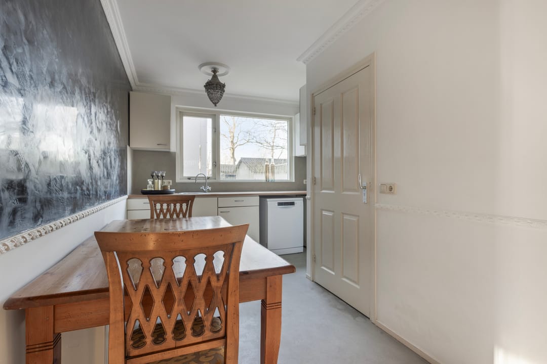 Aan de linkerzijde van de hal treft u een multifunctionele ruimte die uitstekend dienst kan doen als kantoor of slaapkamer, met directe toegang tot de patio via een schuifpui. De royale woonkeuken sluit hier naadloos op aan en is eveneens voorzien van een schuifpui naar de patio. De keuken is uitgerust met een Boretti fornuis met oven en grillplaat, granieten werkblad, koelkast en afzuigkap. Er is ruimschoots plaats voor een eethoek met uitzicht op de patio.