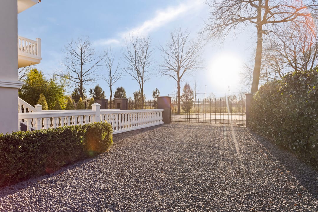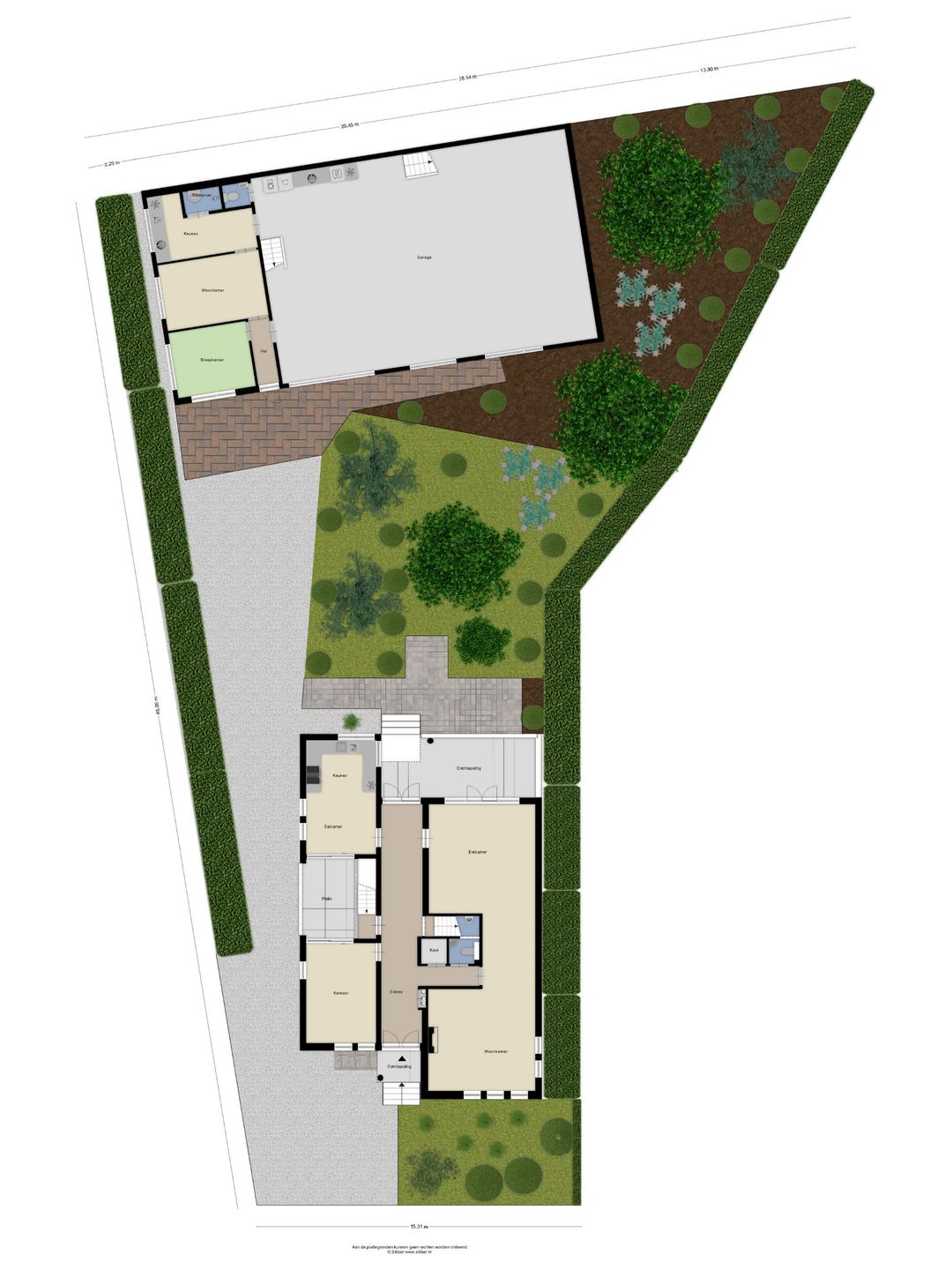De voortuin is fraai aangelegd met een stijlvol tegelpad richting de entree en diverse groene accenten zoals een palmboom en bonte buxus. Via de hellingbaan bereikt u direct de inpandige garage.